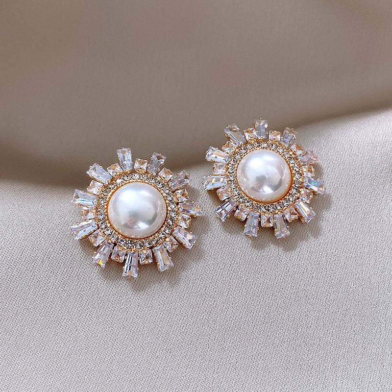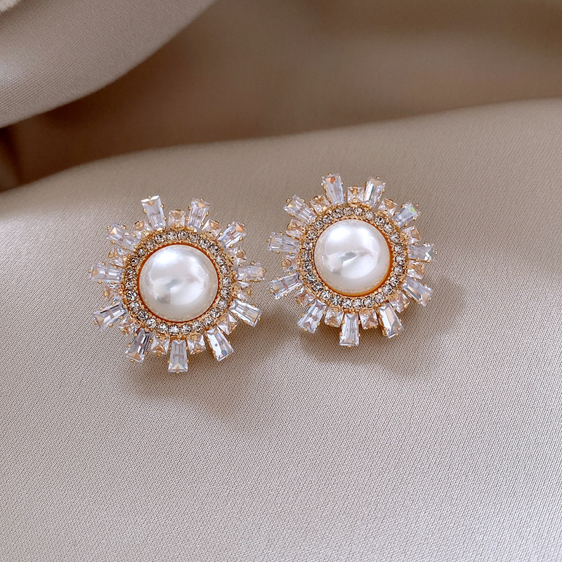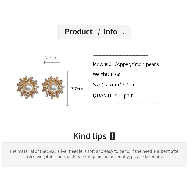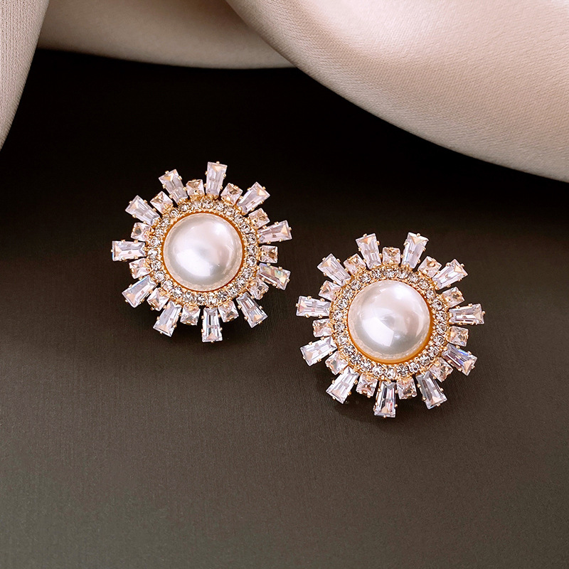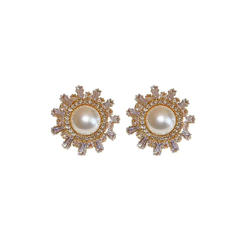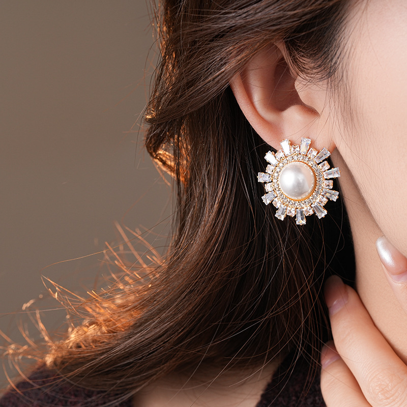 银针时尚锆石圆形太阳花珍珠耳钉网红同款气质耳环轻奢高级感耳饰