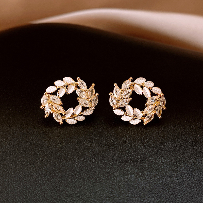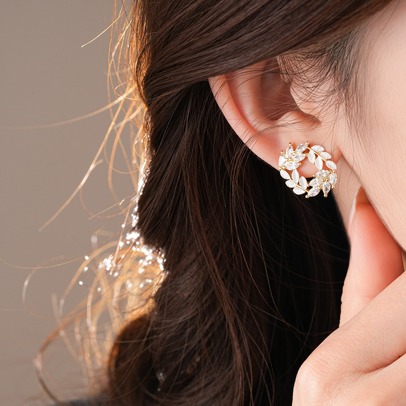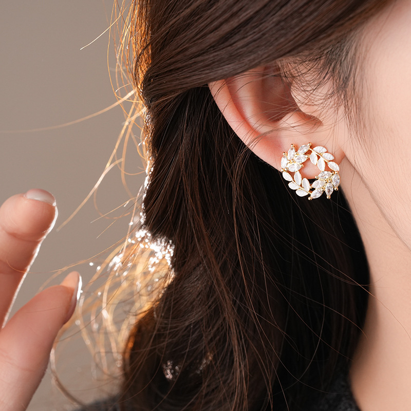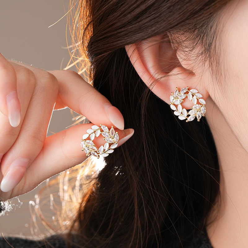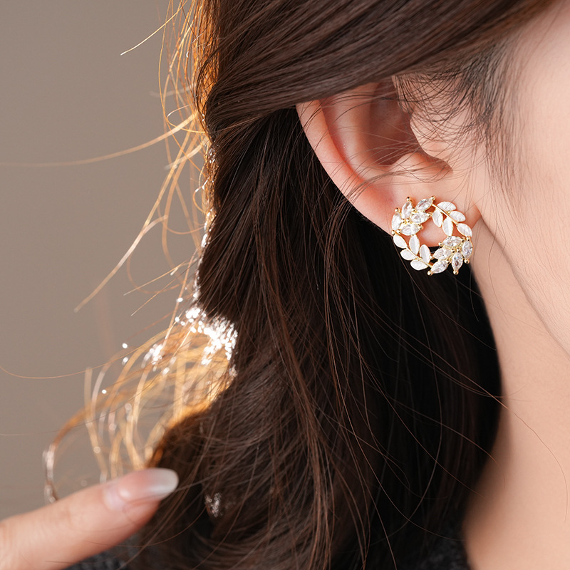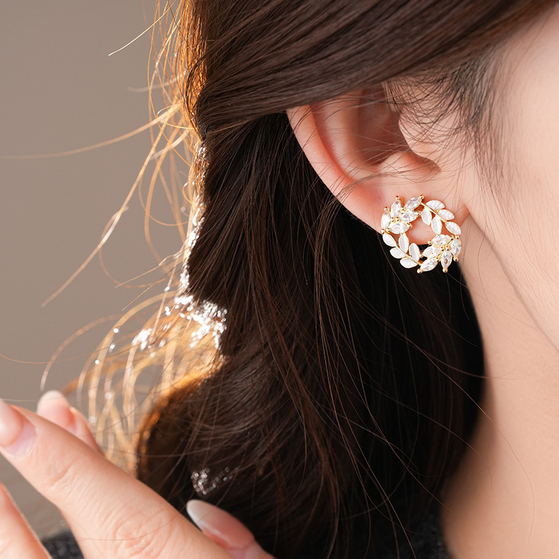 银针时尚锆石树叶耳钉法式小众通勤百搭耳环轻奢高级感耳饰批发女