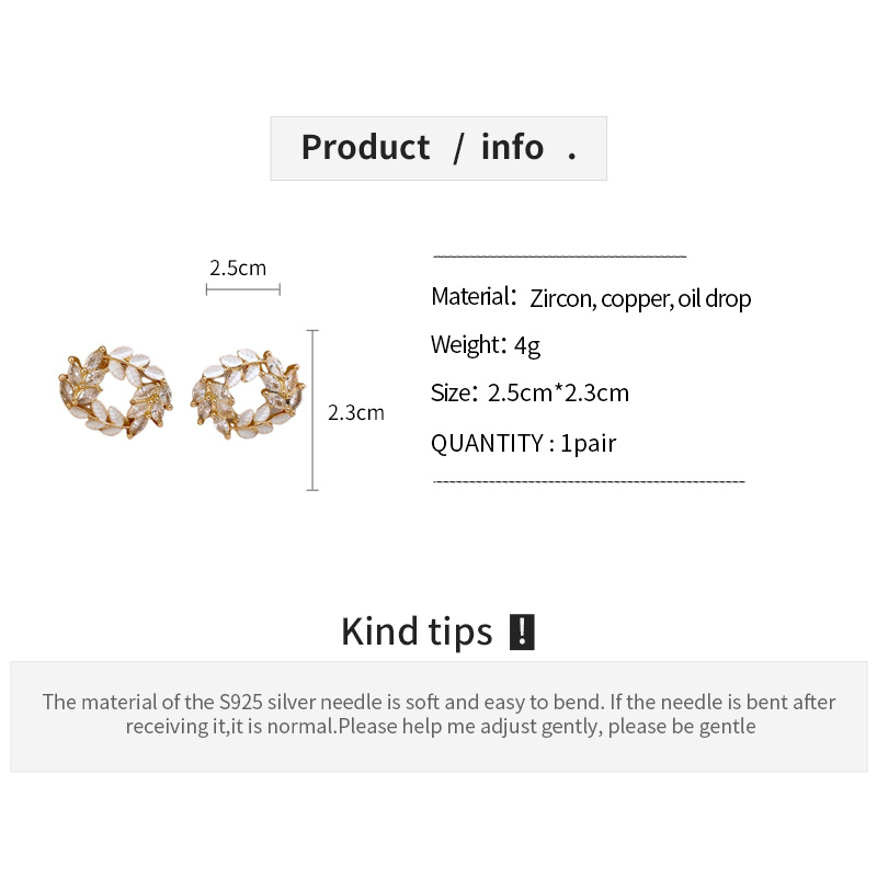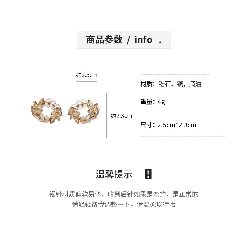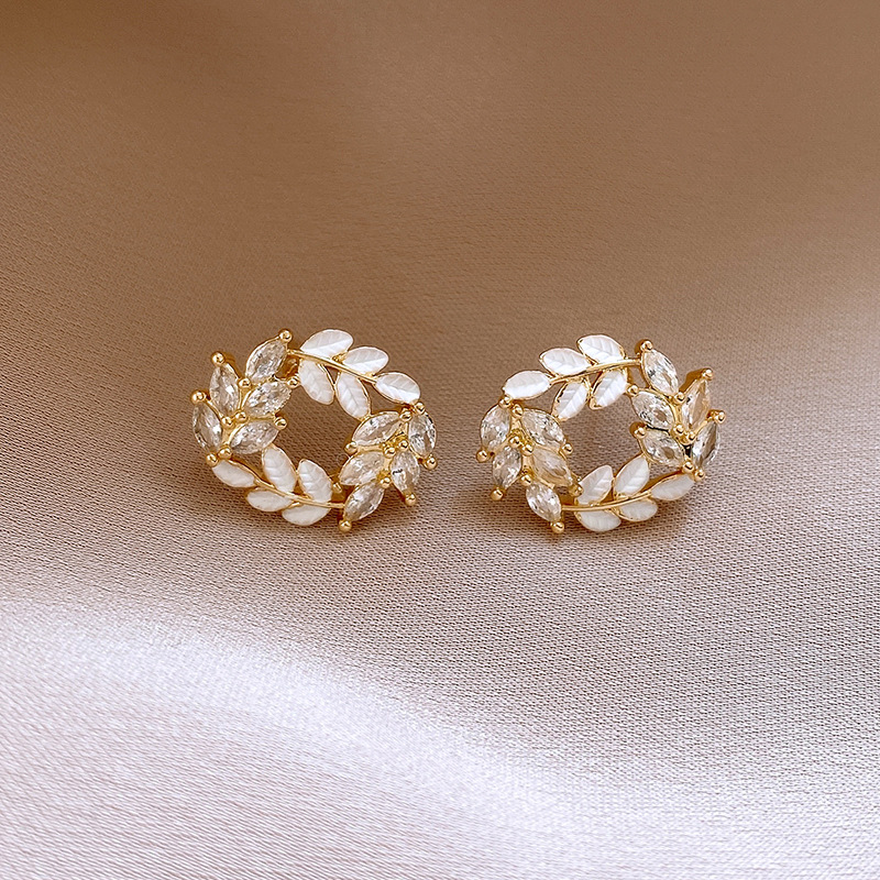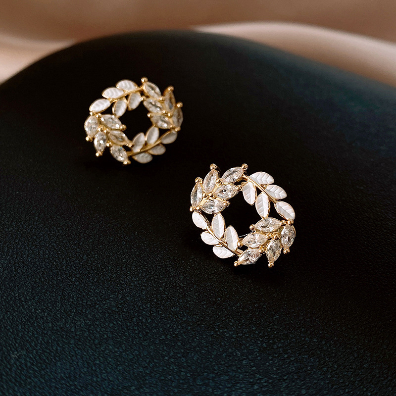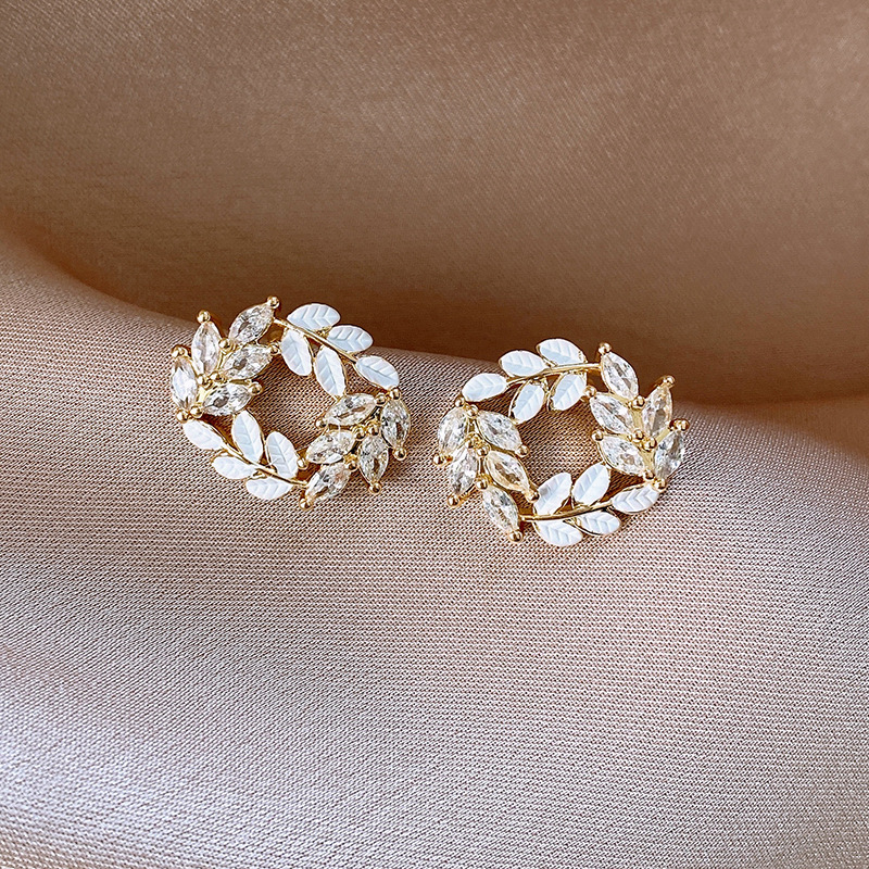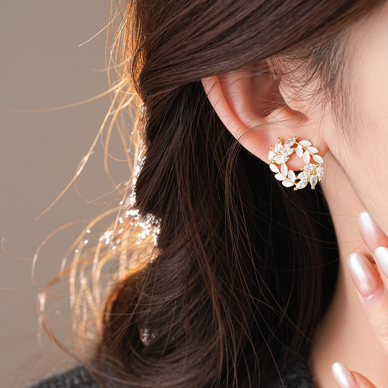 银针时尚锆石树叶耳钉法式小众通勤百搭耳环轻奢高级感耳饰批发女