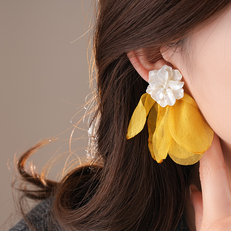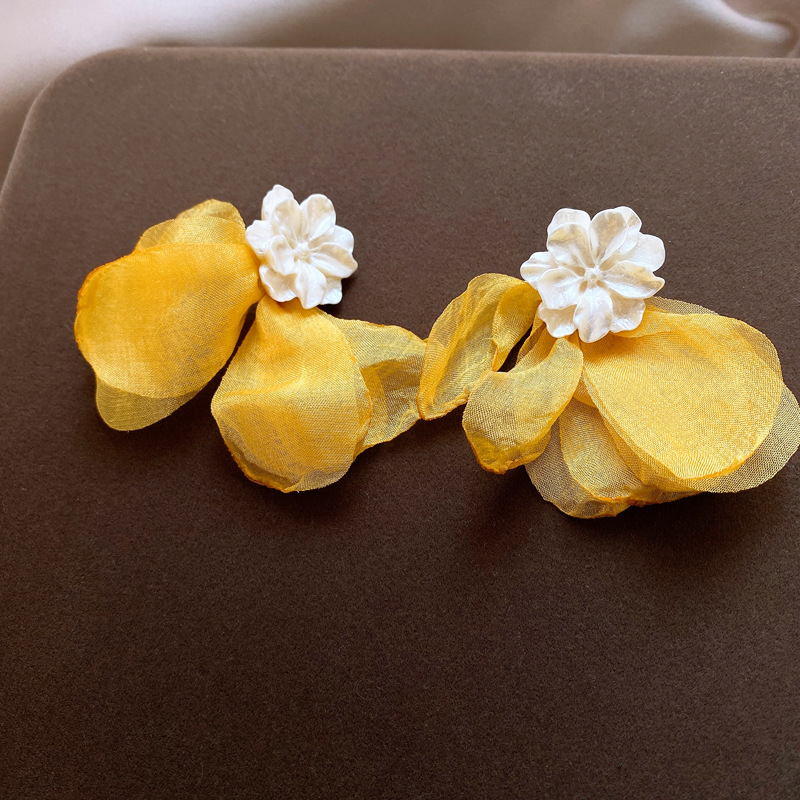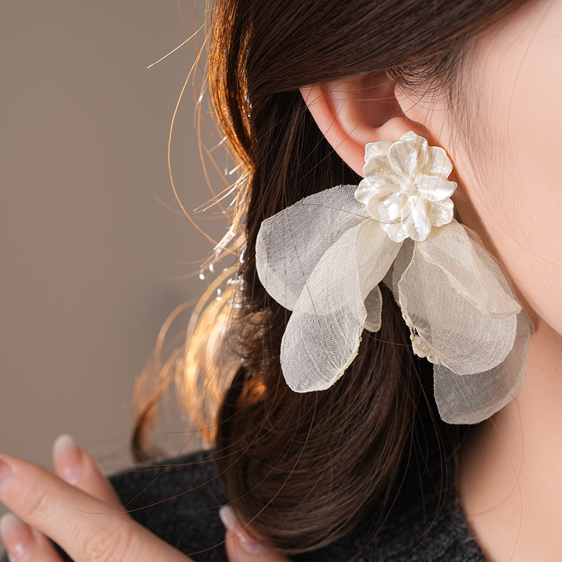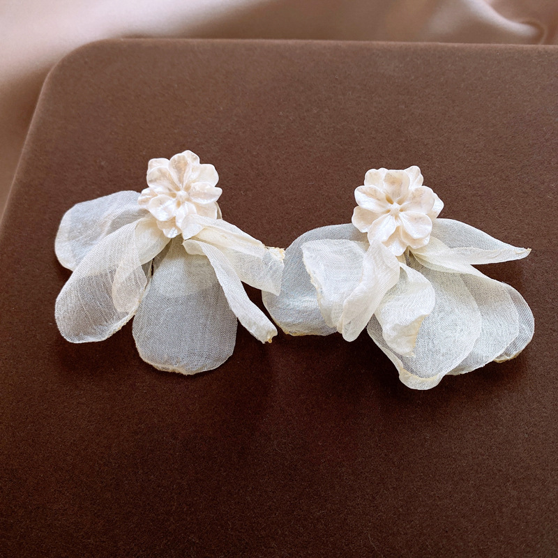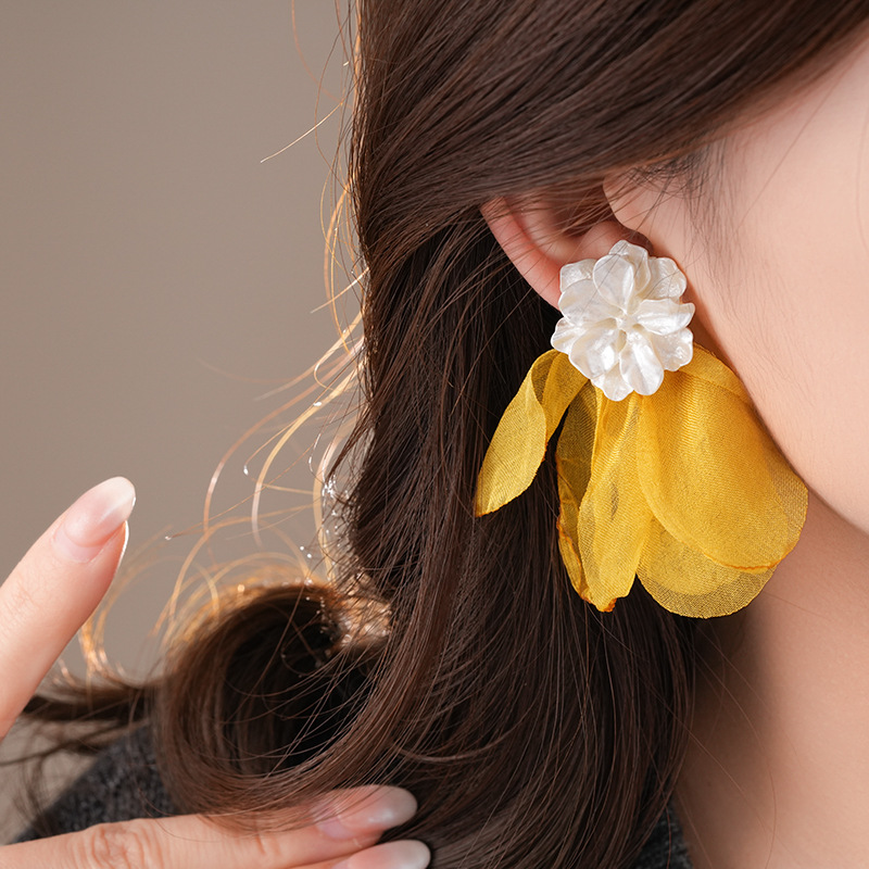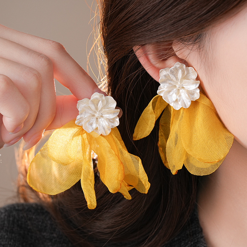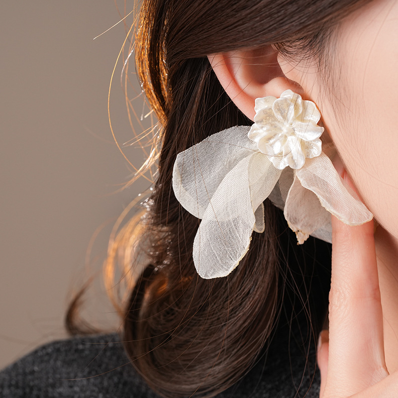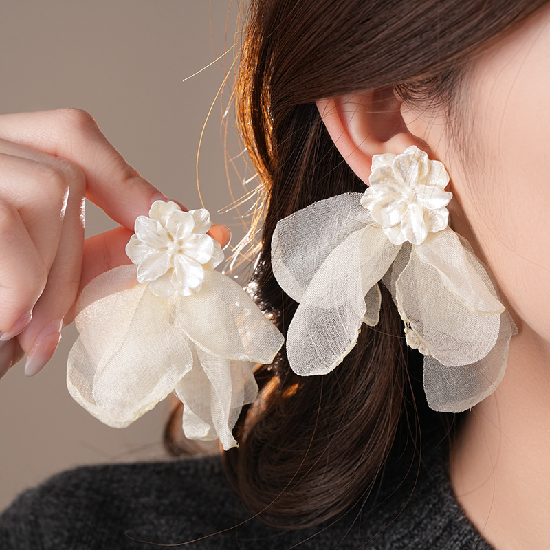 银针度假风网纱布艺花朵耳钉甜美精致耳环小清新高级感耳饰批发女