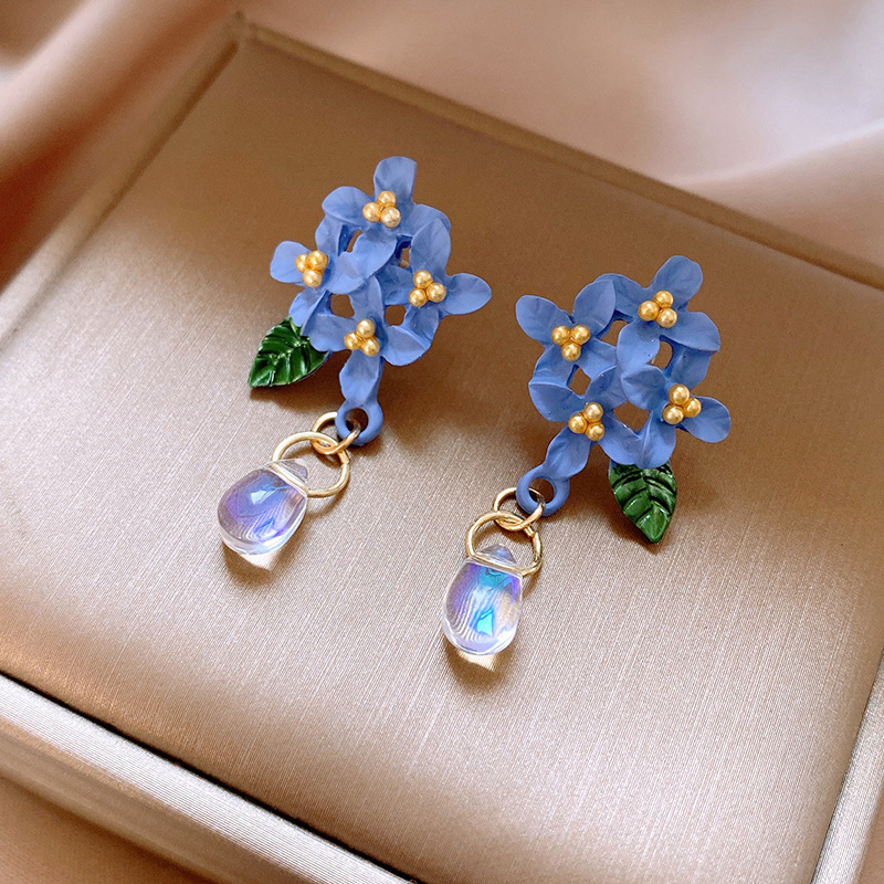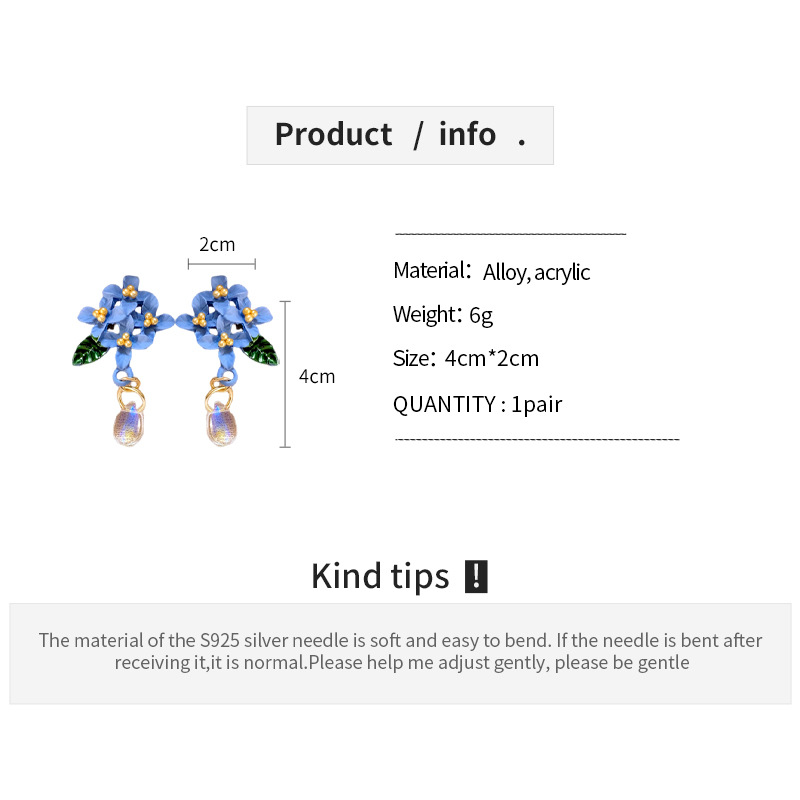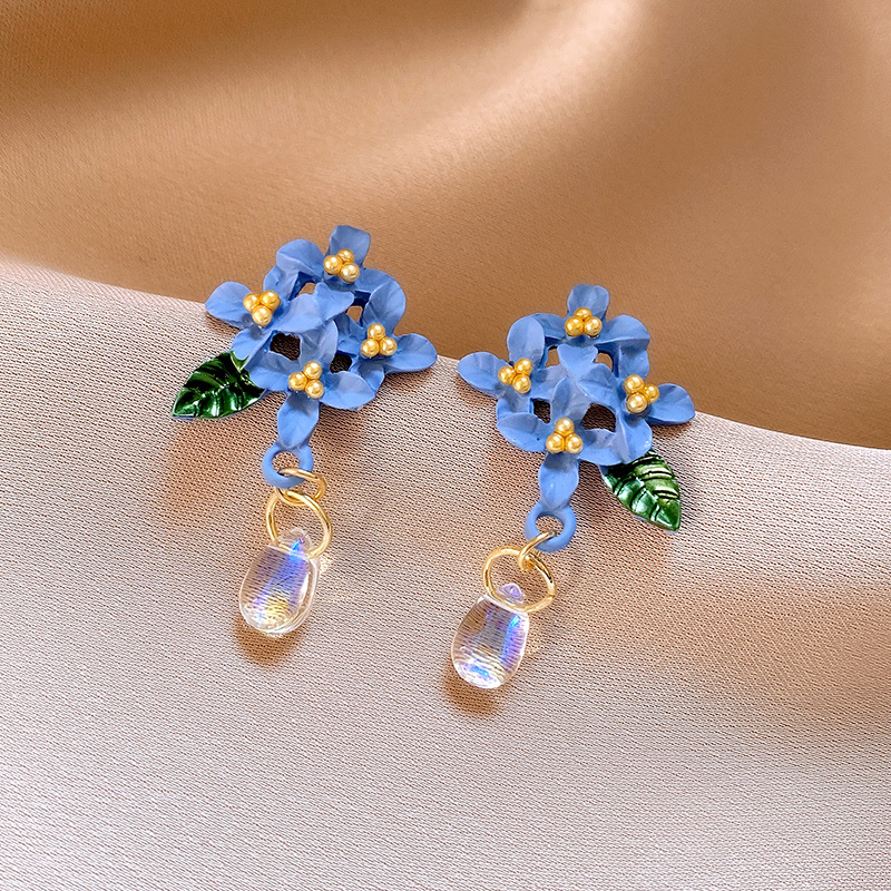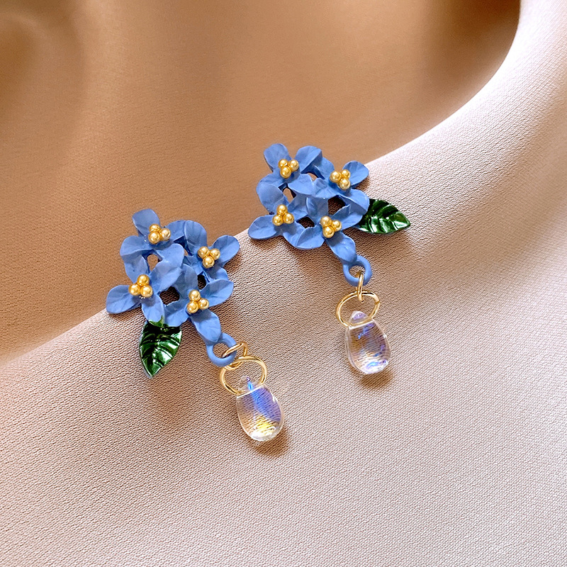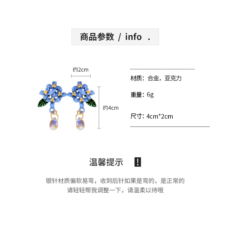 银针蓝色树叶水滴流苏花朵耳钉小清新甜美耳环轻奢风高级感耳饰女