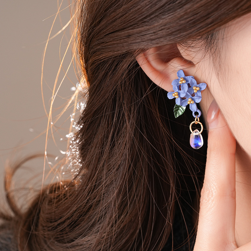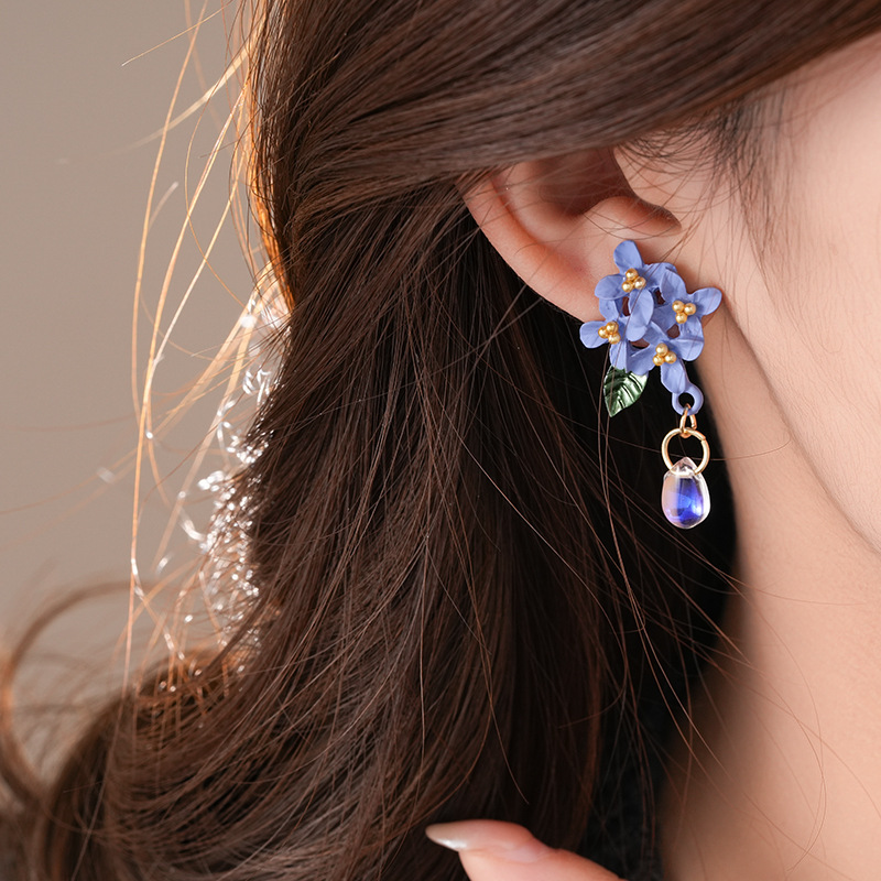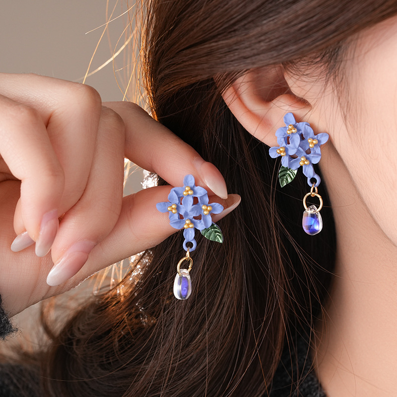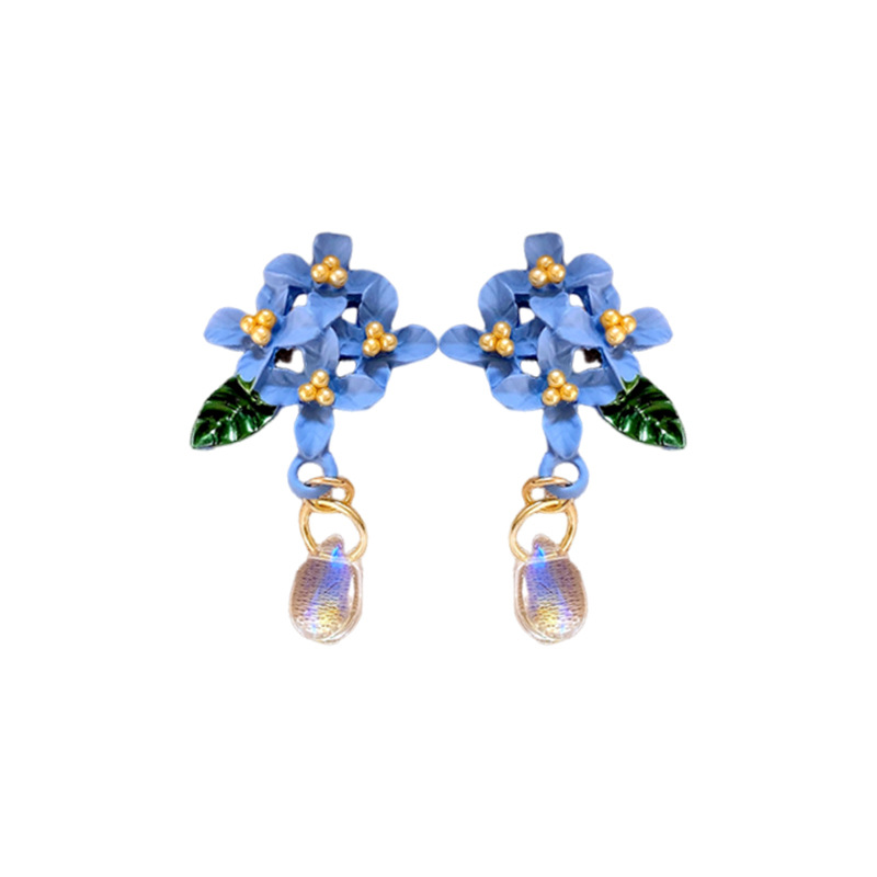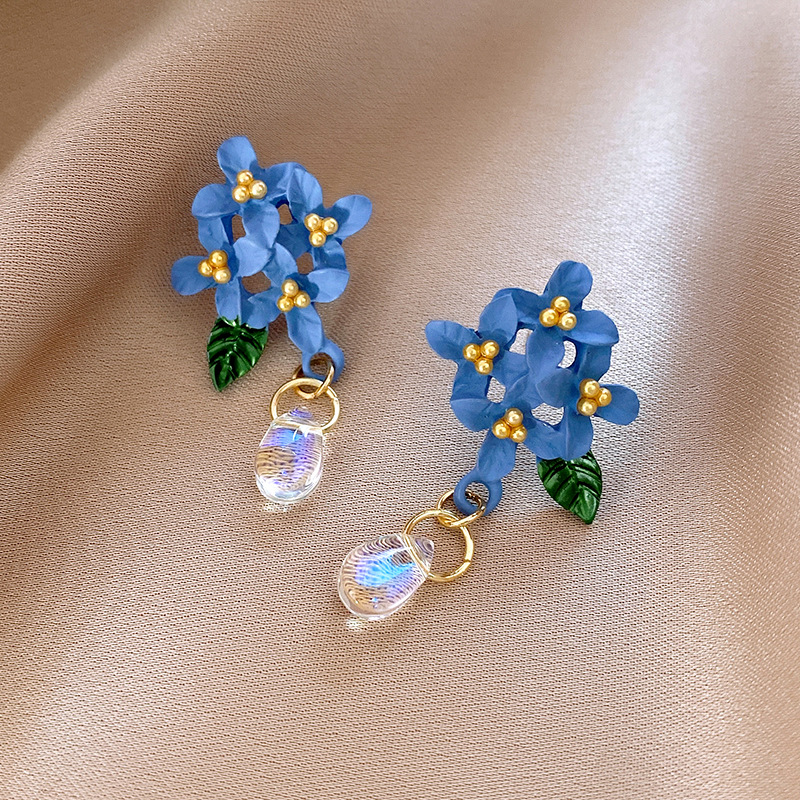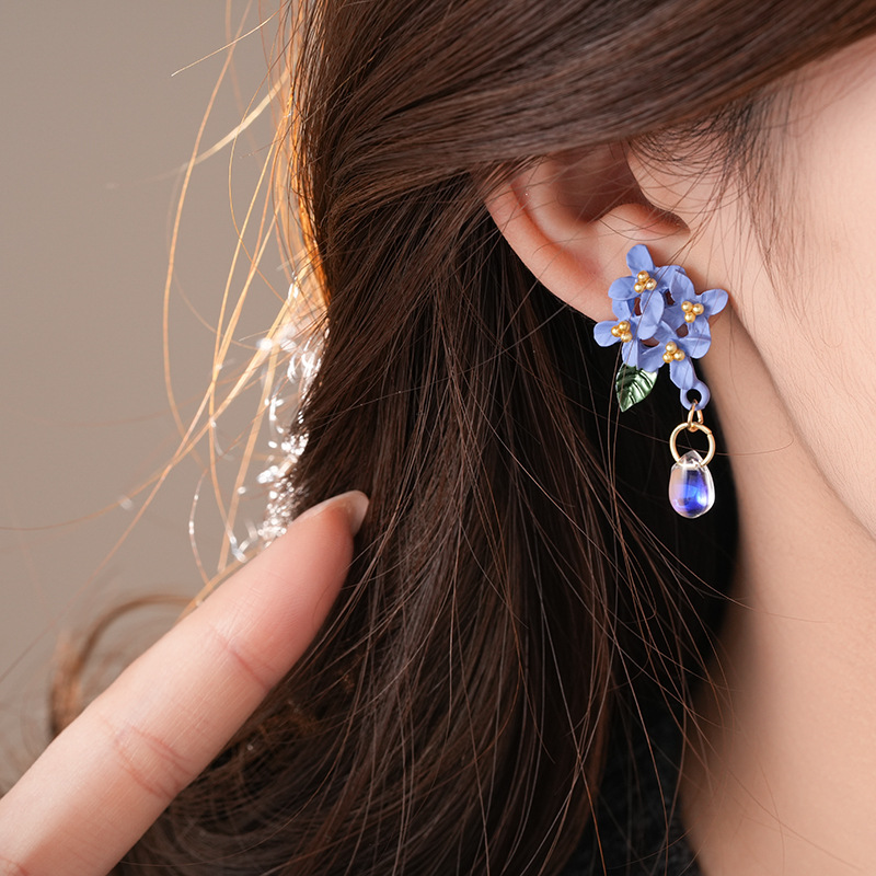 银针蓝色树叶水滴流苏花朵耳钉小清新甜美耳环轻奢风高级感耳饰女