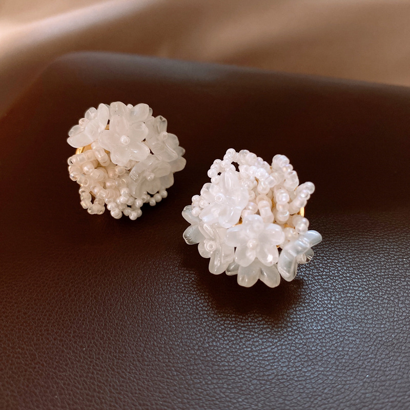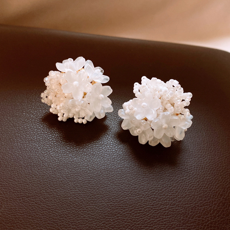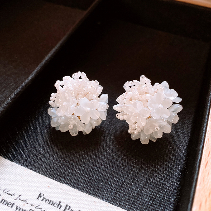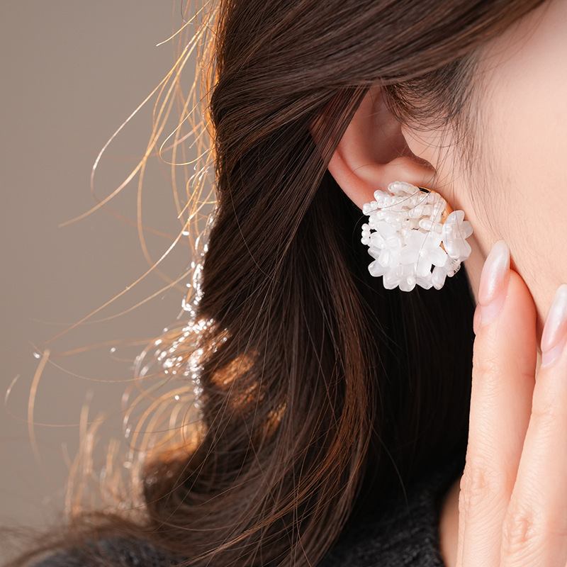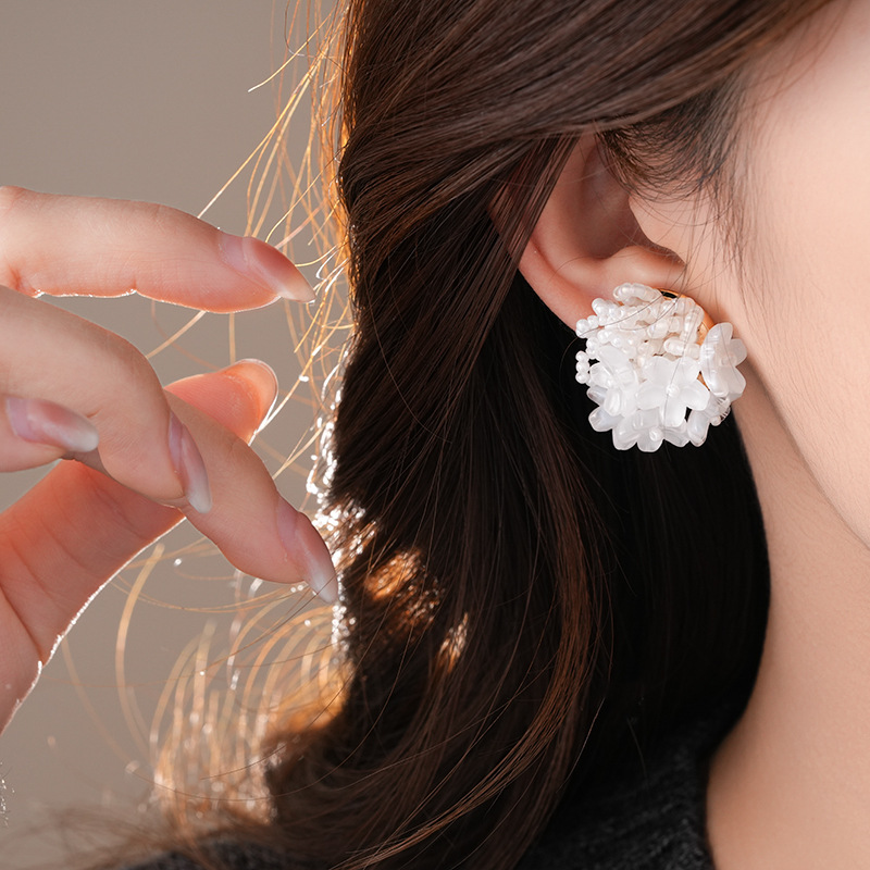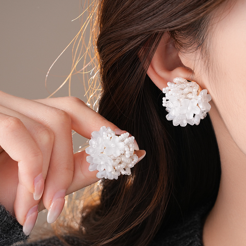 银针小清新米珠编织花朵耳钉夸张个性小众耳环轻奢高级感耳饰批发