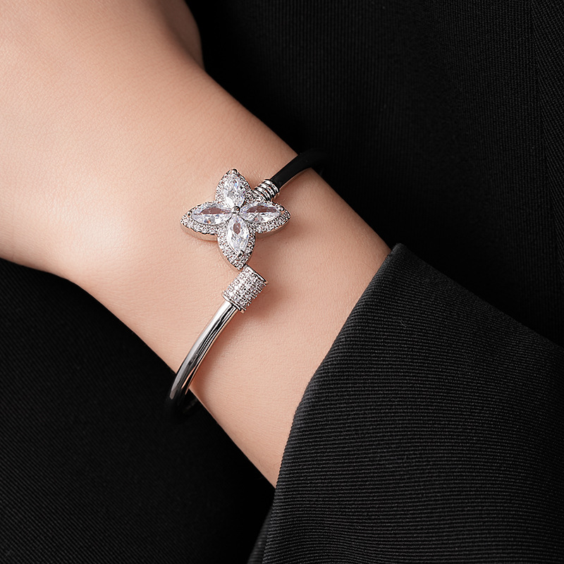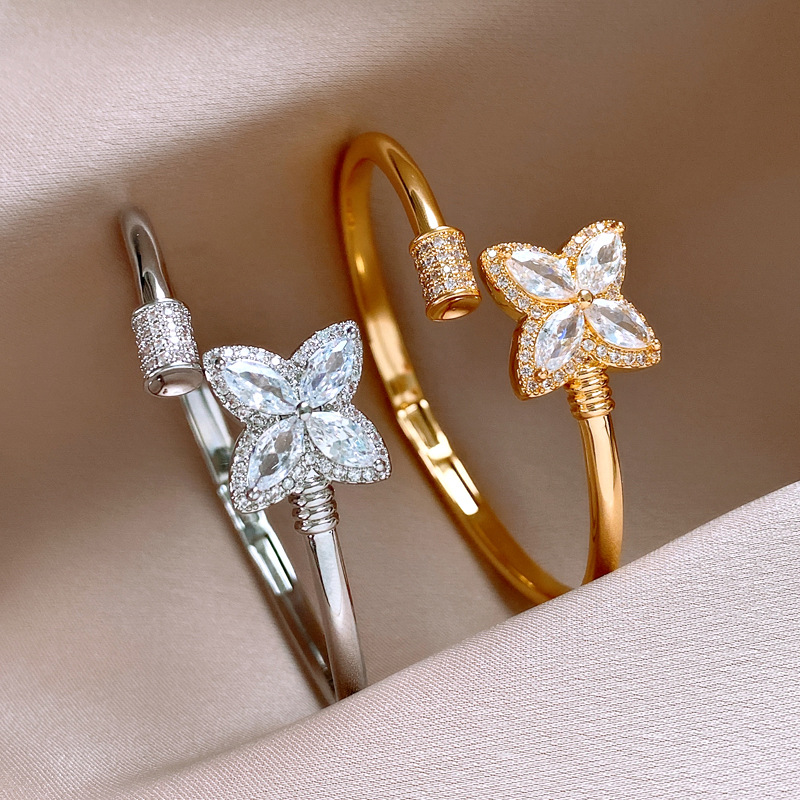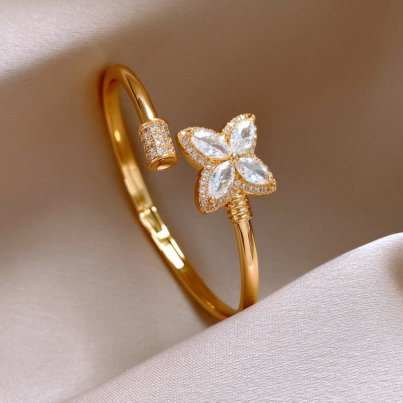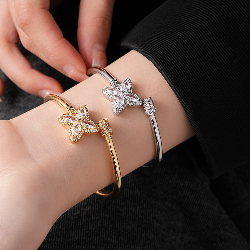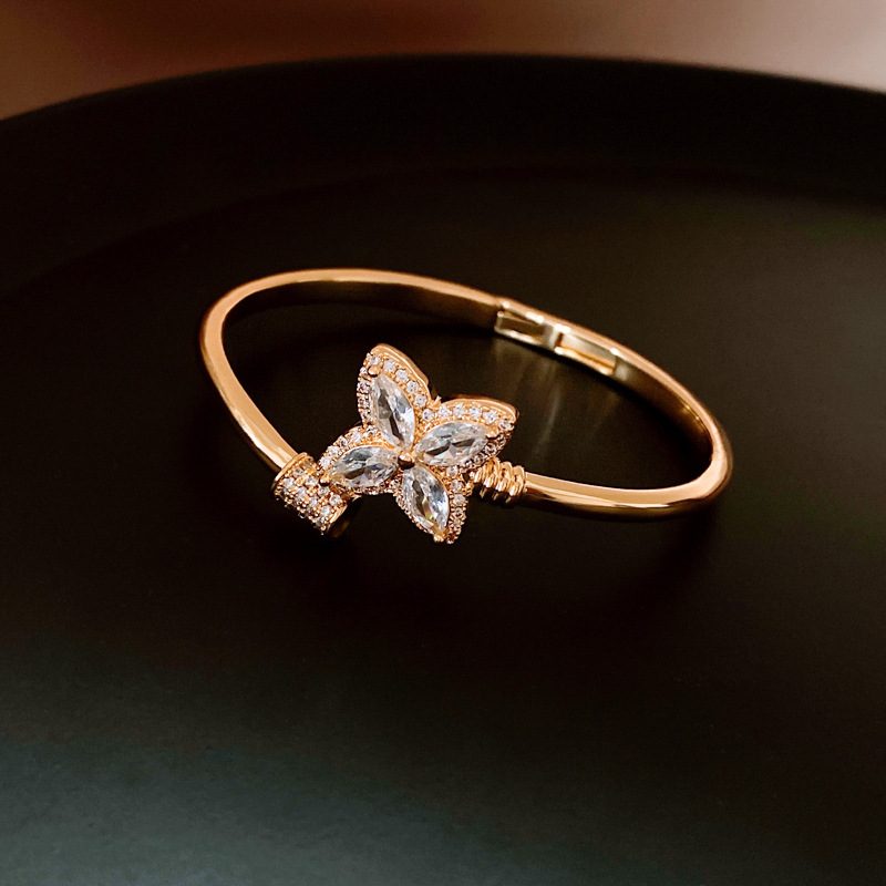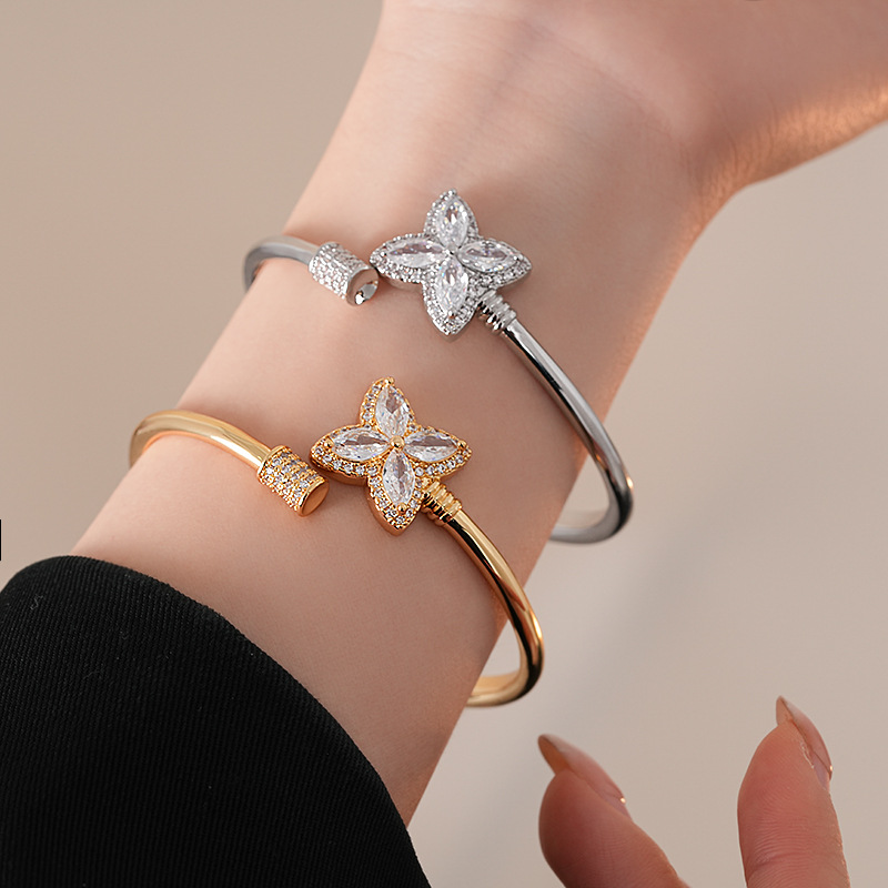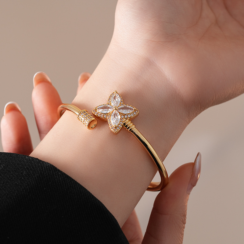 18k真金电镀锆石幸运草花朵开口手镯简约小众手环轻奢高级感饰品
