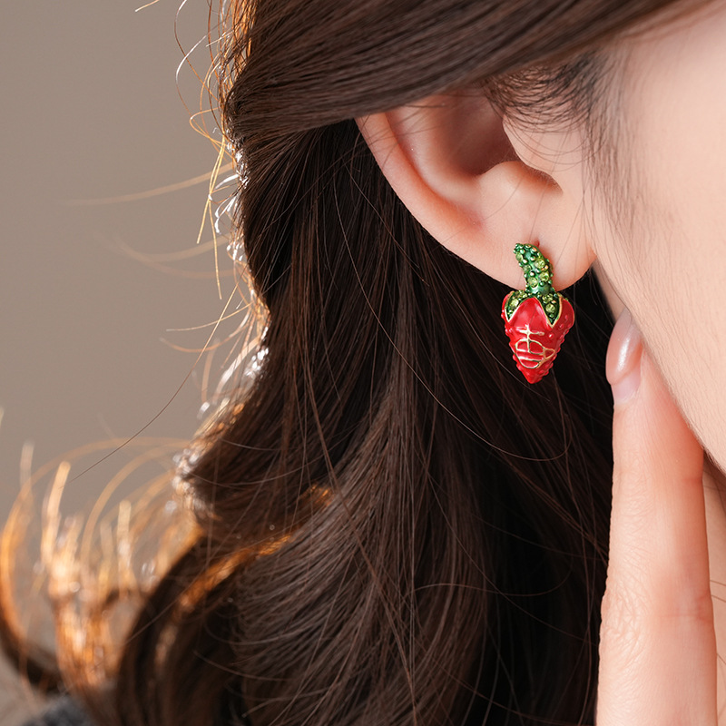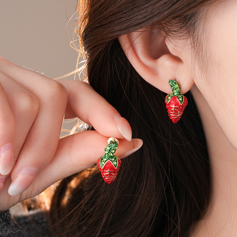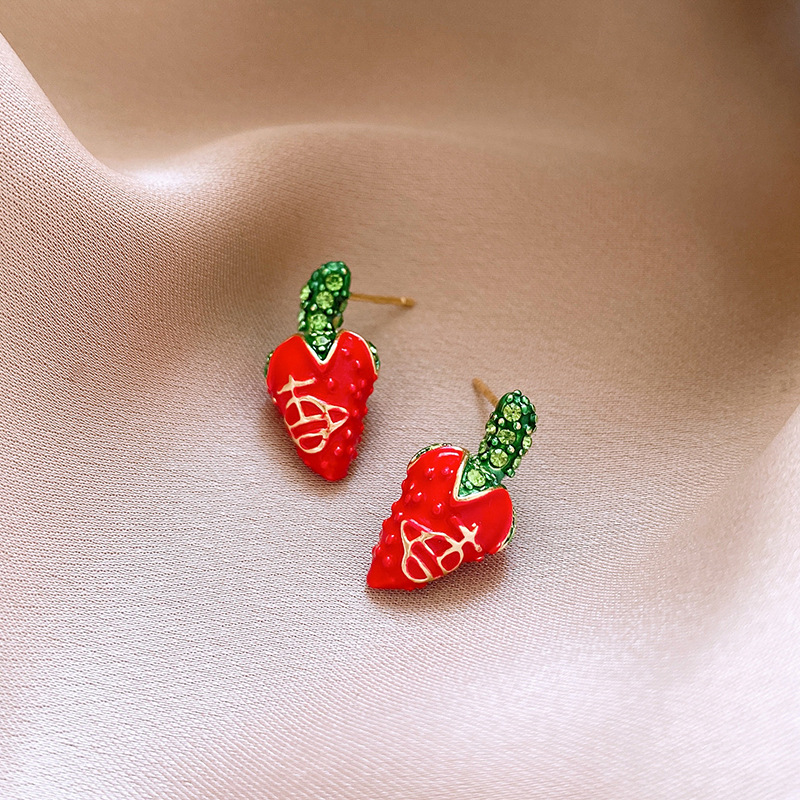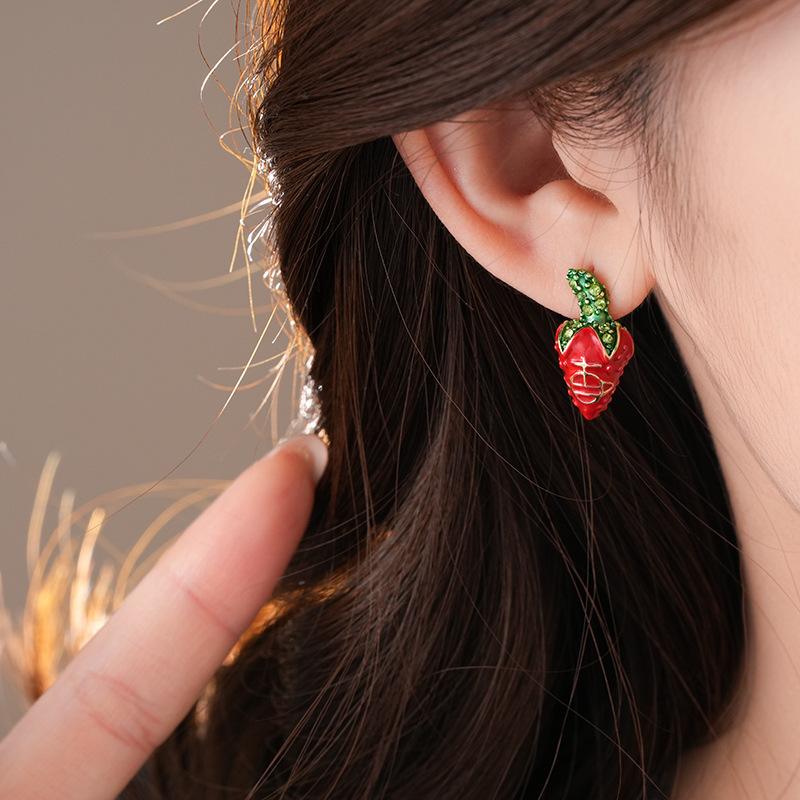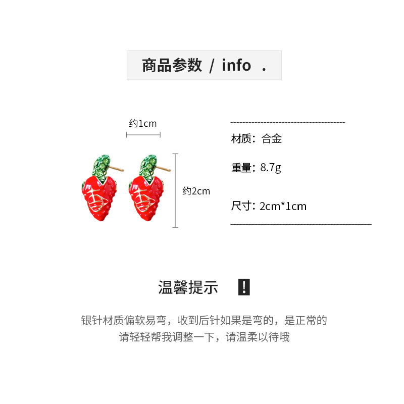 银针田园风红色滴油草莓耳钉甜美小清新耳环小众高级感耳饰批发女