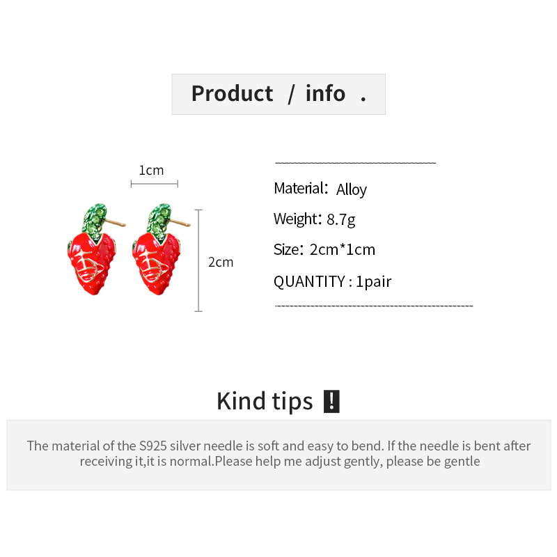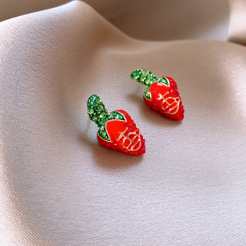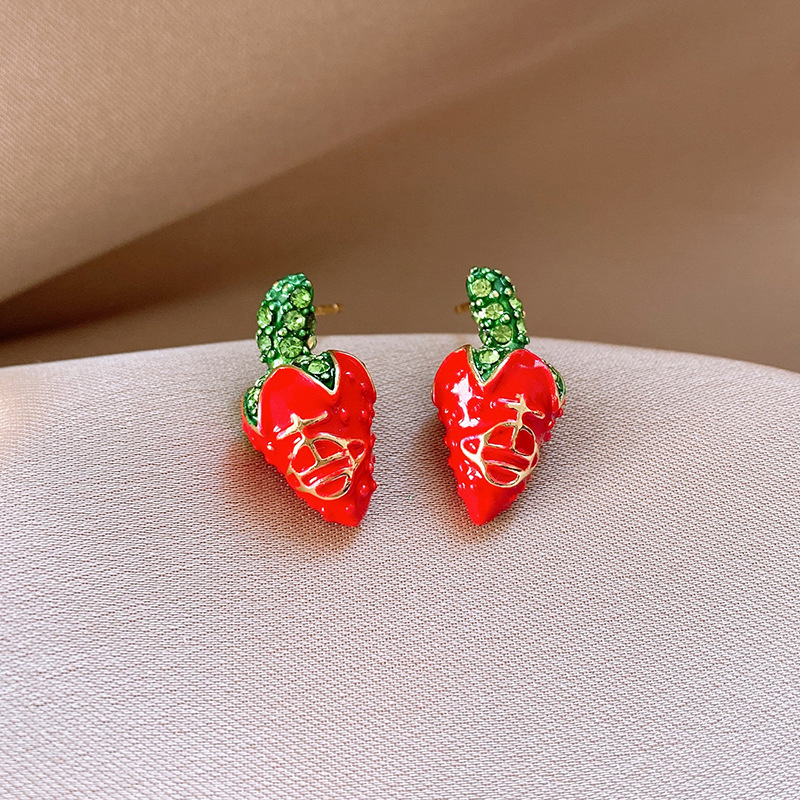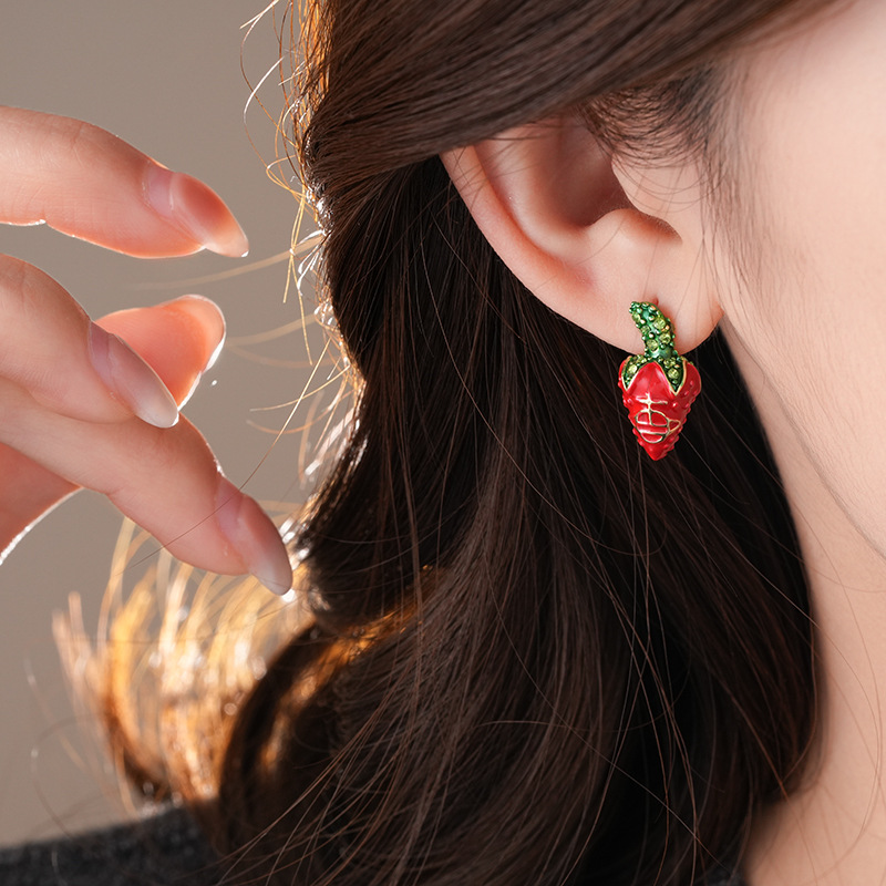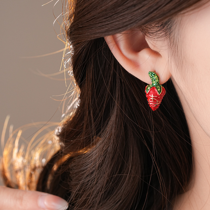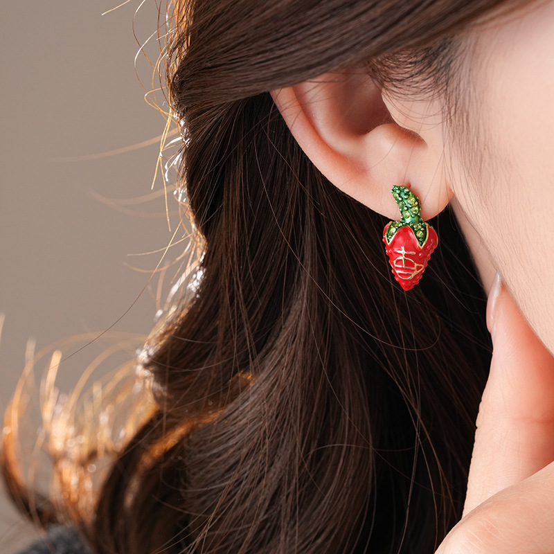 银针田园风红色滴油草莓耳钉甜美小清新耳环小众高级感耳饰批发女