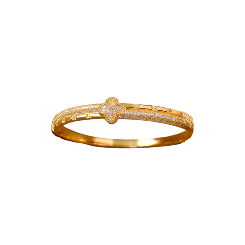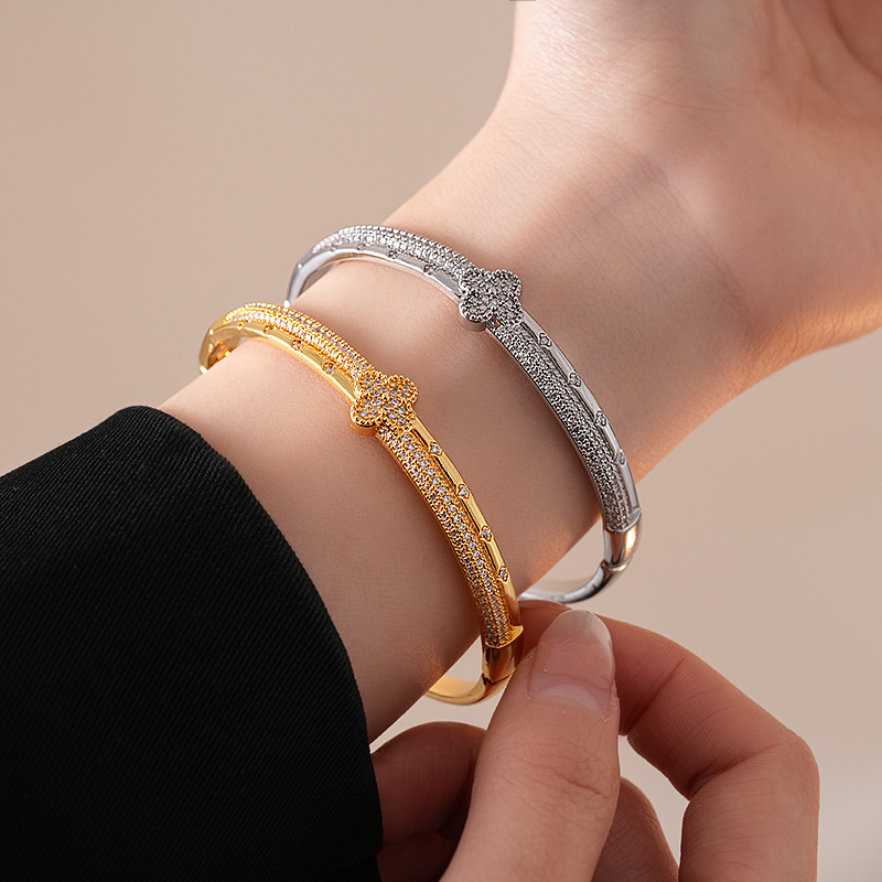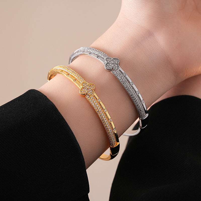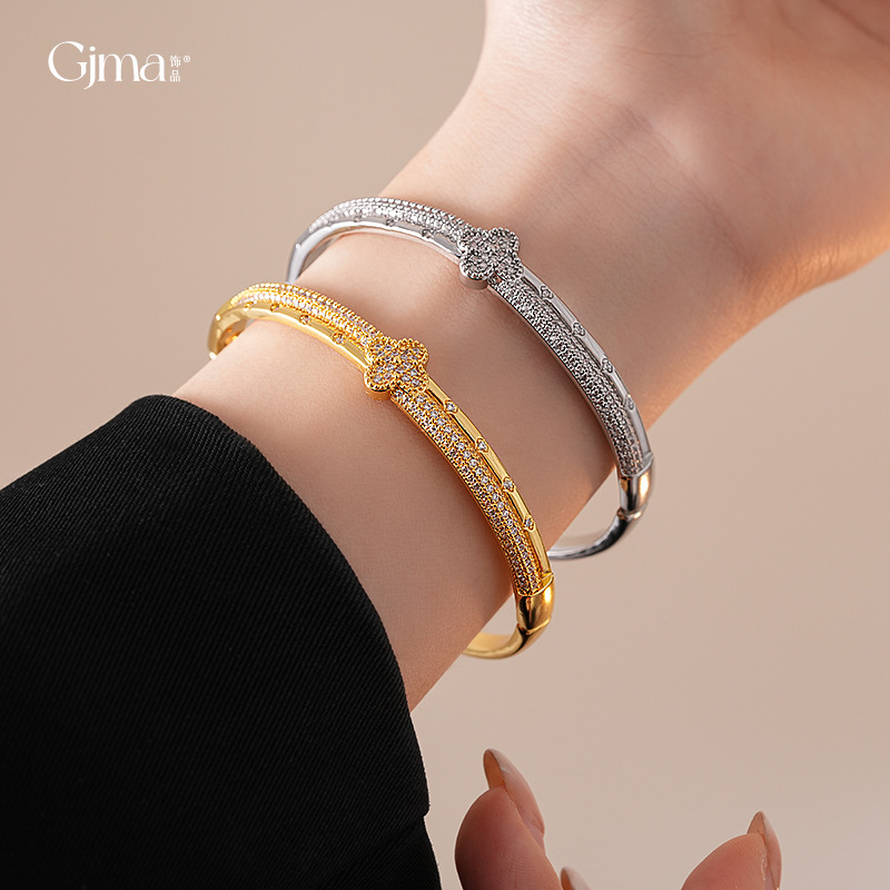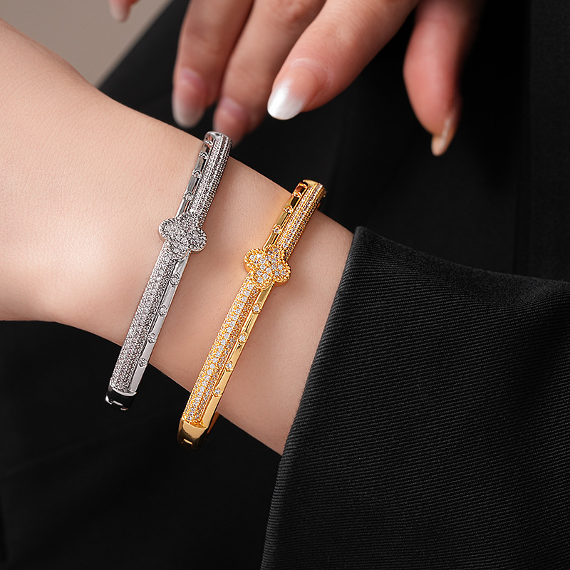 18k真金电镀微镶锆石幸运草花朵锆石手镯时尚高级感手环手饰饰品
