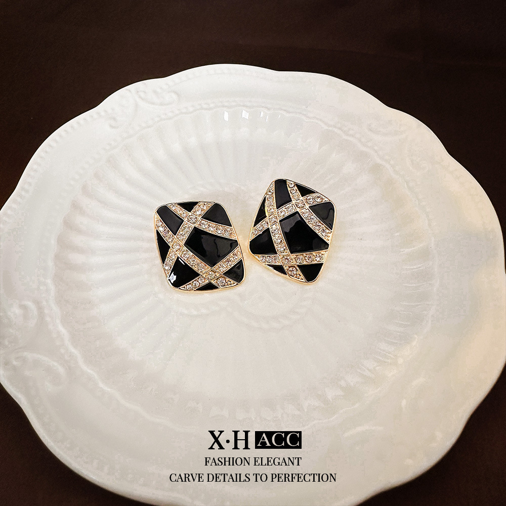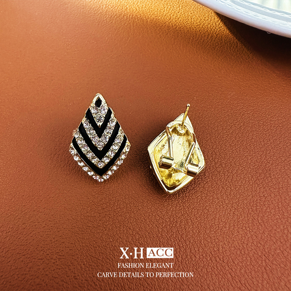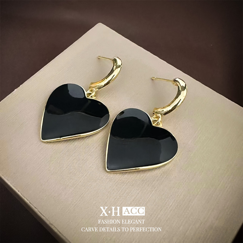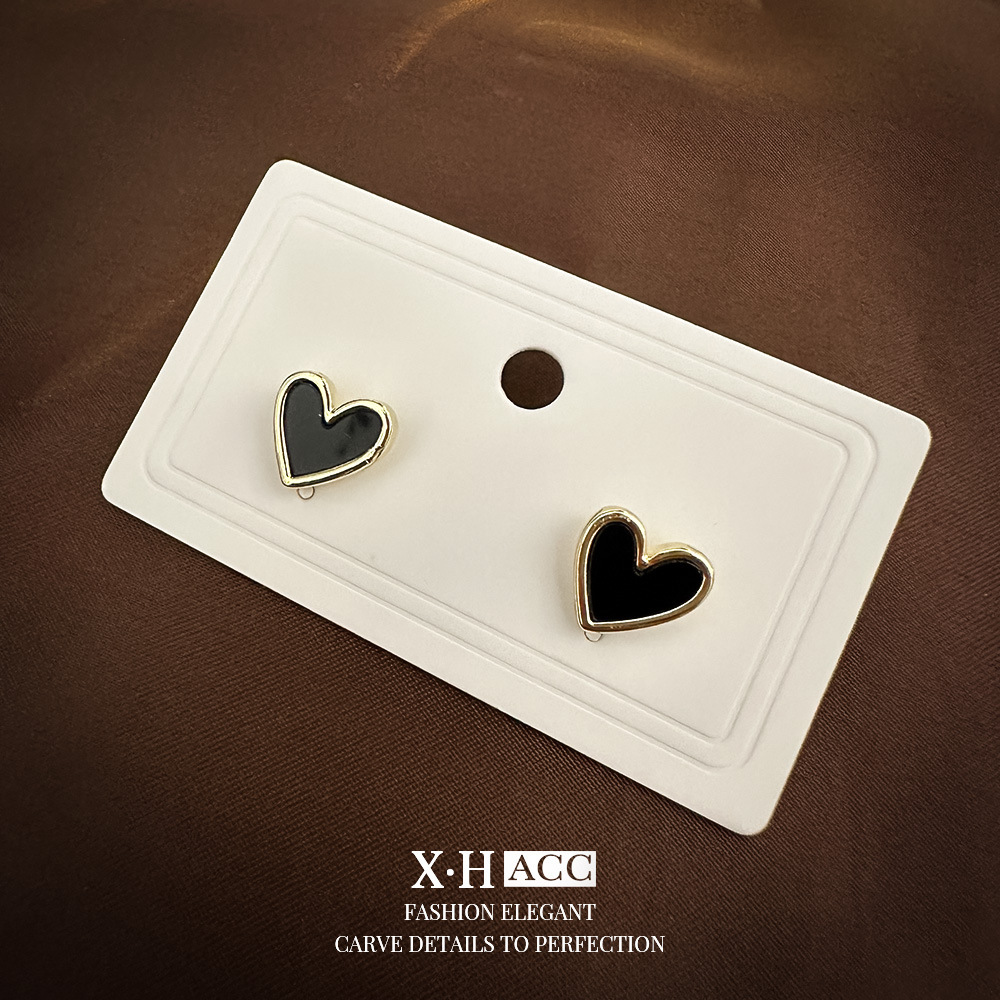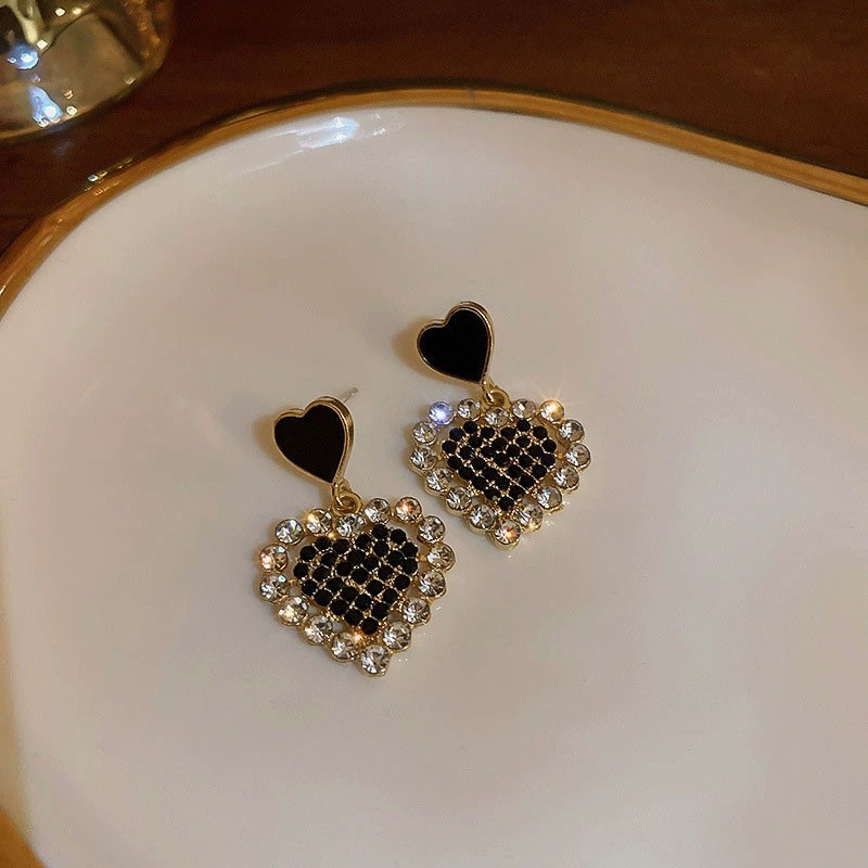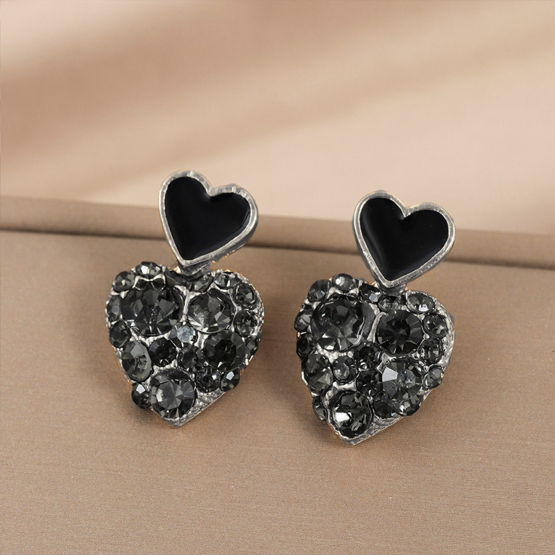 银针轻奢高级感黑色锆石爱心耳环小众气质几何耳钉独特设计感耳饰