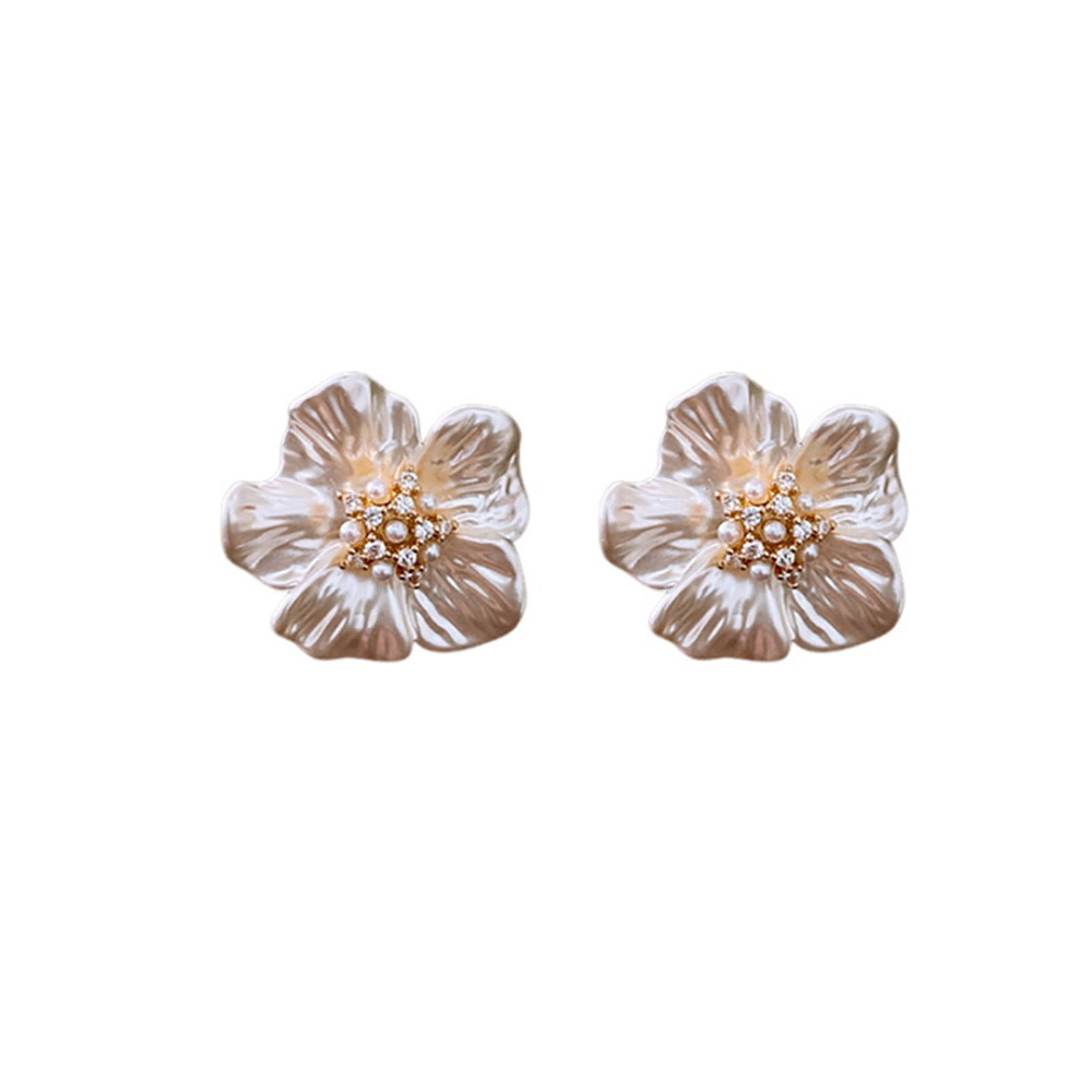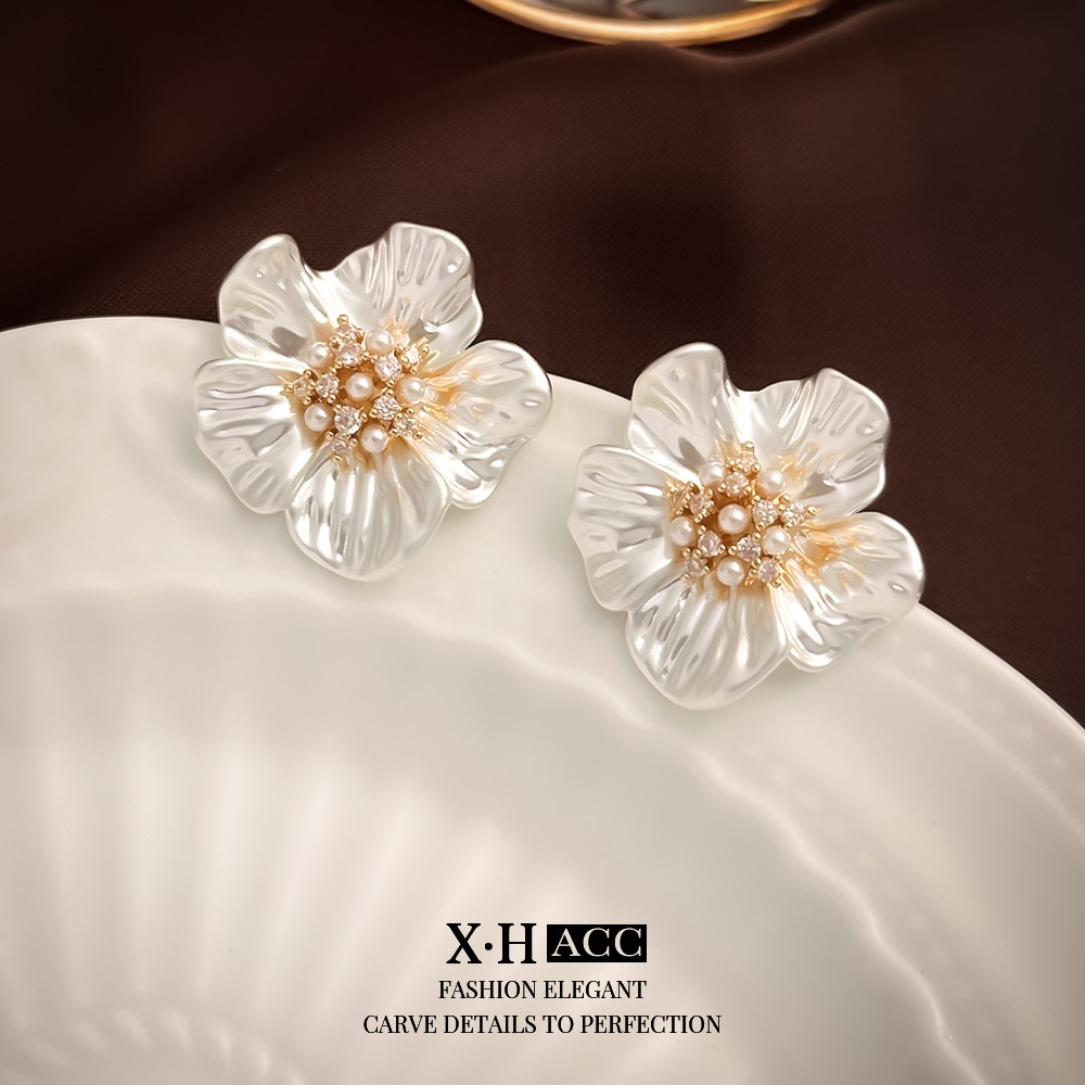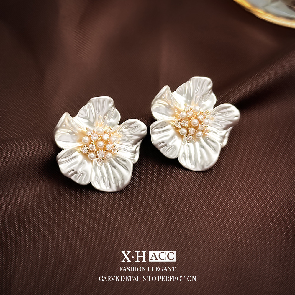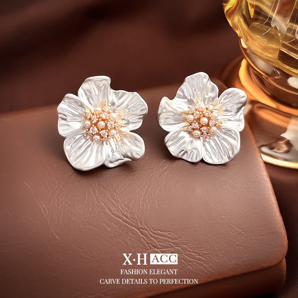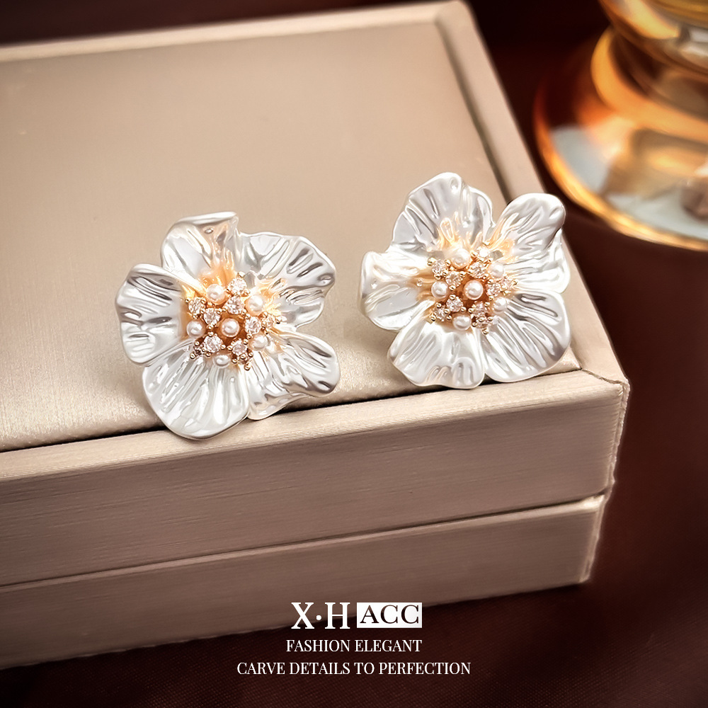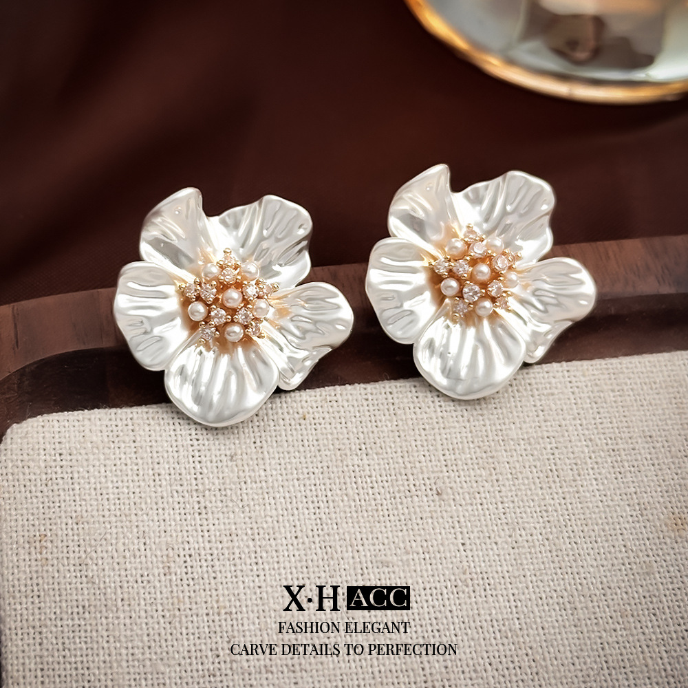 真金电镀镶锆石珍珠花朵耳钉法式复古个性潮耳环轻奢高级感耳饰女