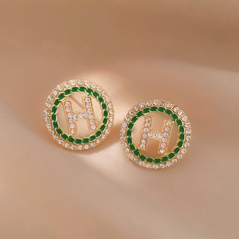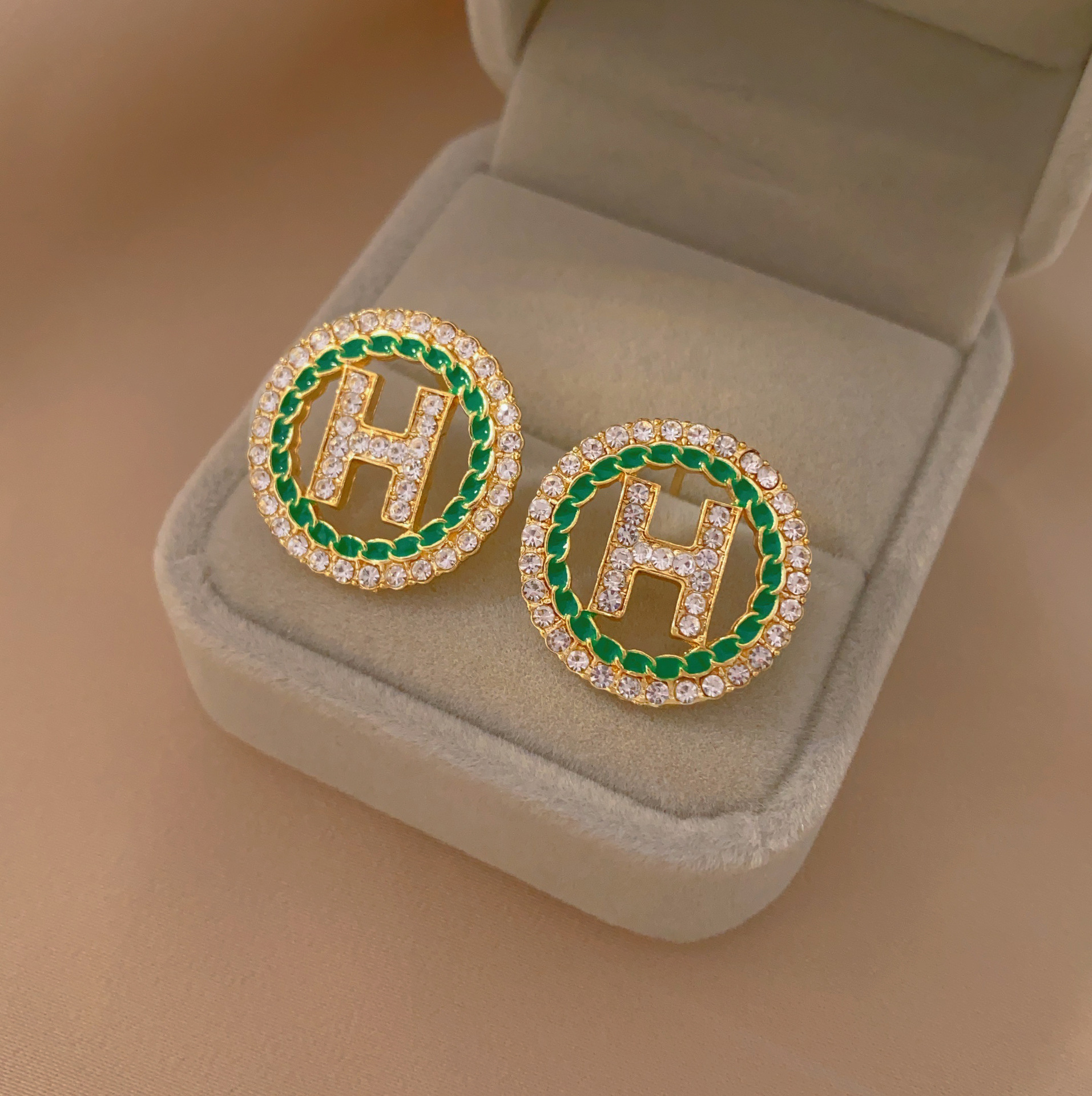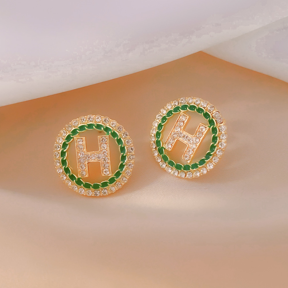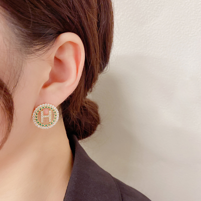 银针镂空镶钻H字母几何耳钉 韩系时尚圆形高级感耳环简约百搭耳饰