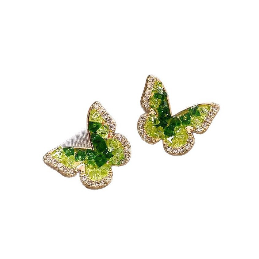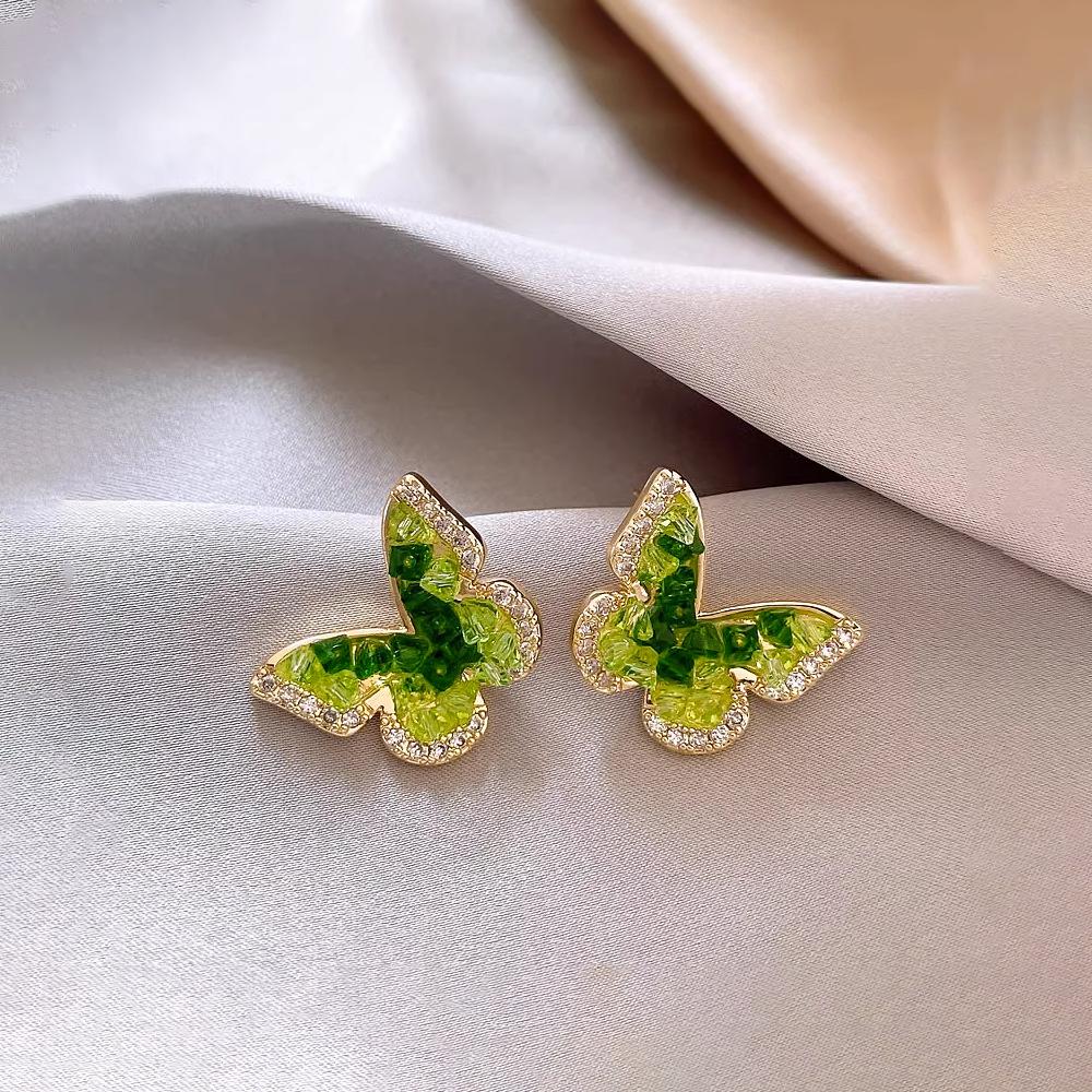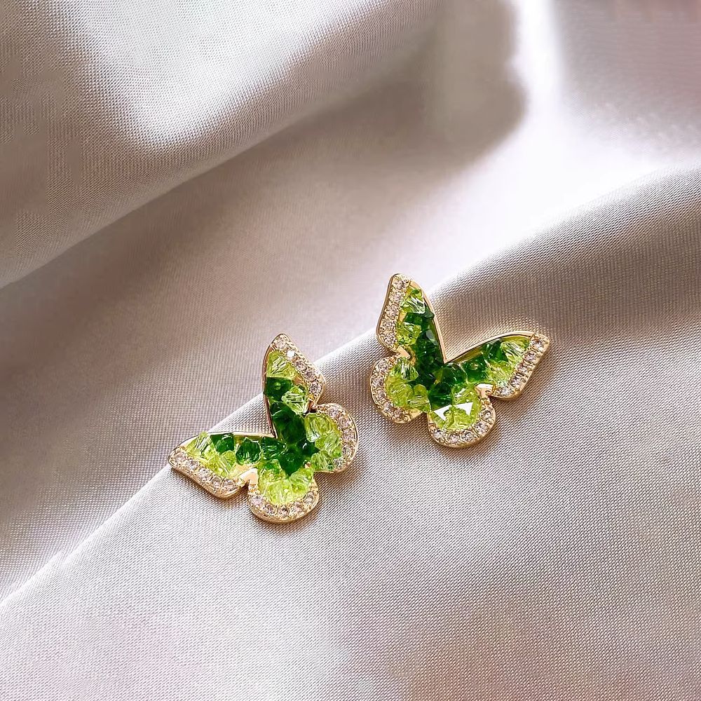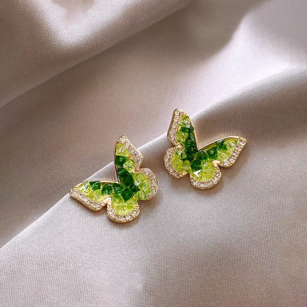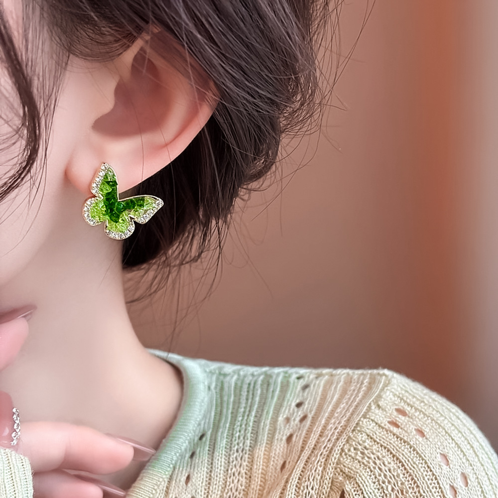 真金电镀绿色镶钻蝴蝶耳钉时尚气质森系小清新耳环小众设计感耳饰