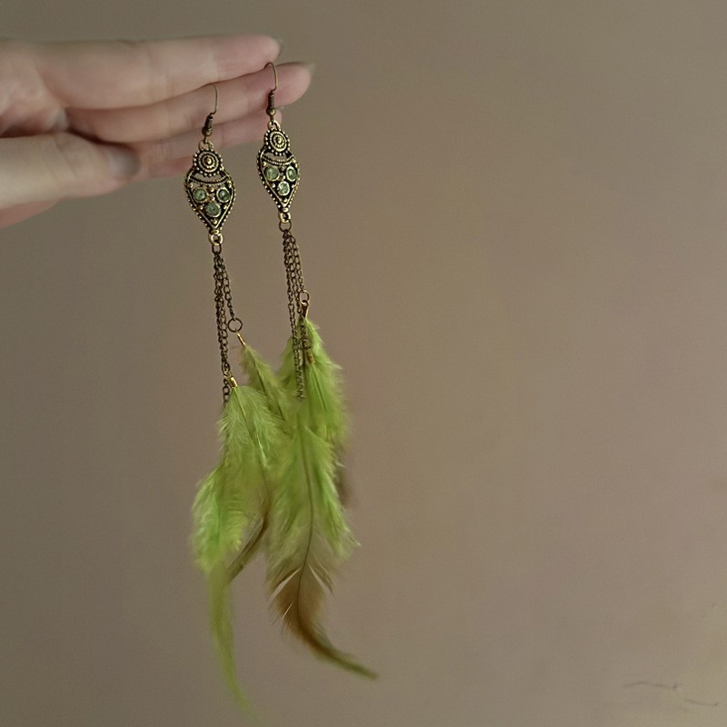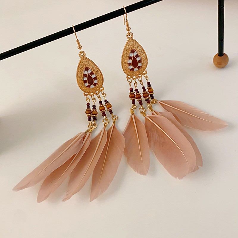 波西米亚水滴羽毛米珠流苏耳环小众民族风耳钩气质轻奢度假风耳饰