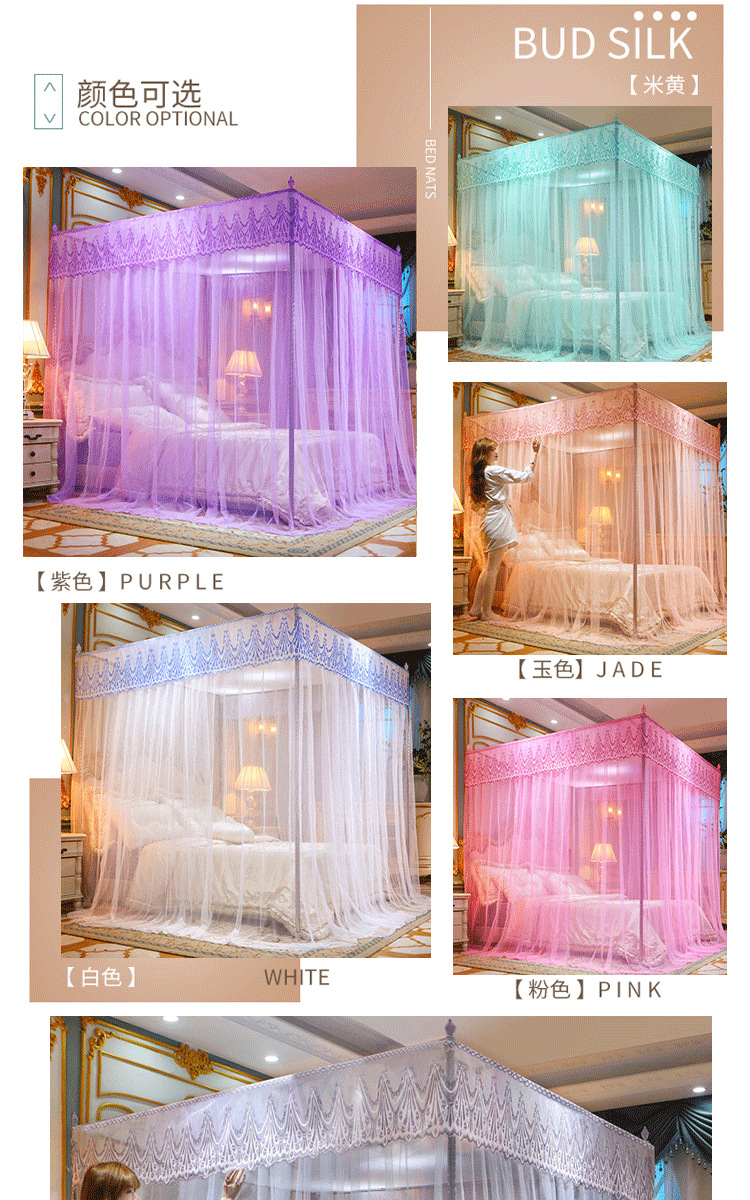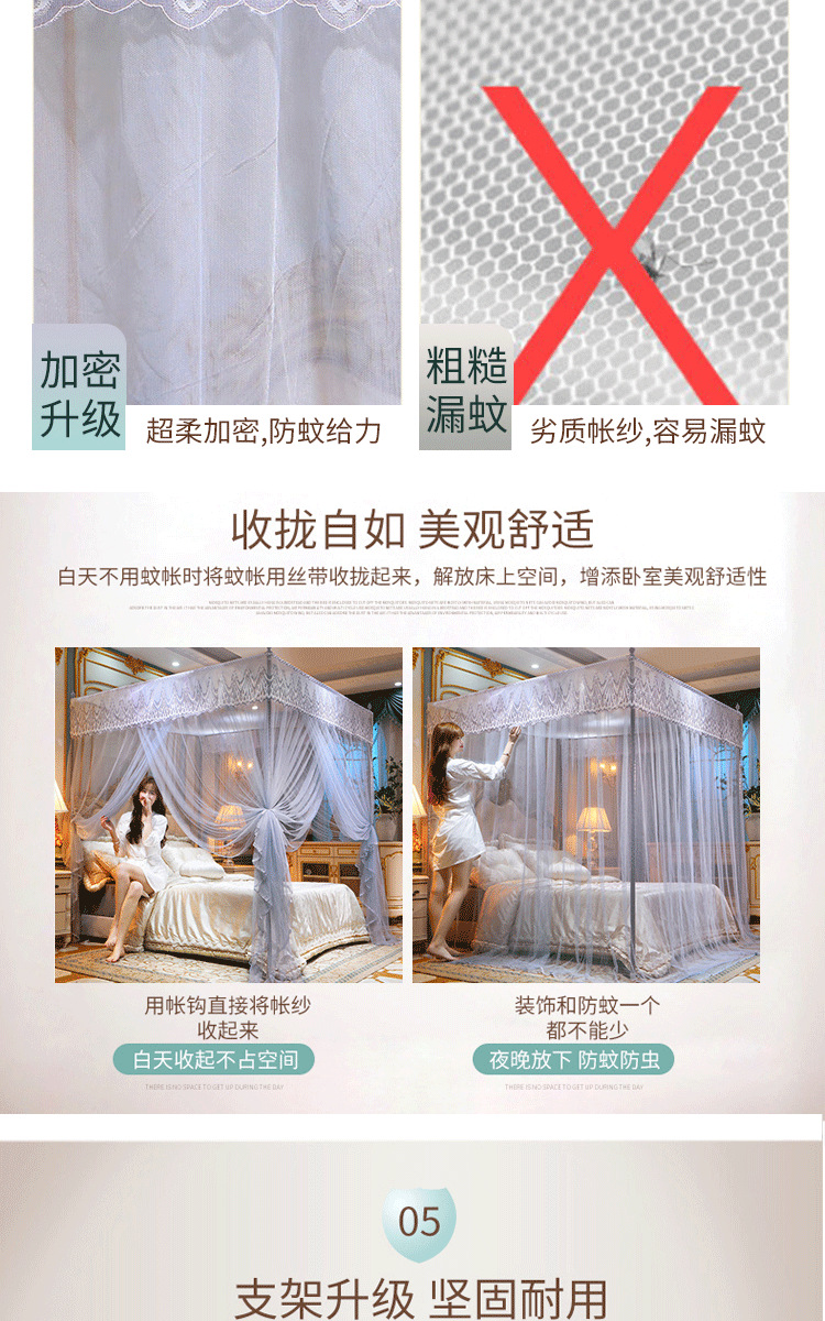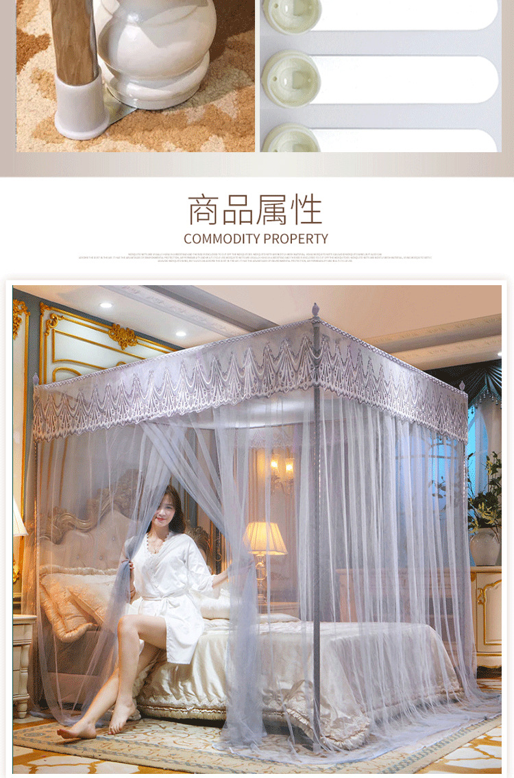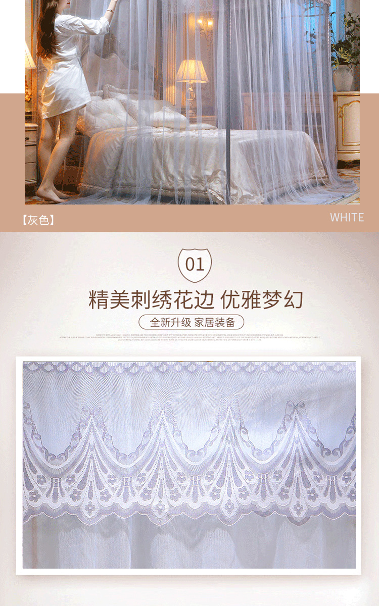 欧式宫廷蕾丝落地蚊帐三开门防尘顶公主风蚊帐不锈钢支架加密床幔