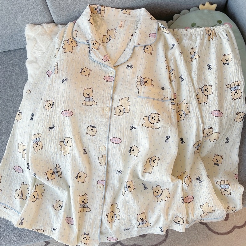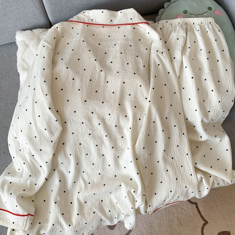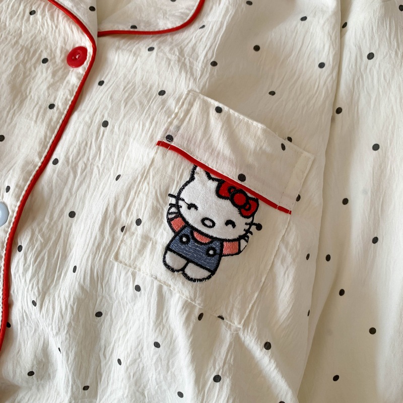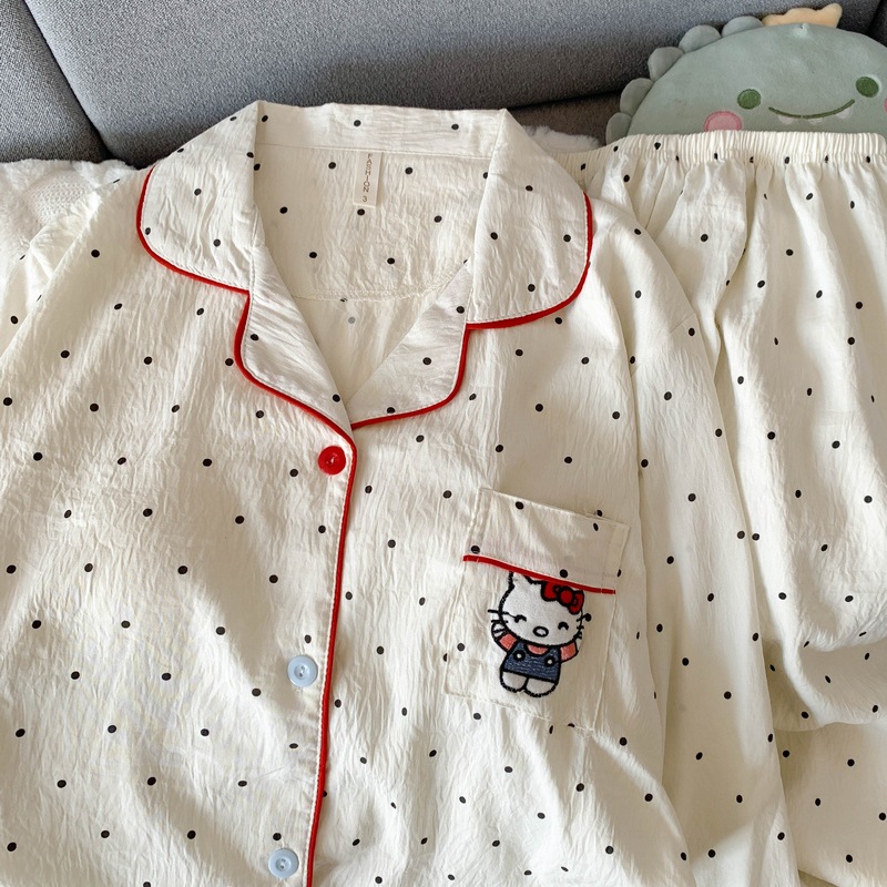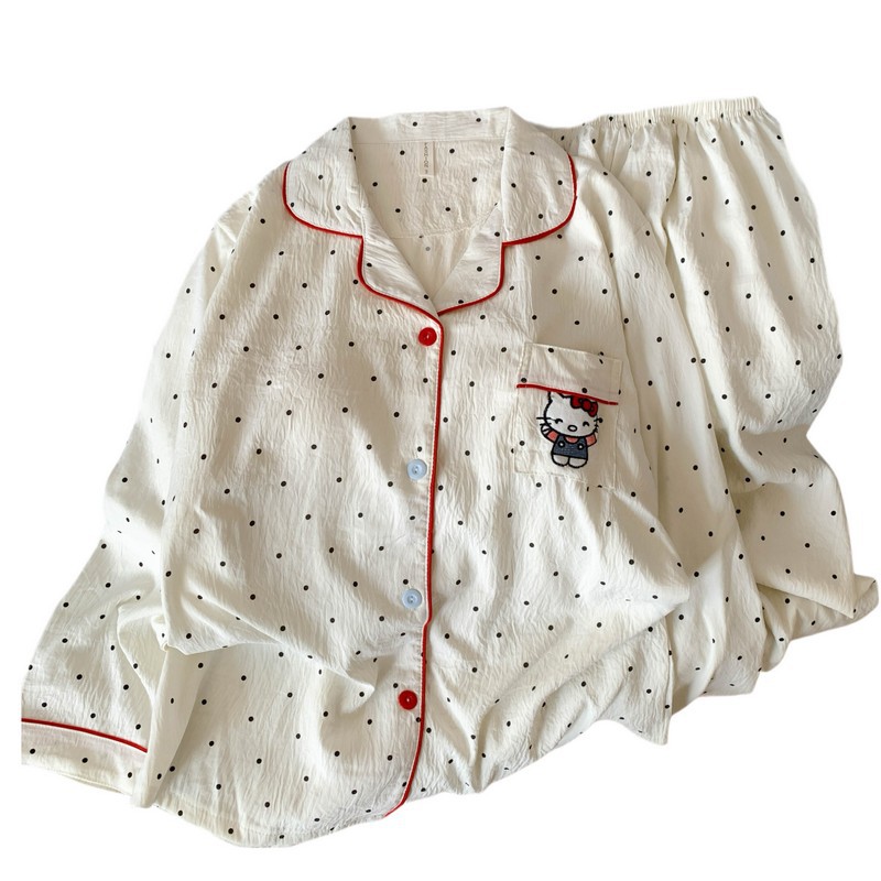 日系蝴蝶结KT猫大码睡衣女春秋季可爱波点家居服现货批发少女套装