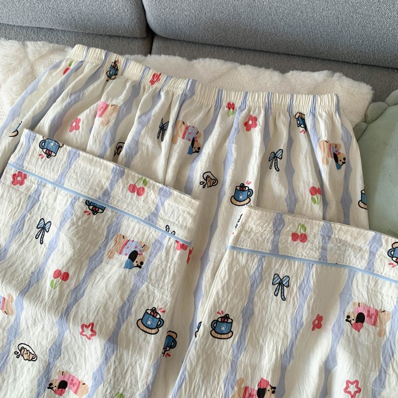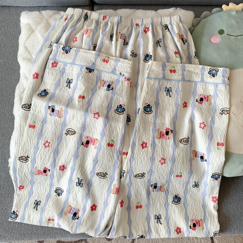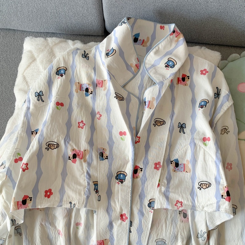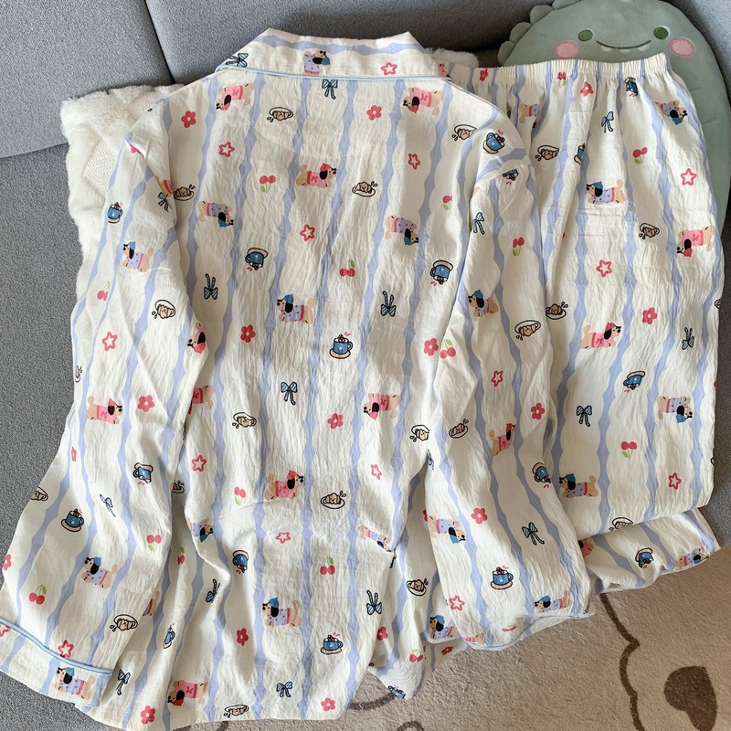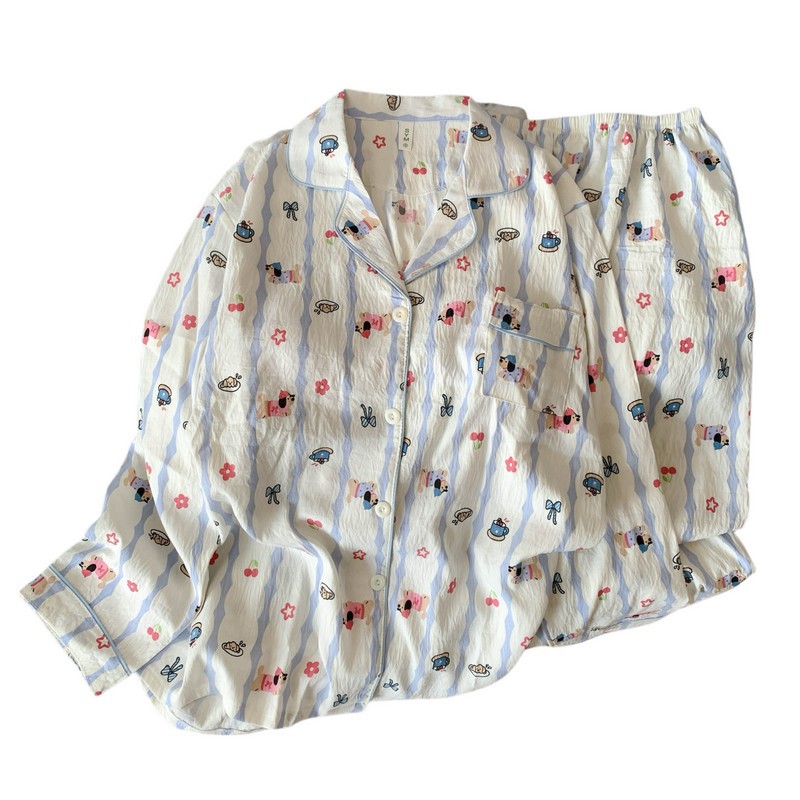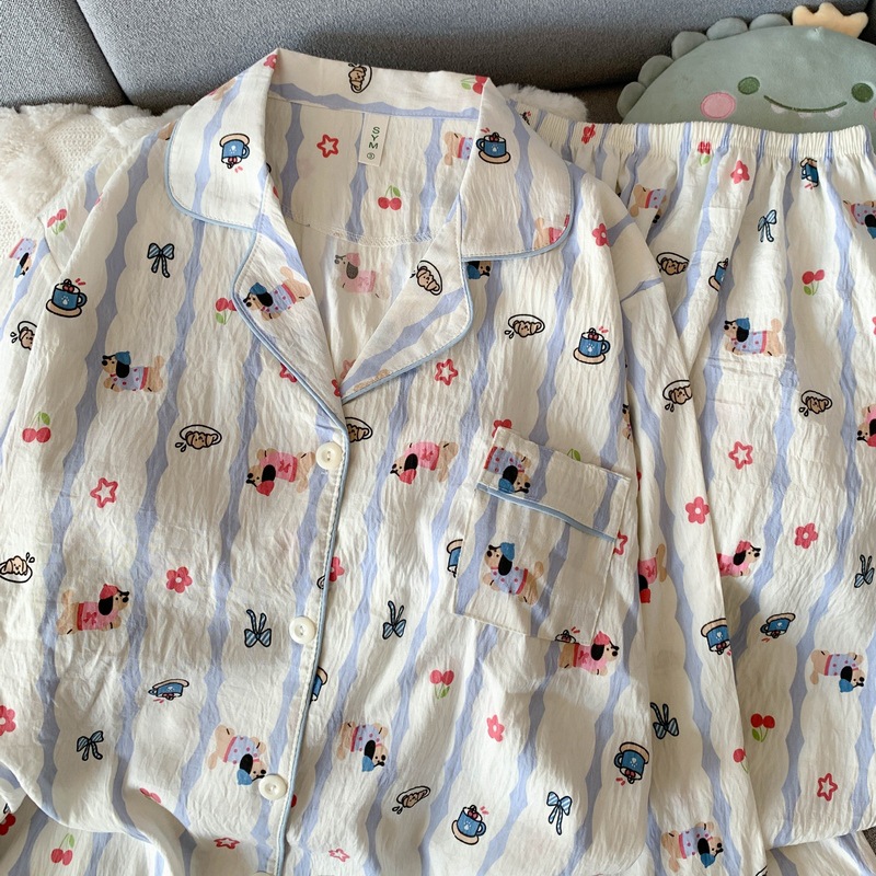 带胸垫大码睡衣女春秋卡通蓝色条纹腊肠狗可爱家居服现货批发套装