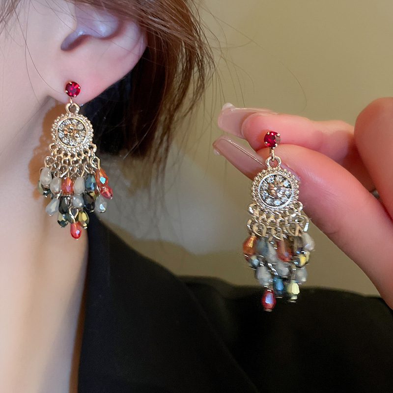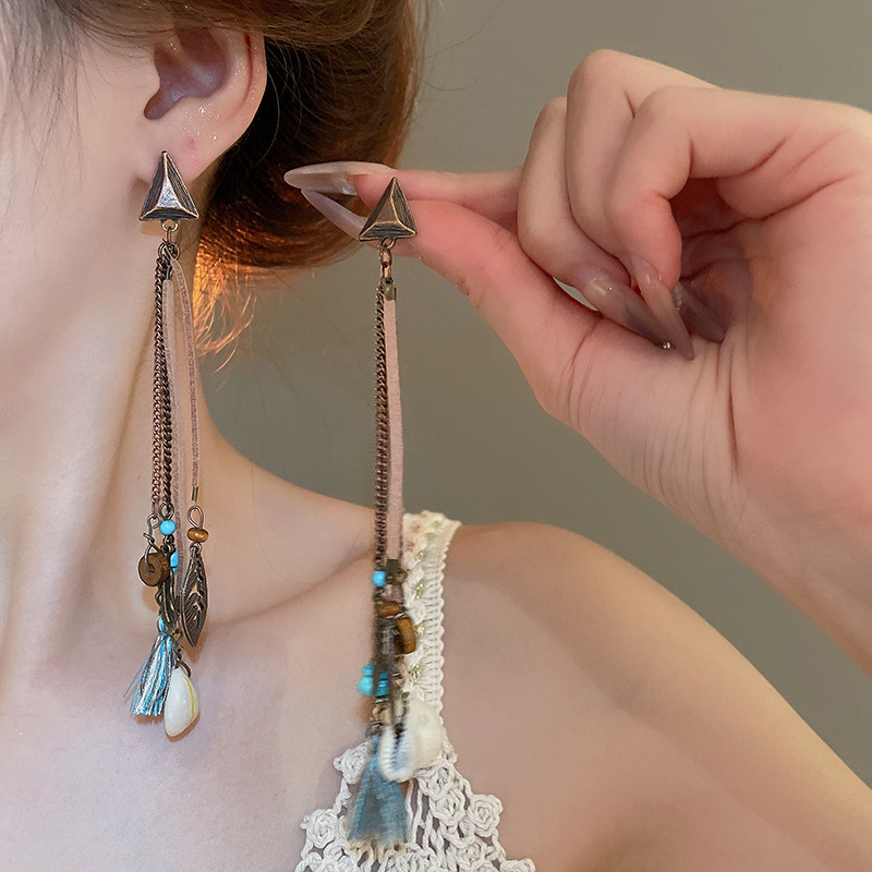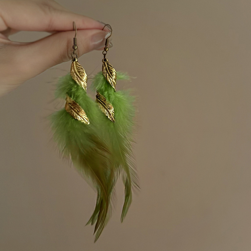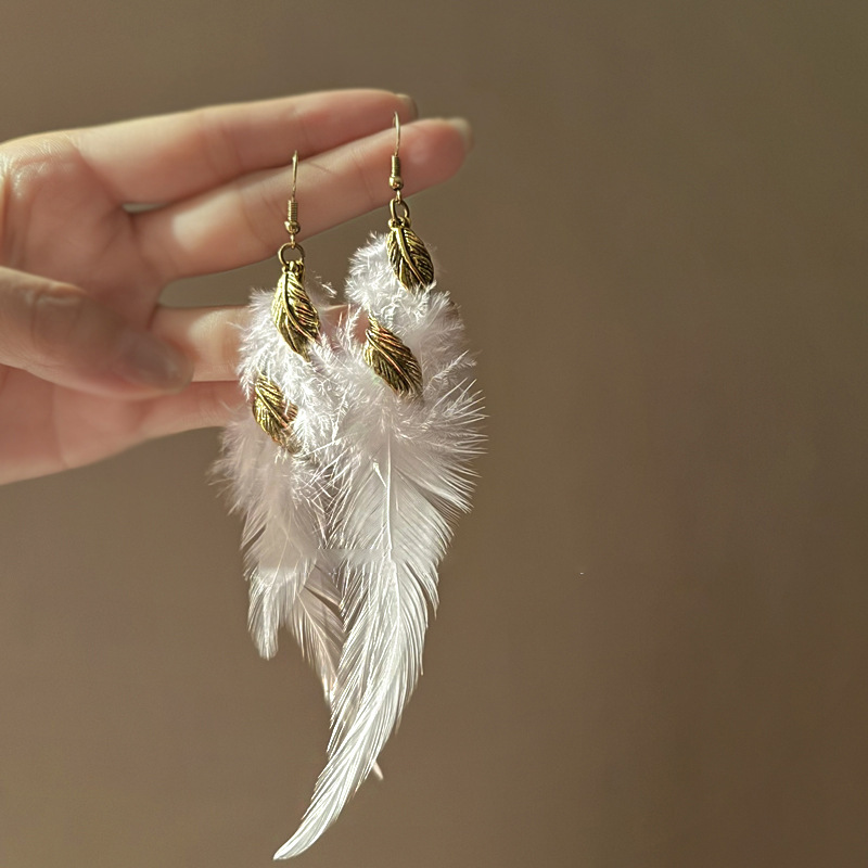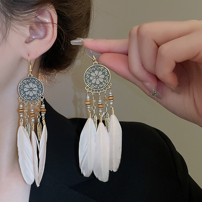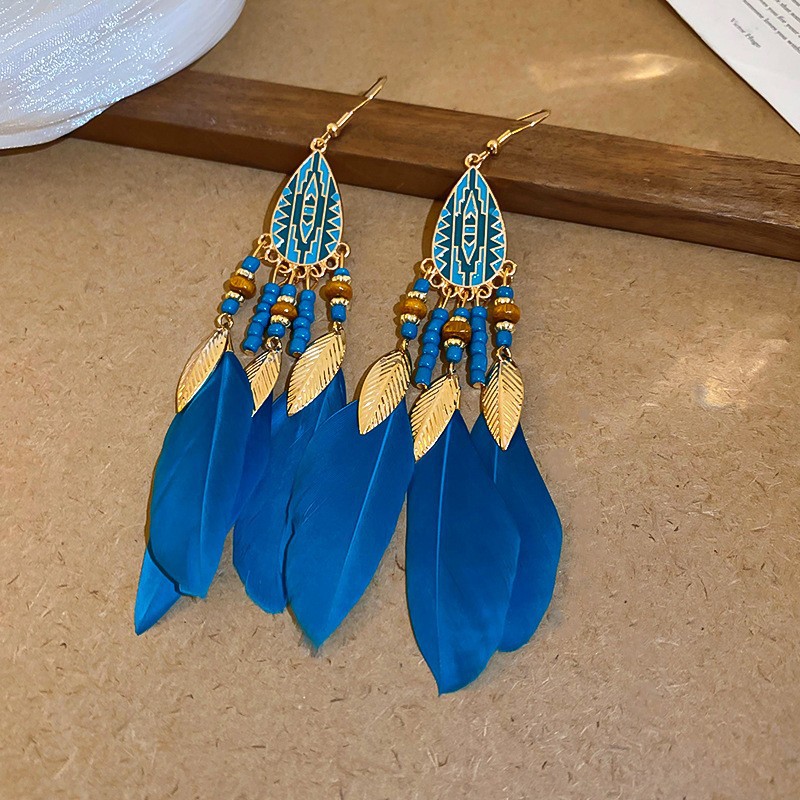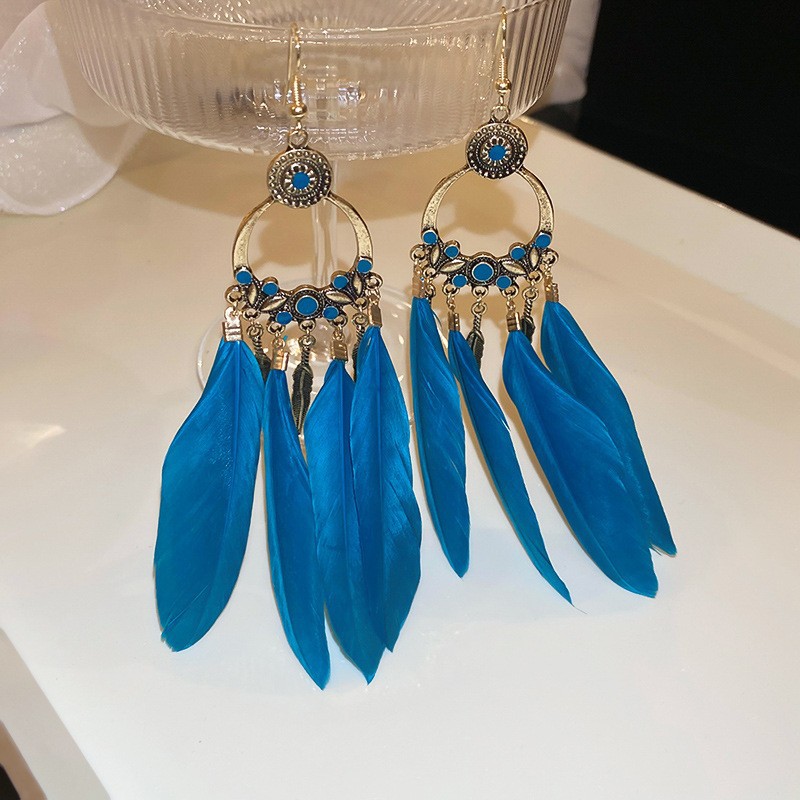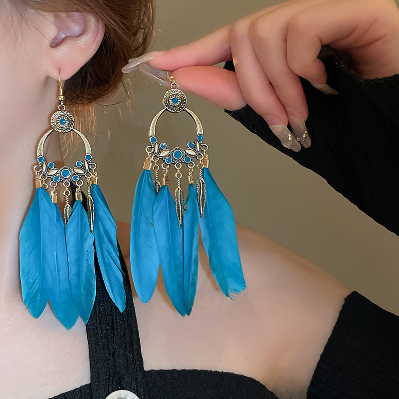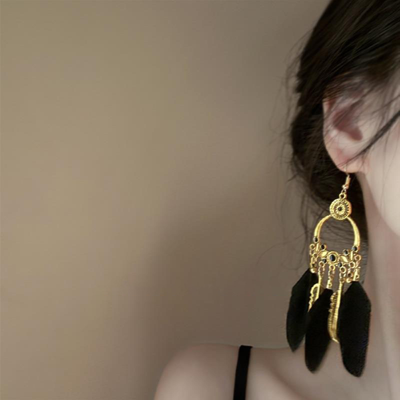 银针民族风人造水晶款羽毛流苏耳环个性设计耳坠复古轻奢通勤耳饰