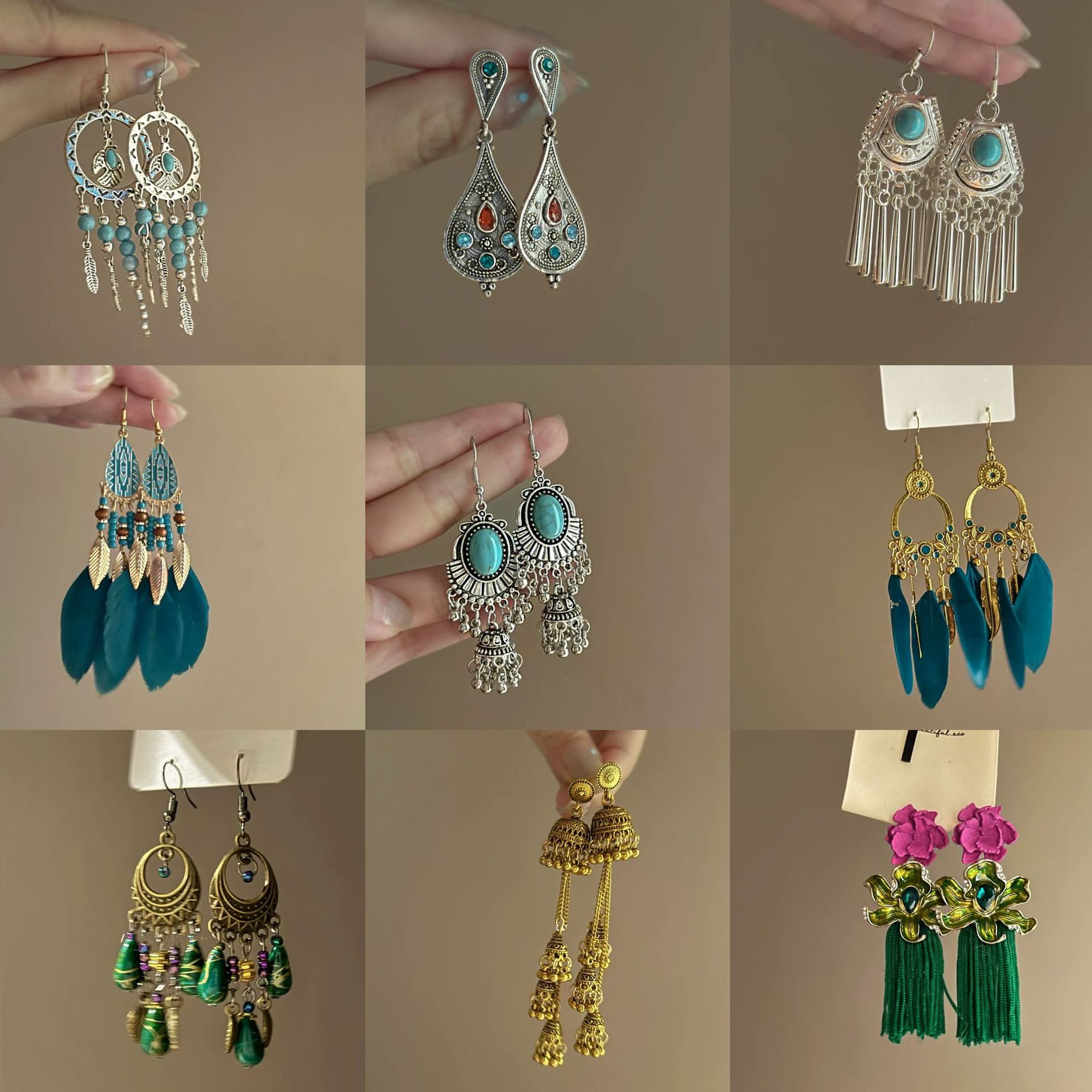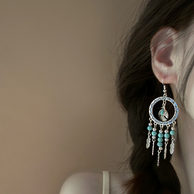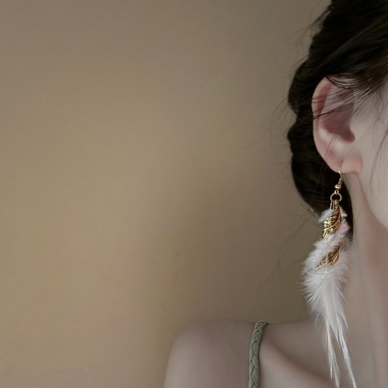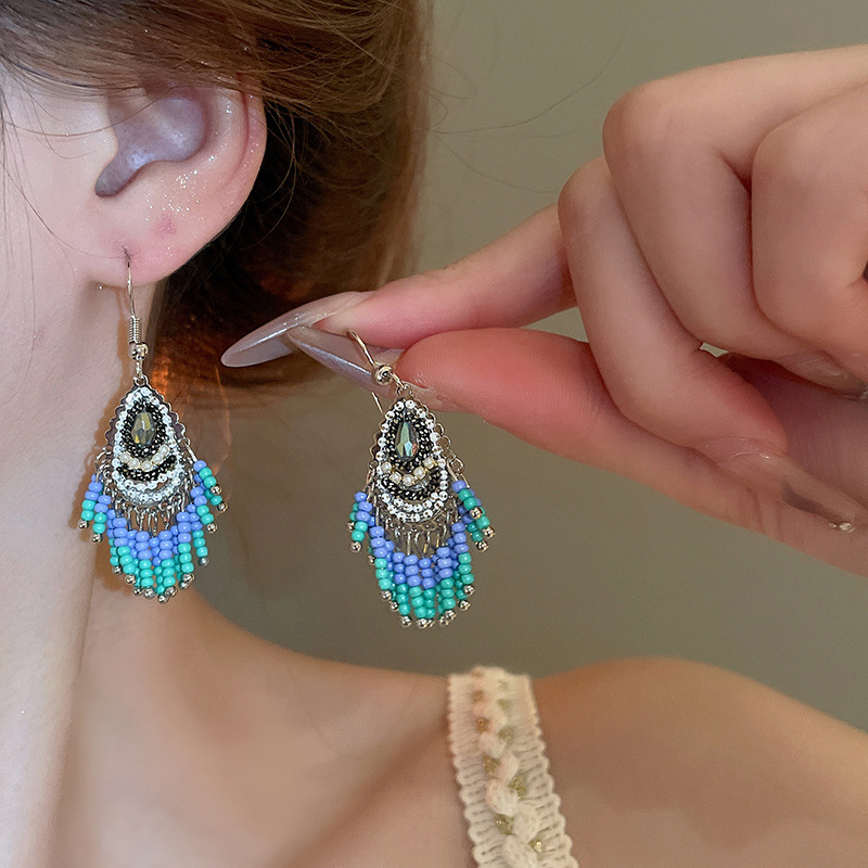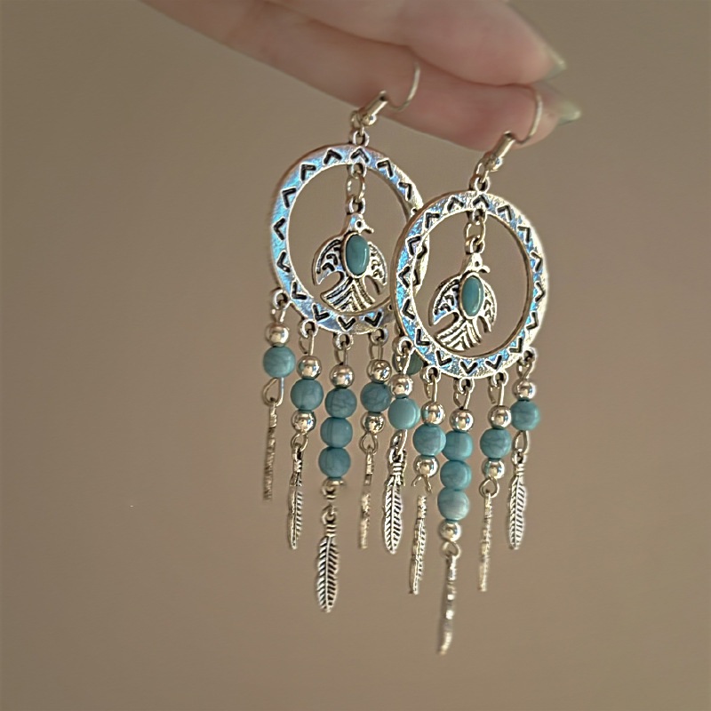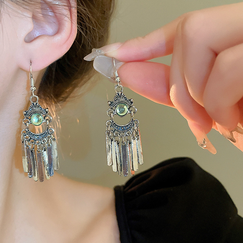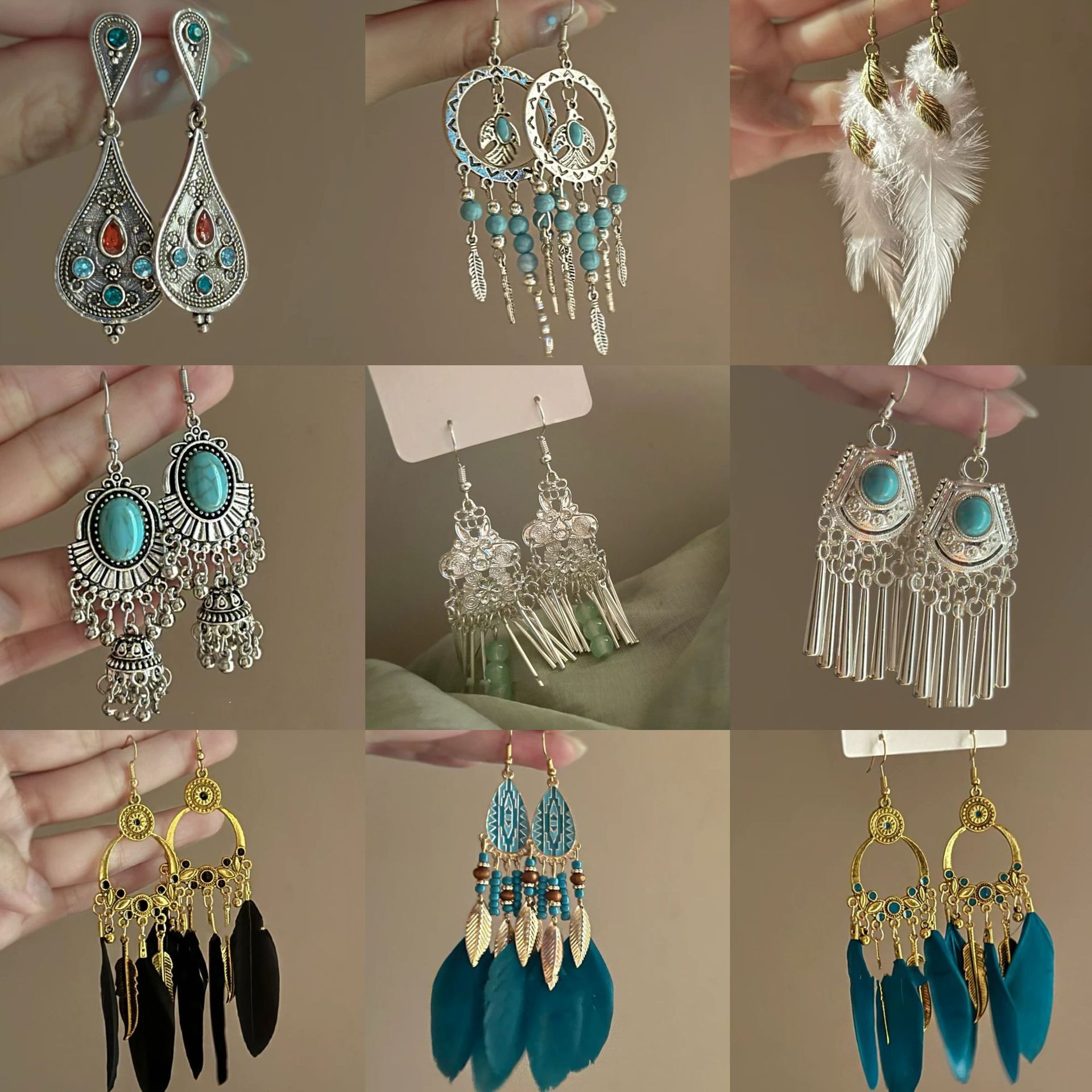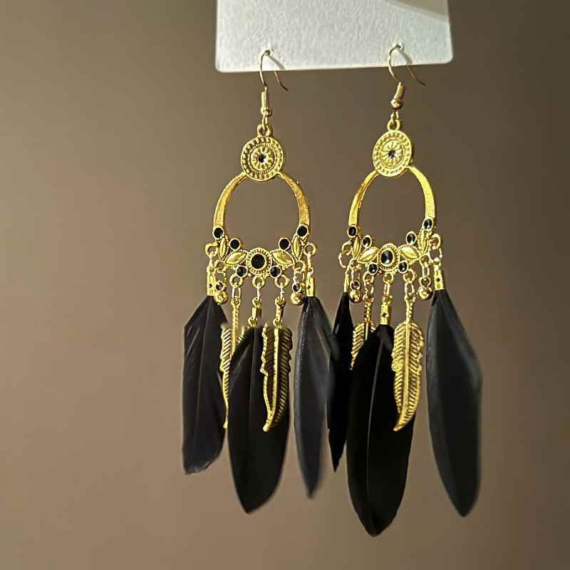 银针民族风人造水晶款羽毛流苏耳环个性设计耳坠复古轻奢通勤耳饰