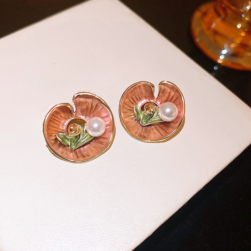真金电镀法式珍珠花朵耳钉宫廷风复古小众耳环轻奢高级耳饰批发女