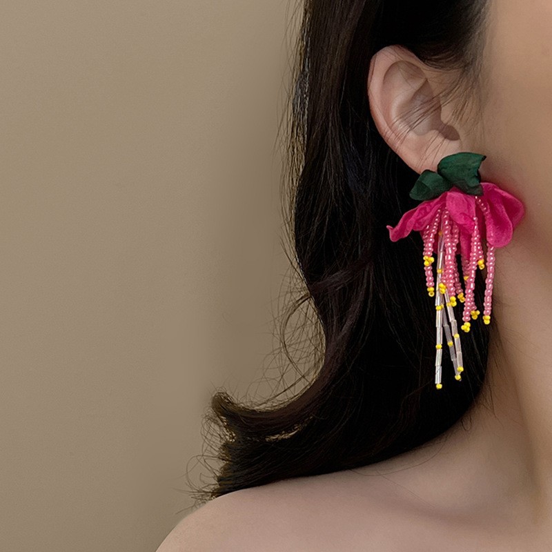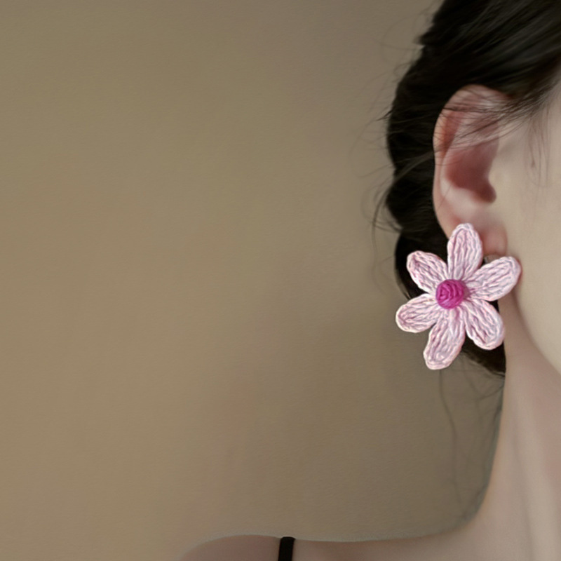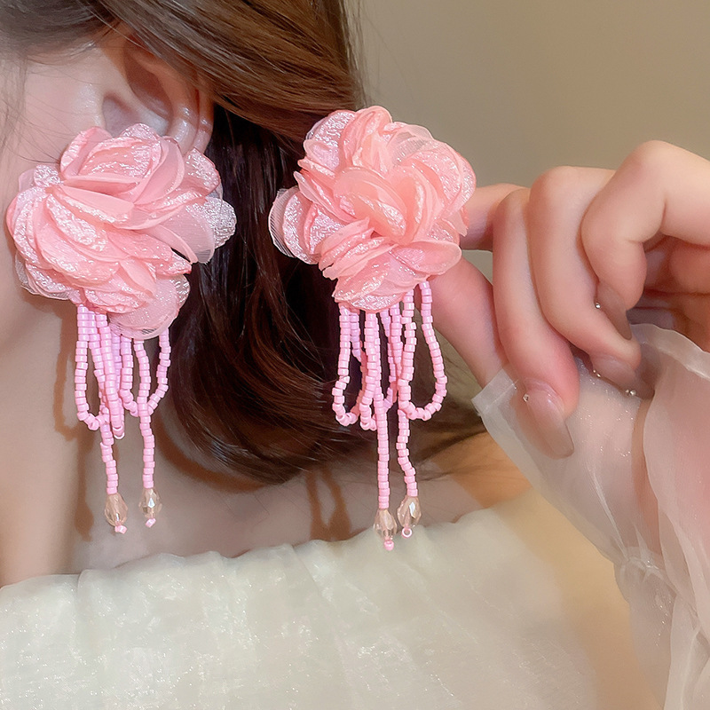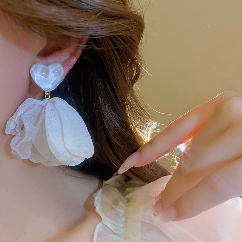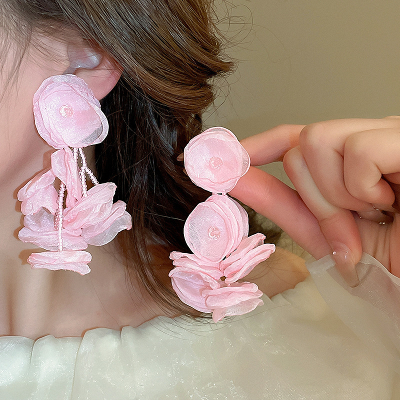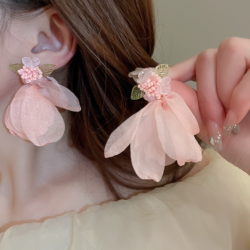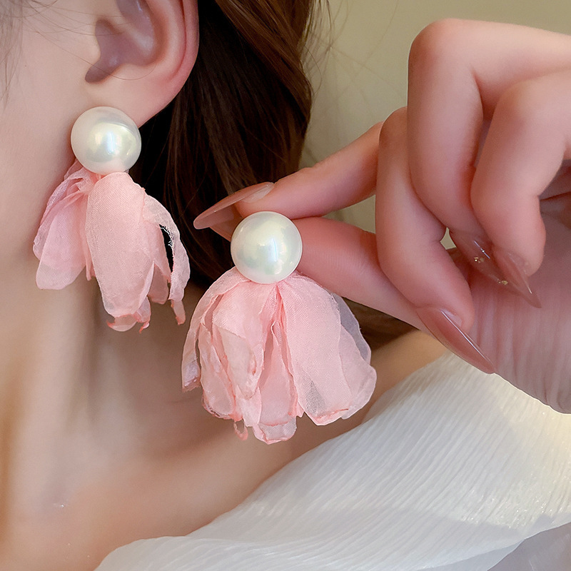 银针超仙氛围感网纱彩花珍珠耳环森系百搭耳坠少女心甜美清新耳饰