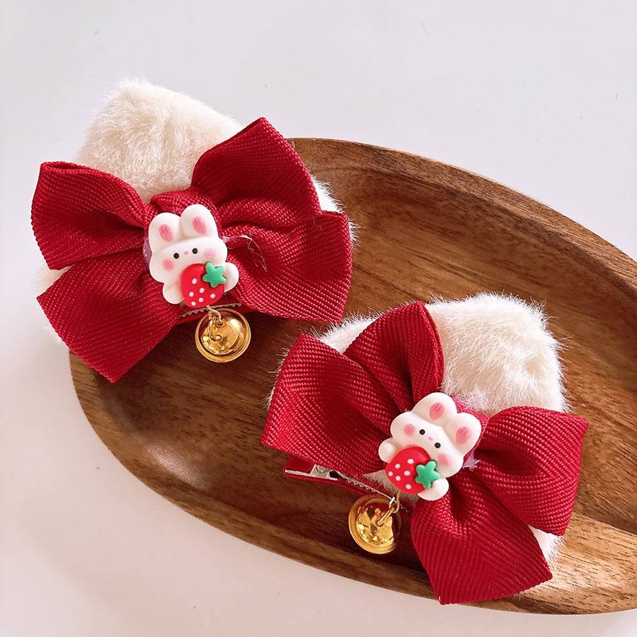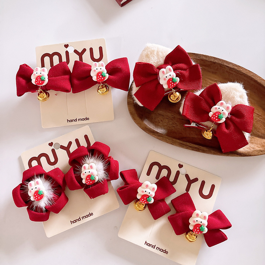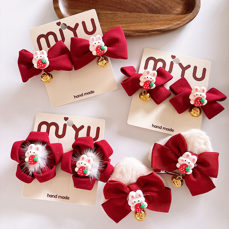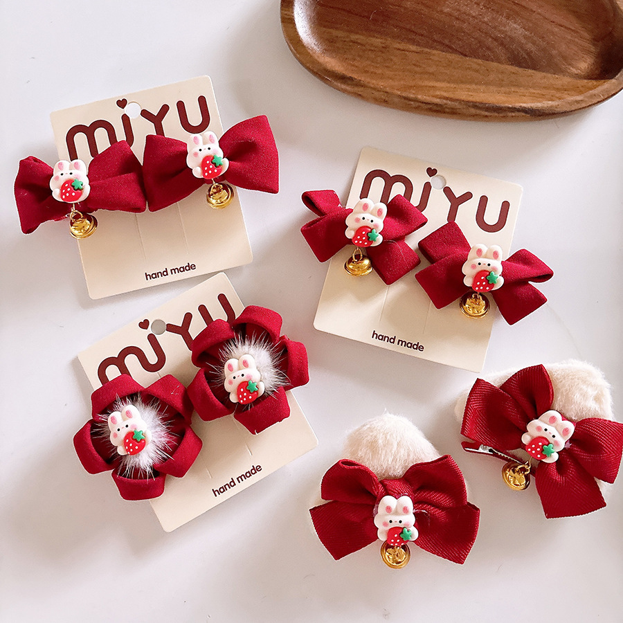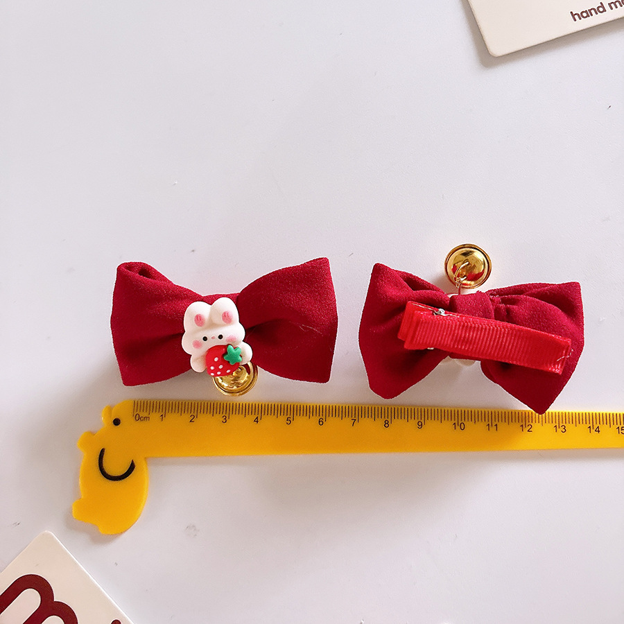 秋冬酒红色布艺立体蝴蝶结儿童铃铛对夹全包兔子发卡女童新年发饰