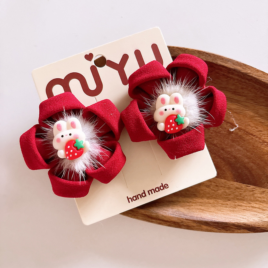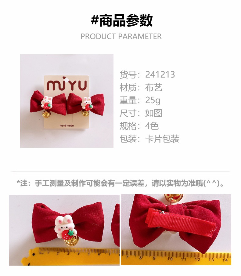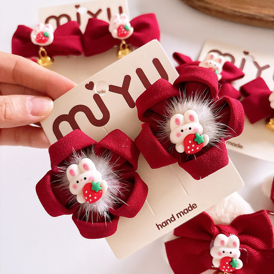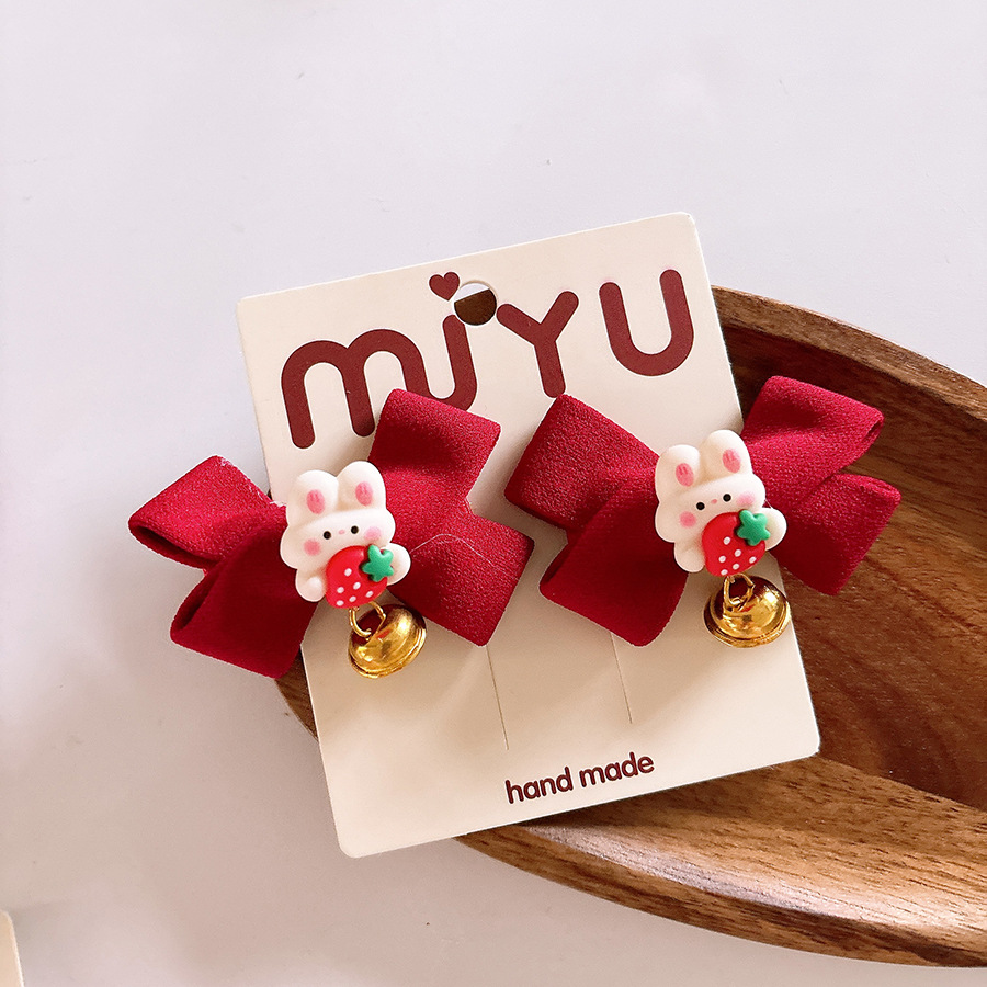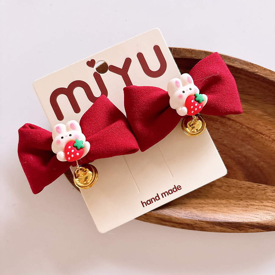 秋冬酒红色布艺立体蝴蝶结儿童铃铛对夹全包兔子发卡女童新年发饰