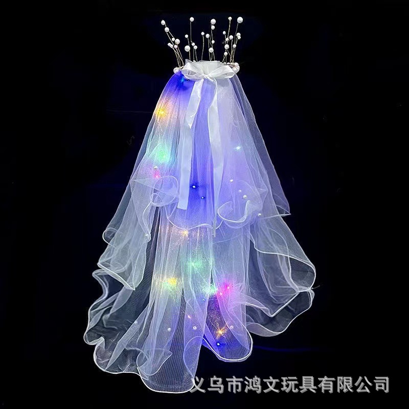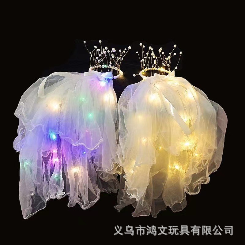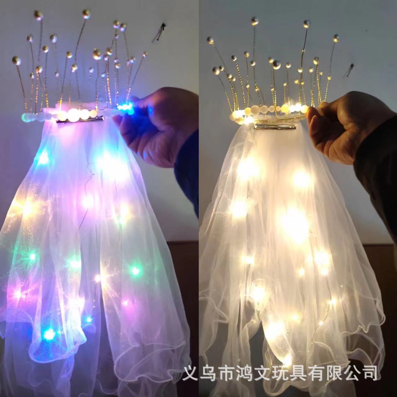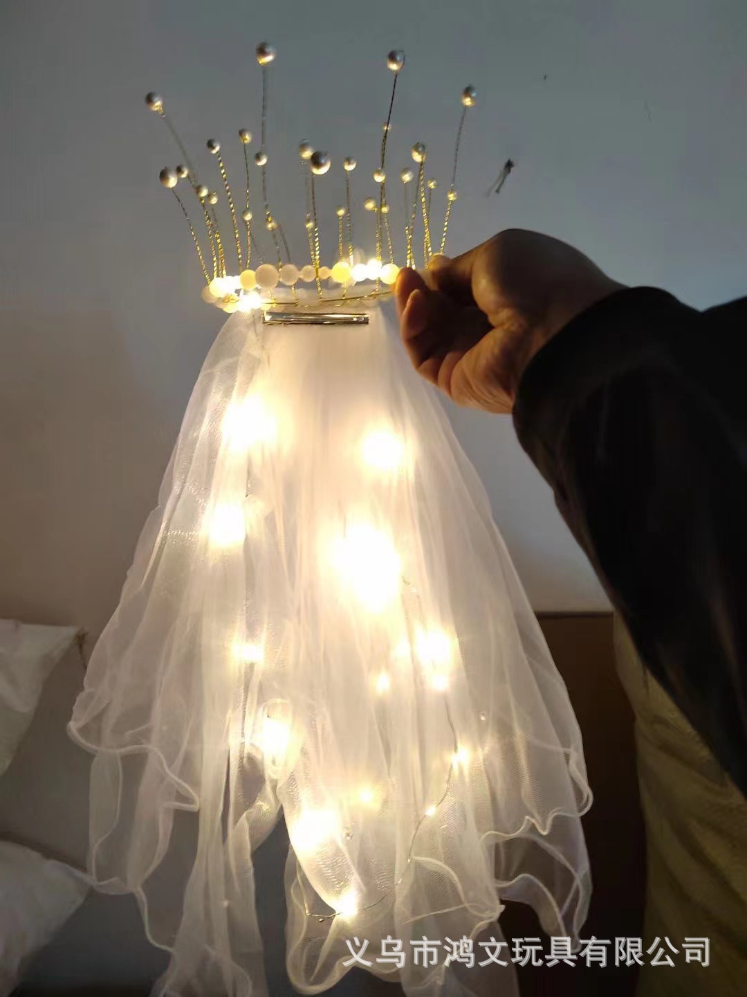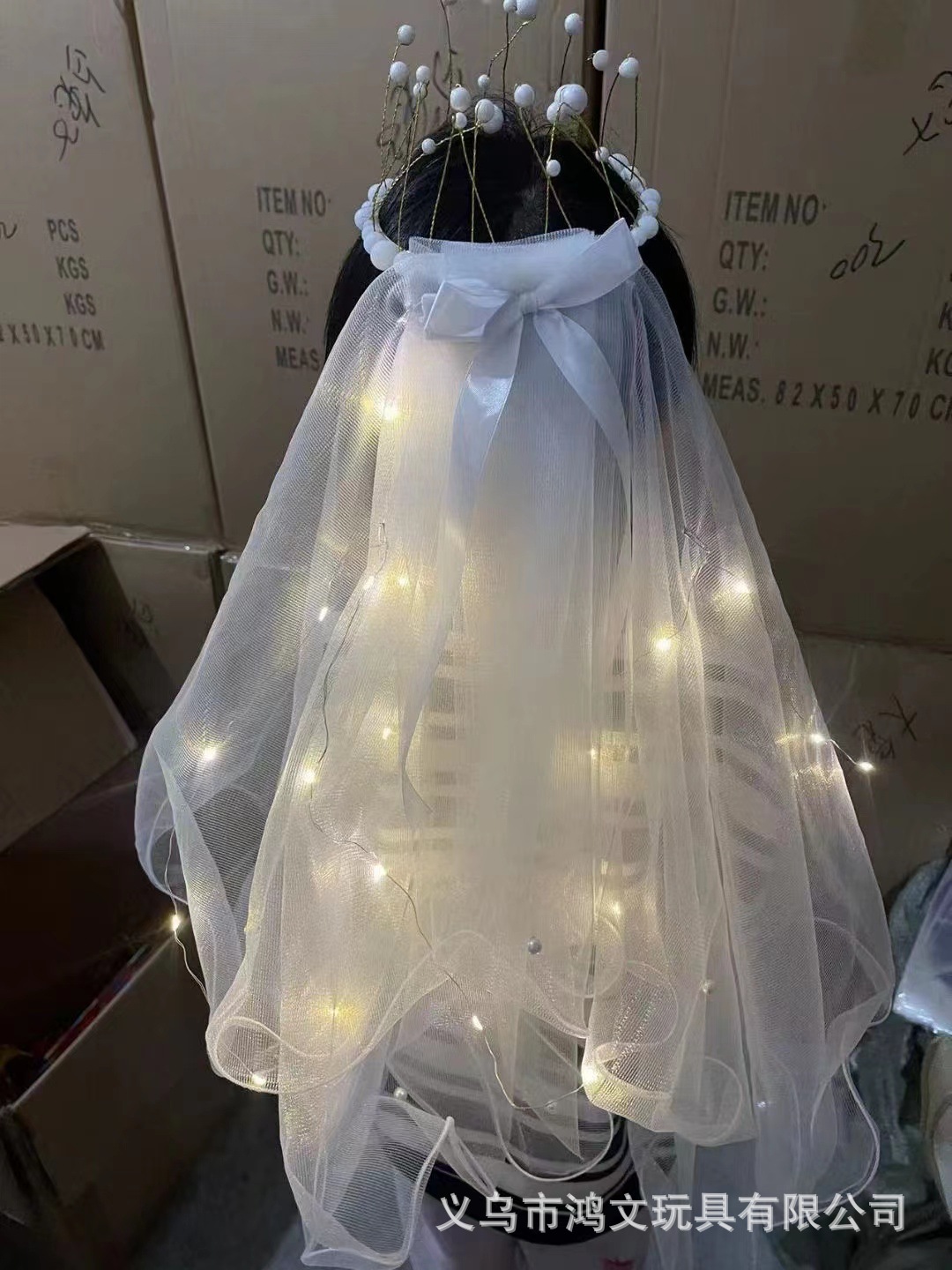 网红发光头纱珍珠皇冠头纱拍照领证生日装扮儿童头纱夜市地摊批发