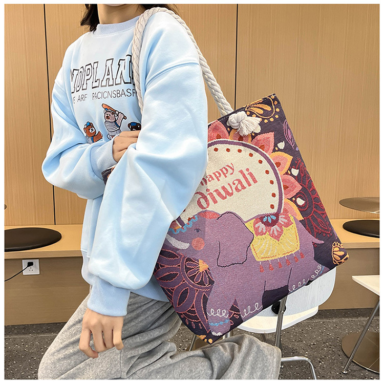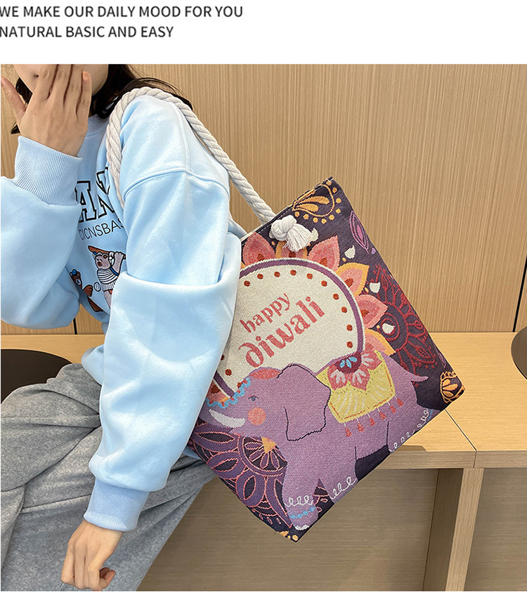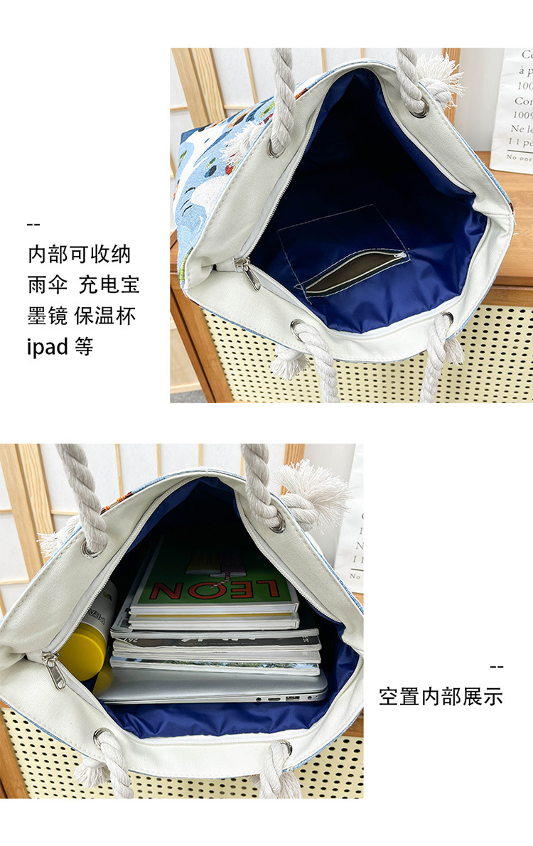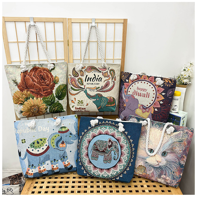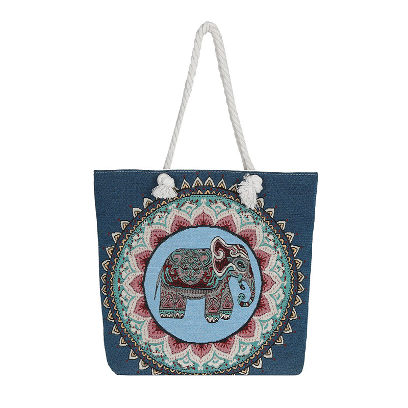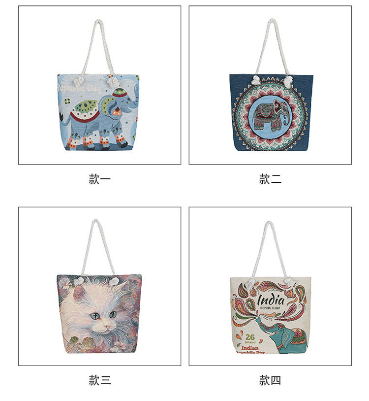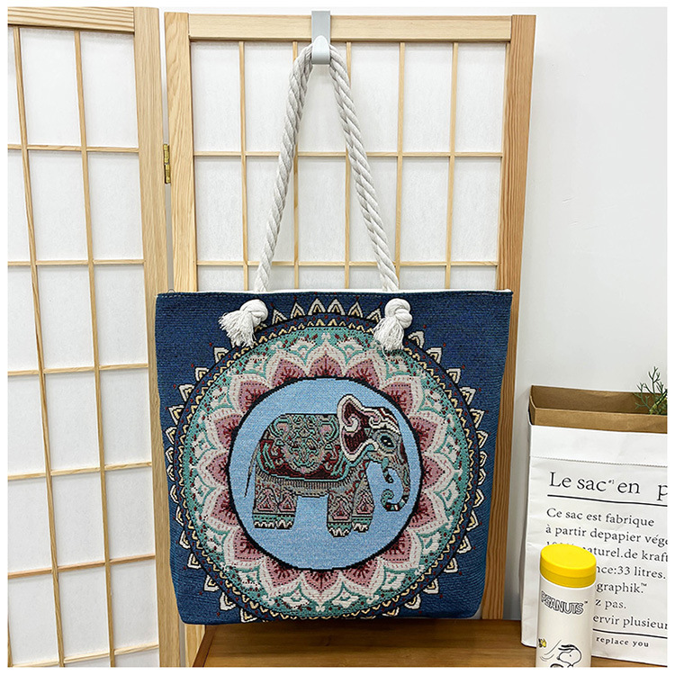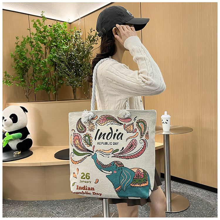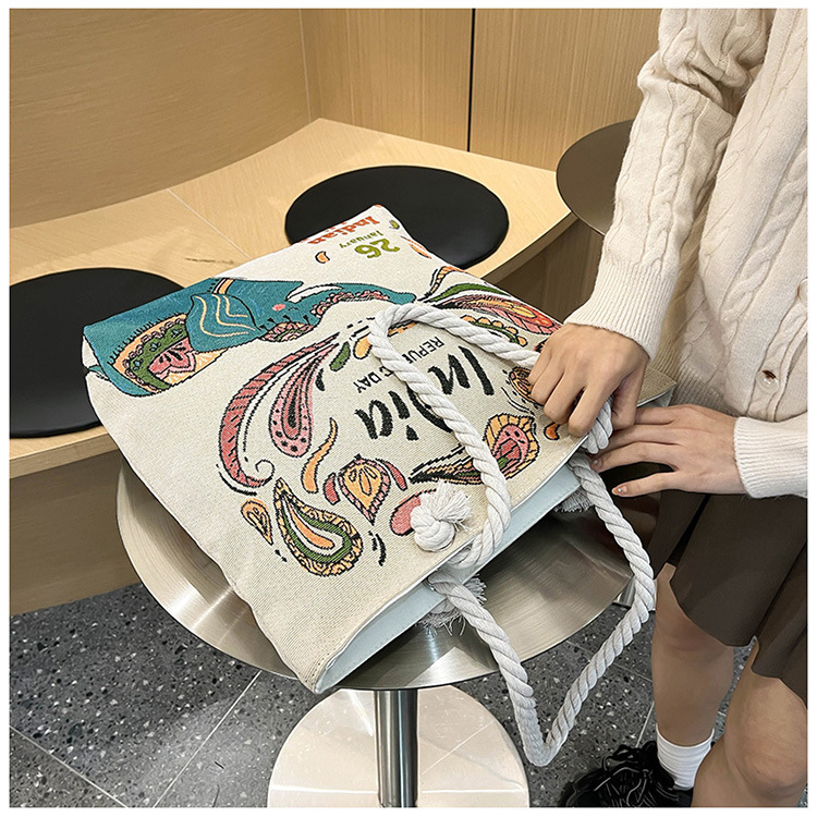 时尚民族风绣花托特包女粗麻绳单肩包亚麻刺绣帆布包大容量妈咪包