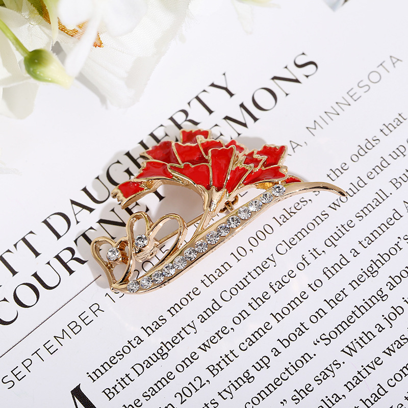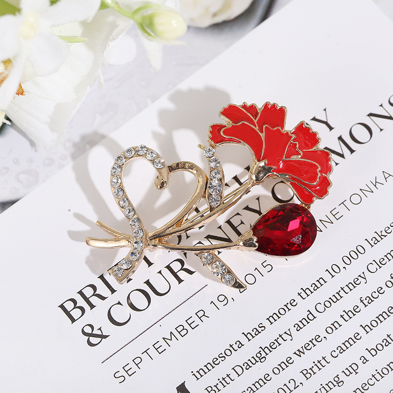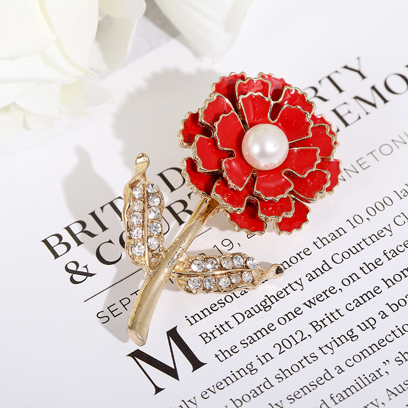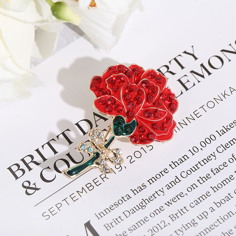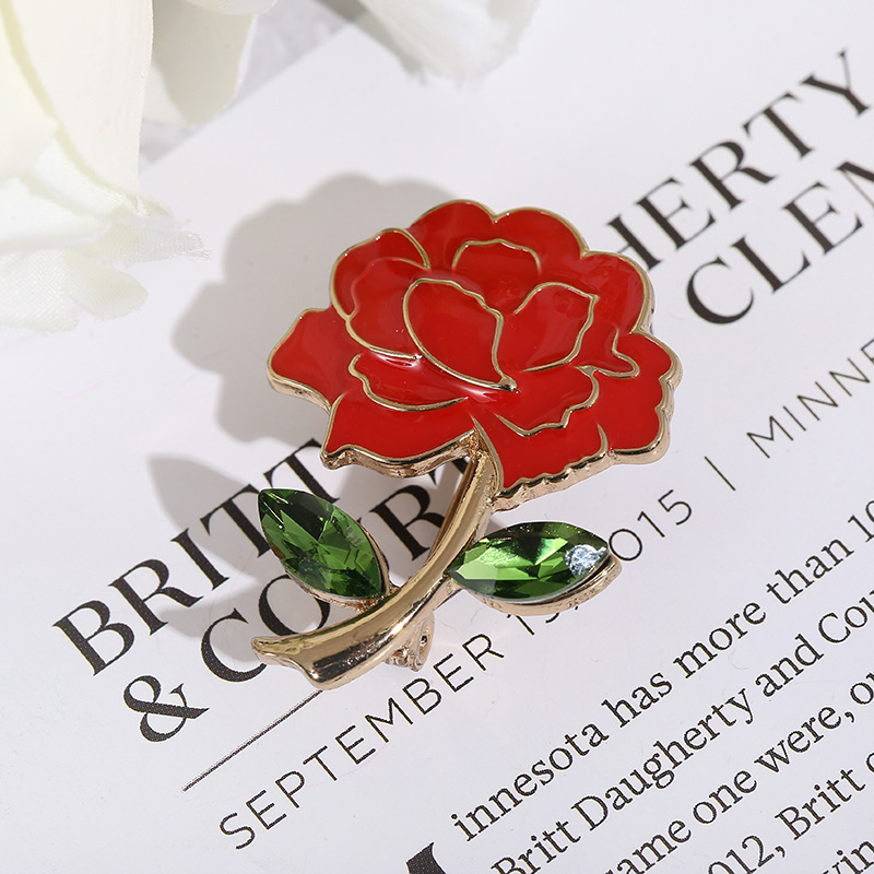 新款复古蔷薇花胸针红色高档防走光花朵别针欧美镶钻精致女士胸针