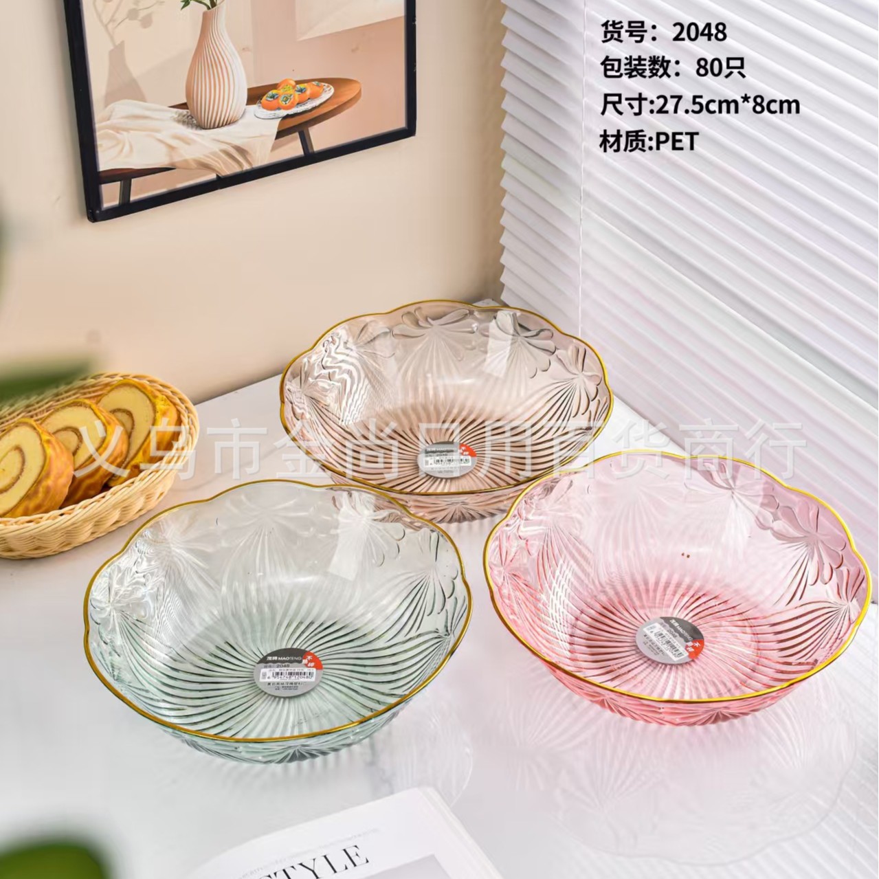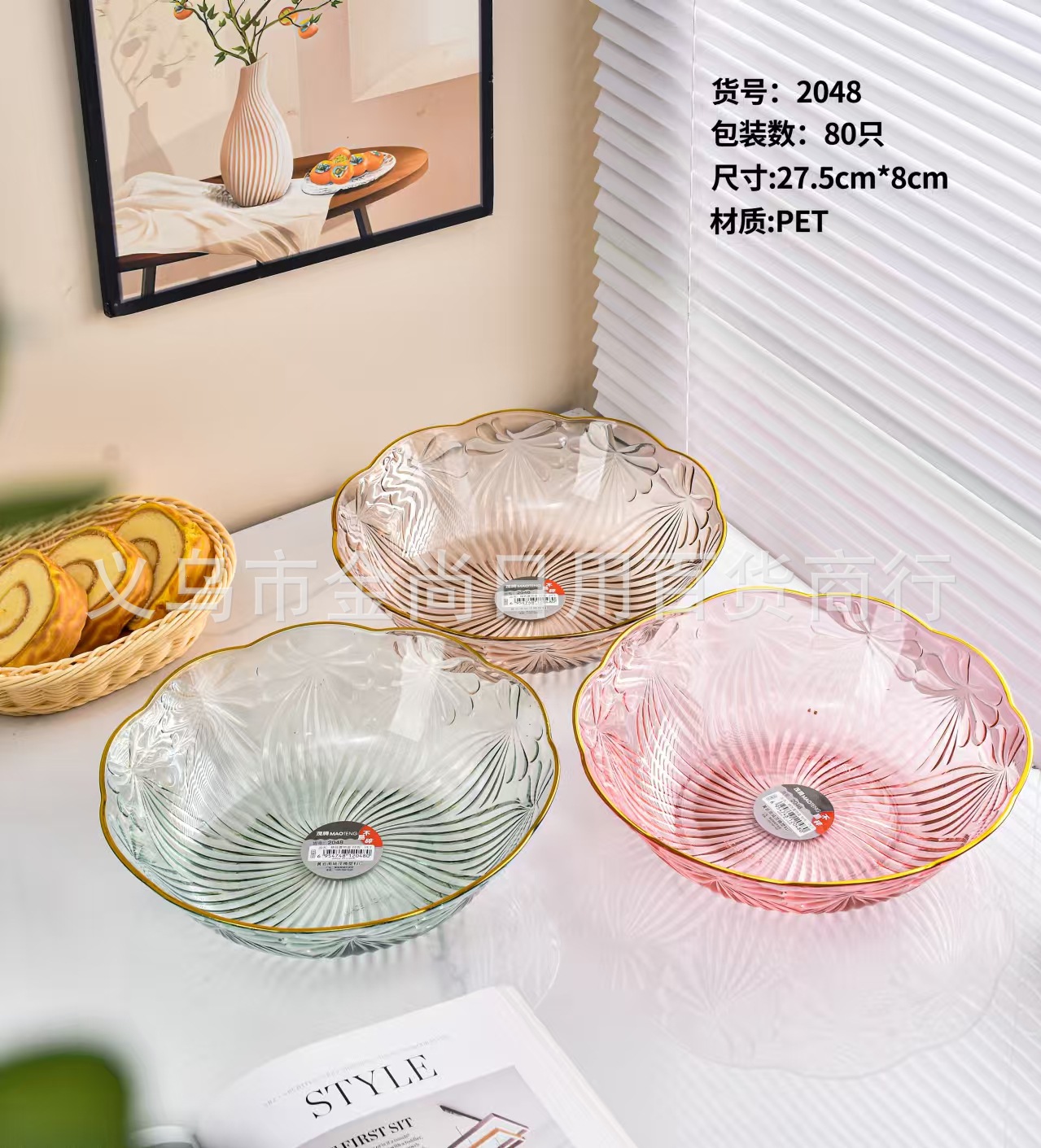 轻奢PET透明圆形果盘金边提手水果盘客厅茶几零食盘子坚果盘批发