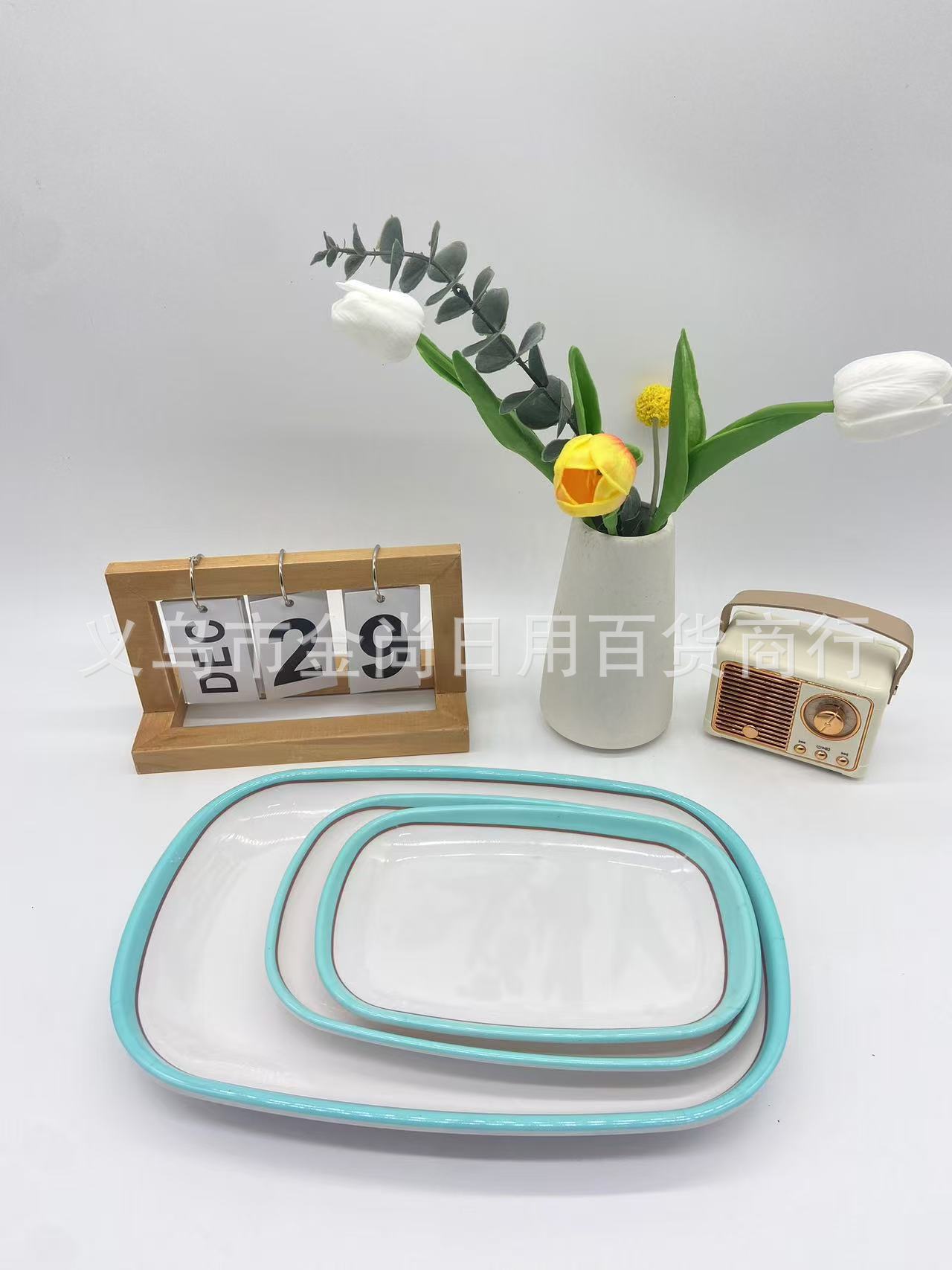 密胺双色方形盘子塑料小吃凉菜盘子仿瓷椭圆形鱼盘大排档饭店炒菜