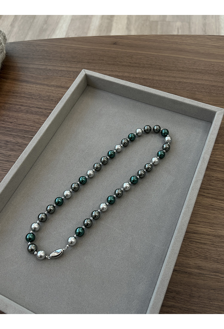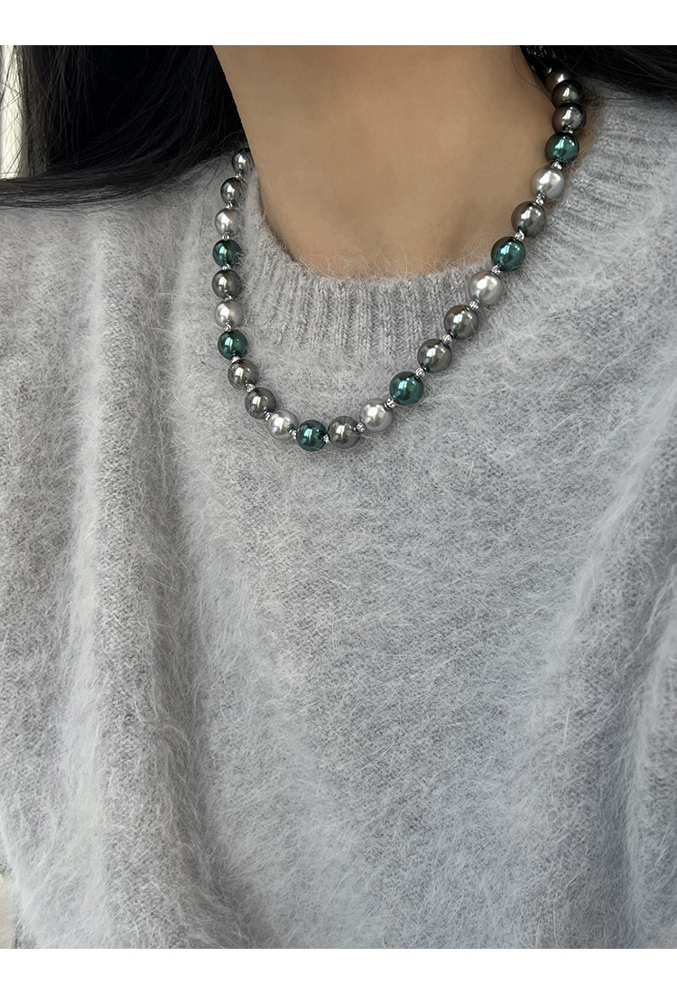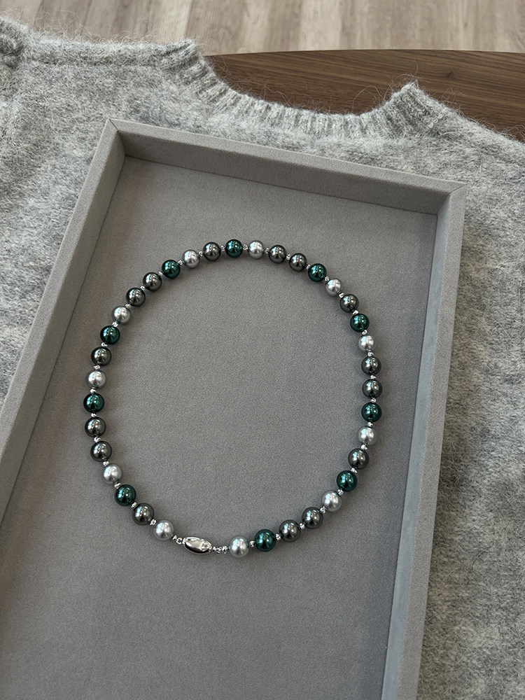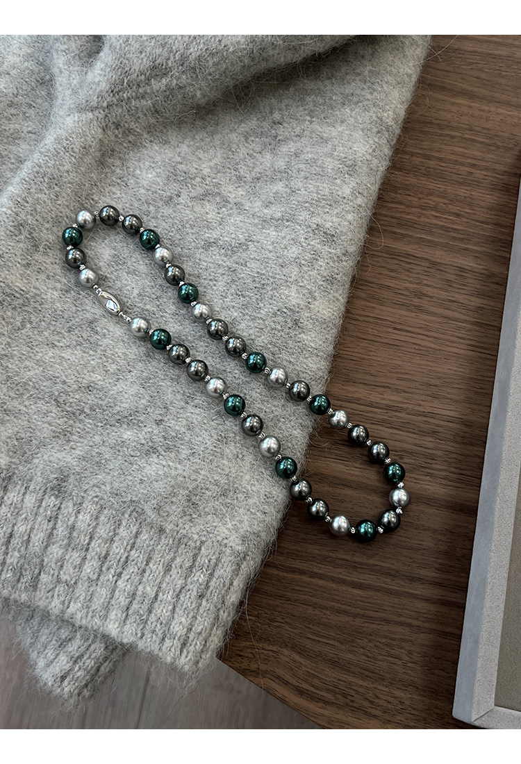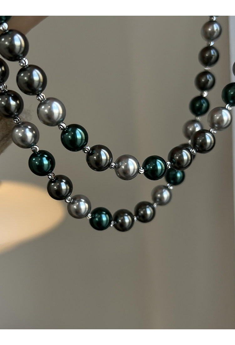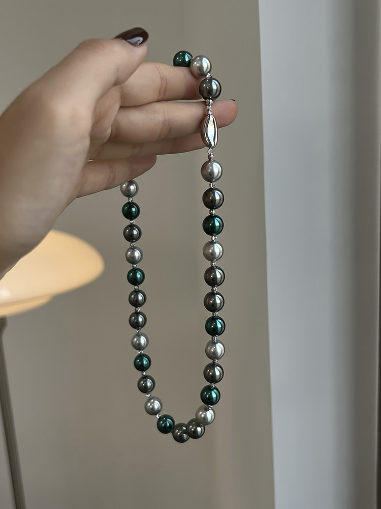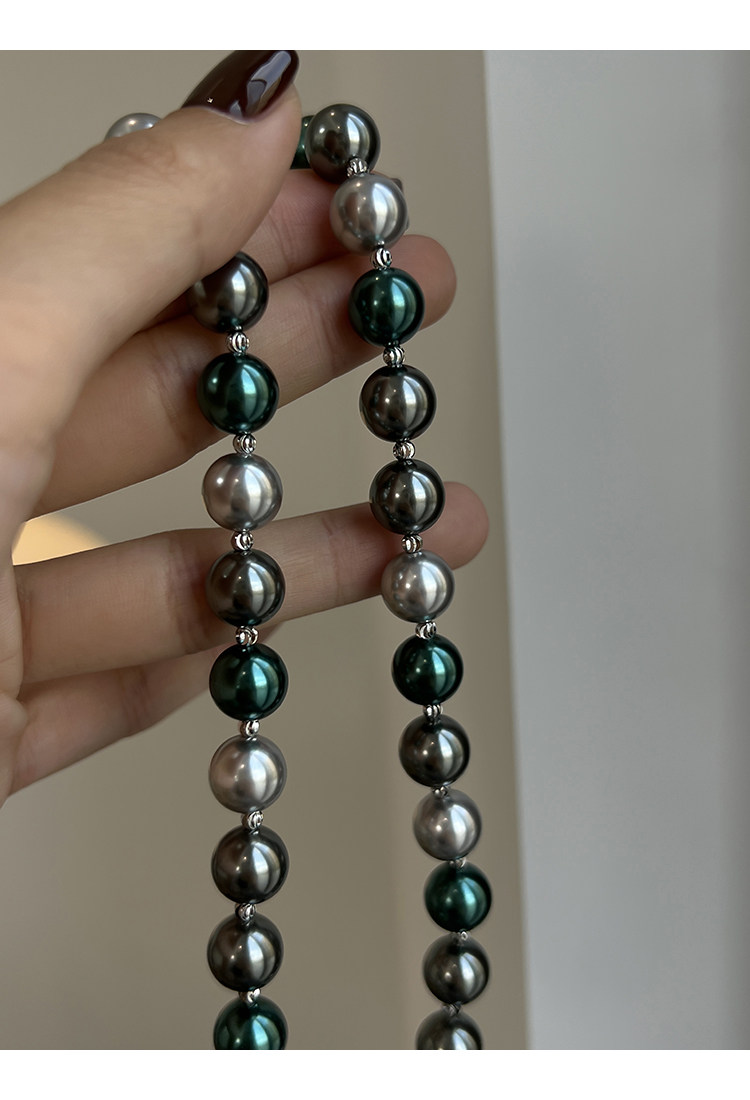 秋冬孔雀绿色混彩珍珠元宝扣打结项链高级感轻奢毛衣链女