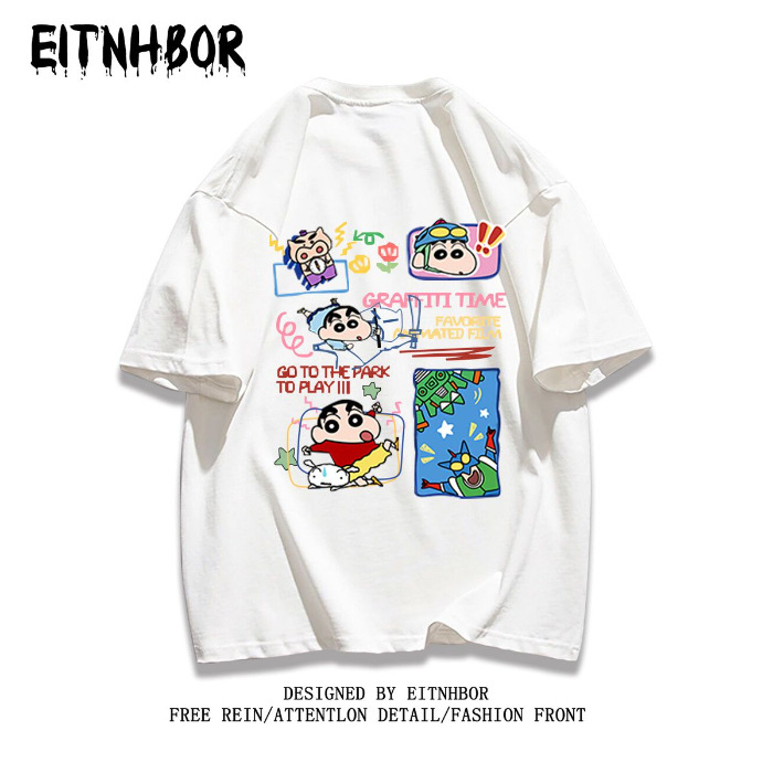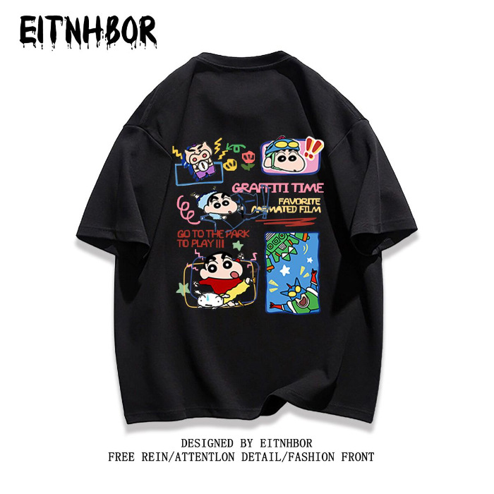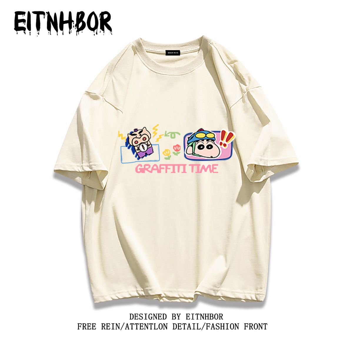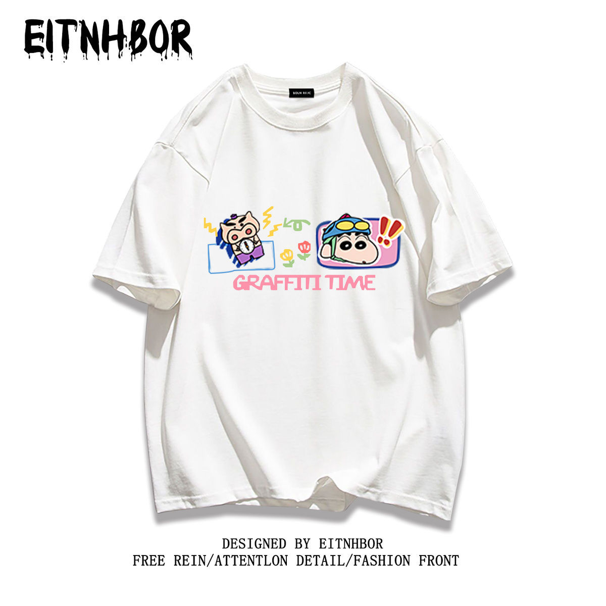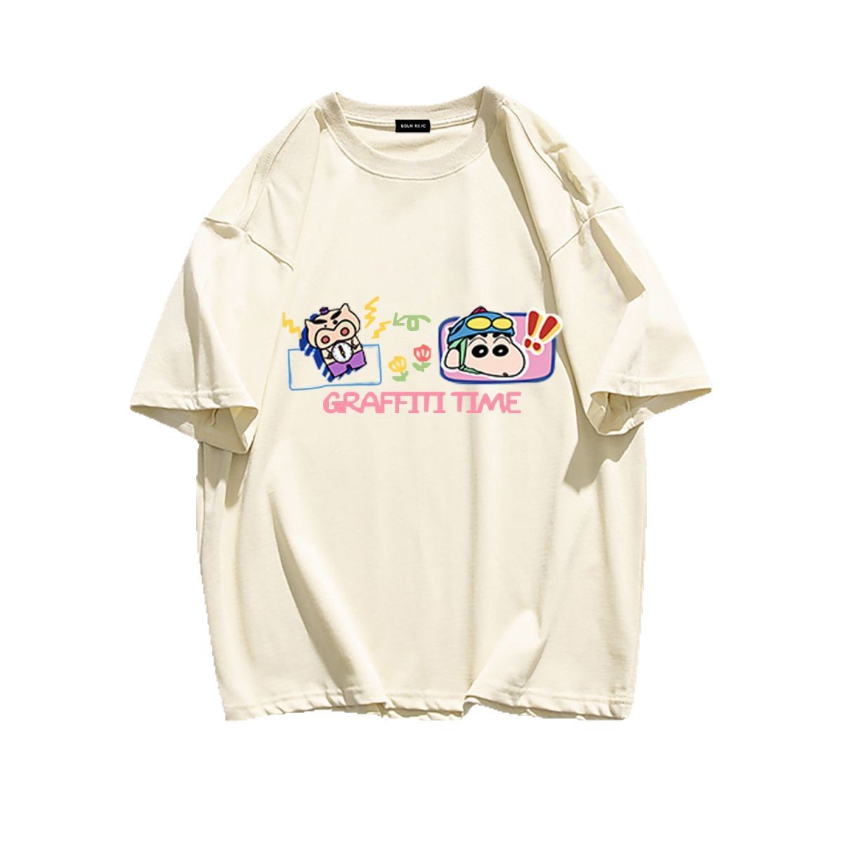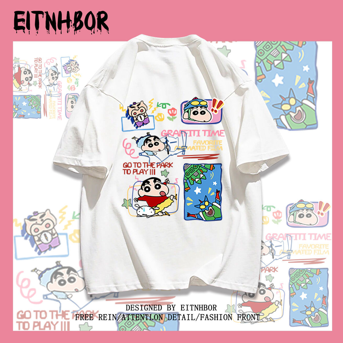 跨境东南亚台湾2025夏新款短袖T恤女蜡笔小新卡通印花上衣素色踢