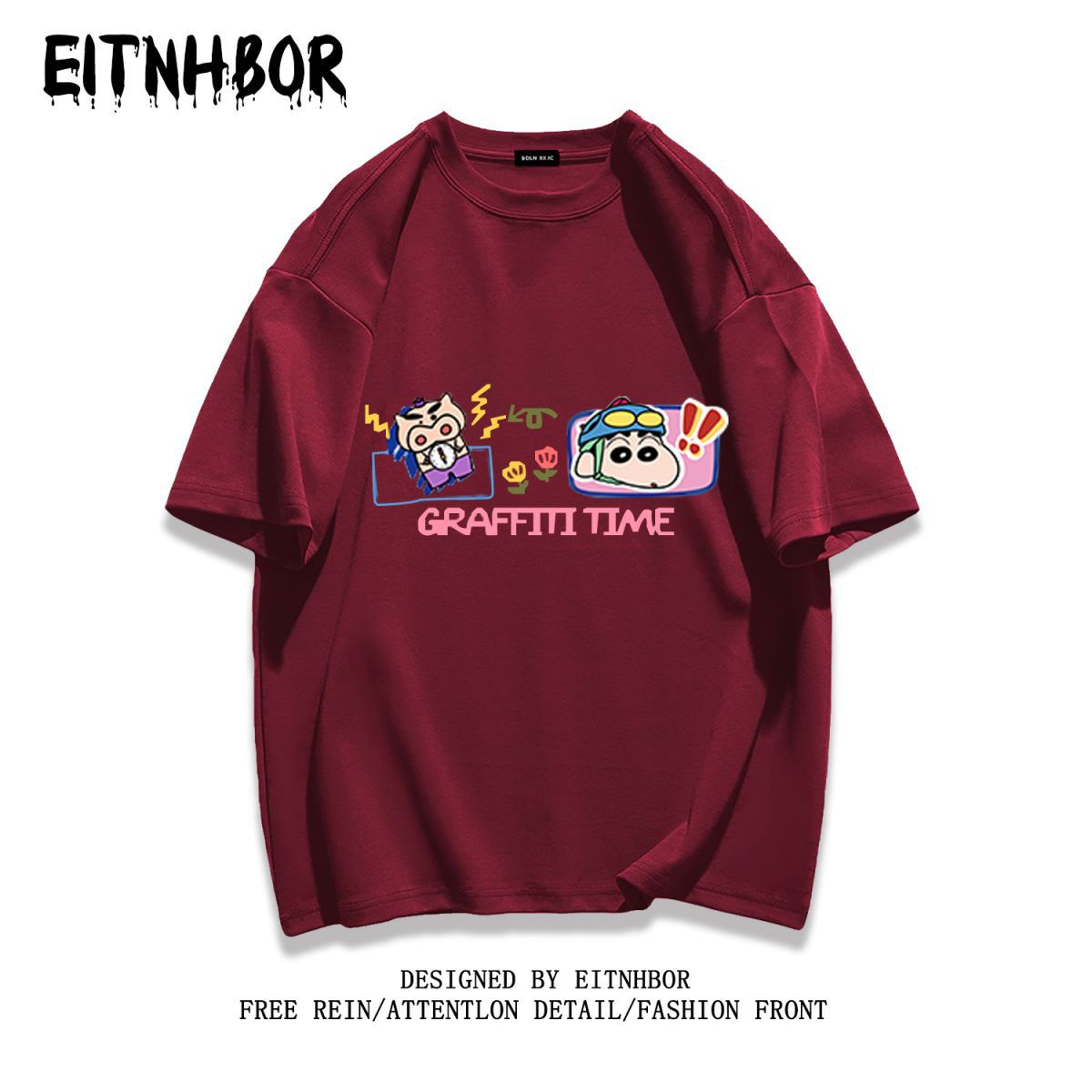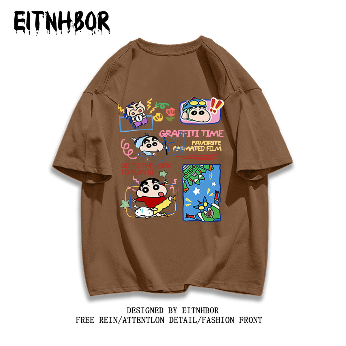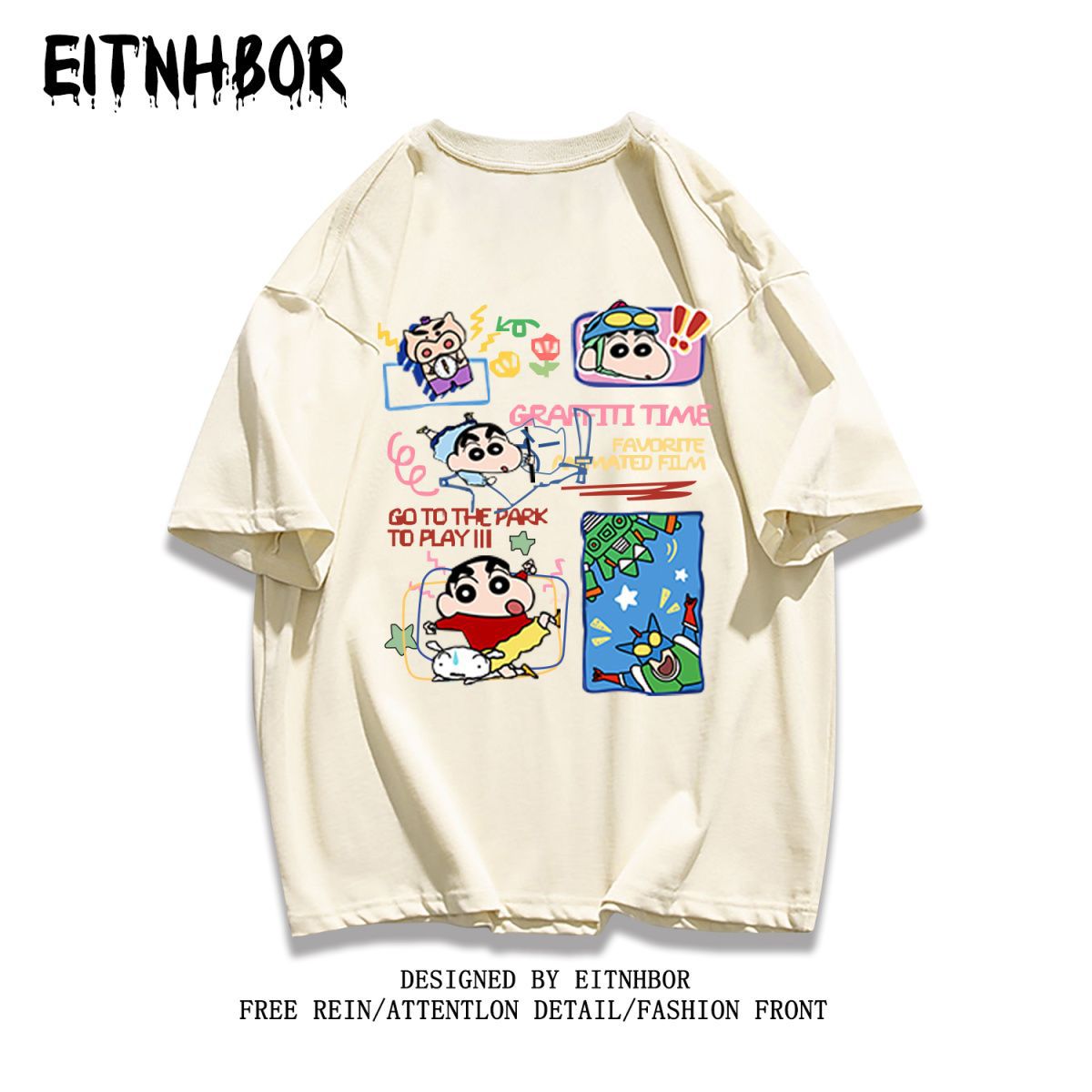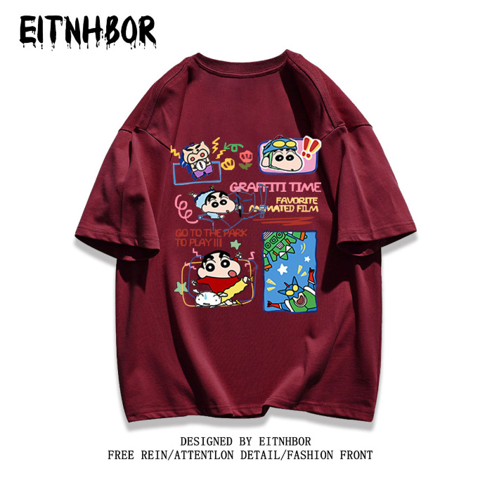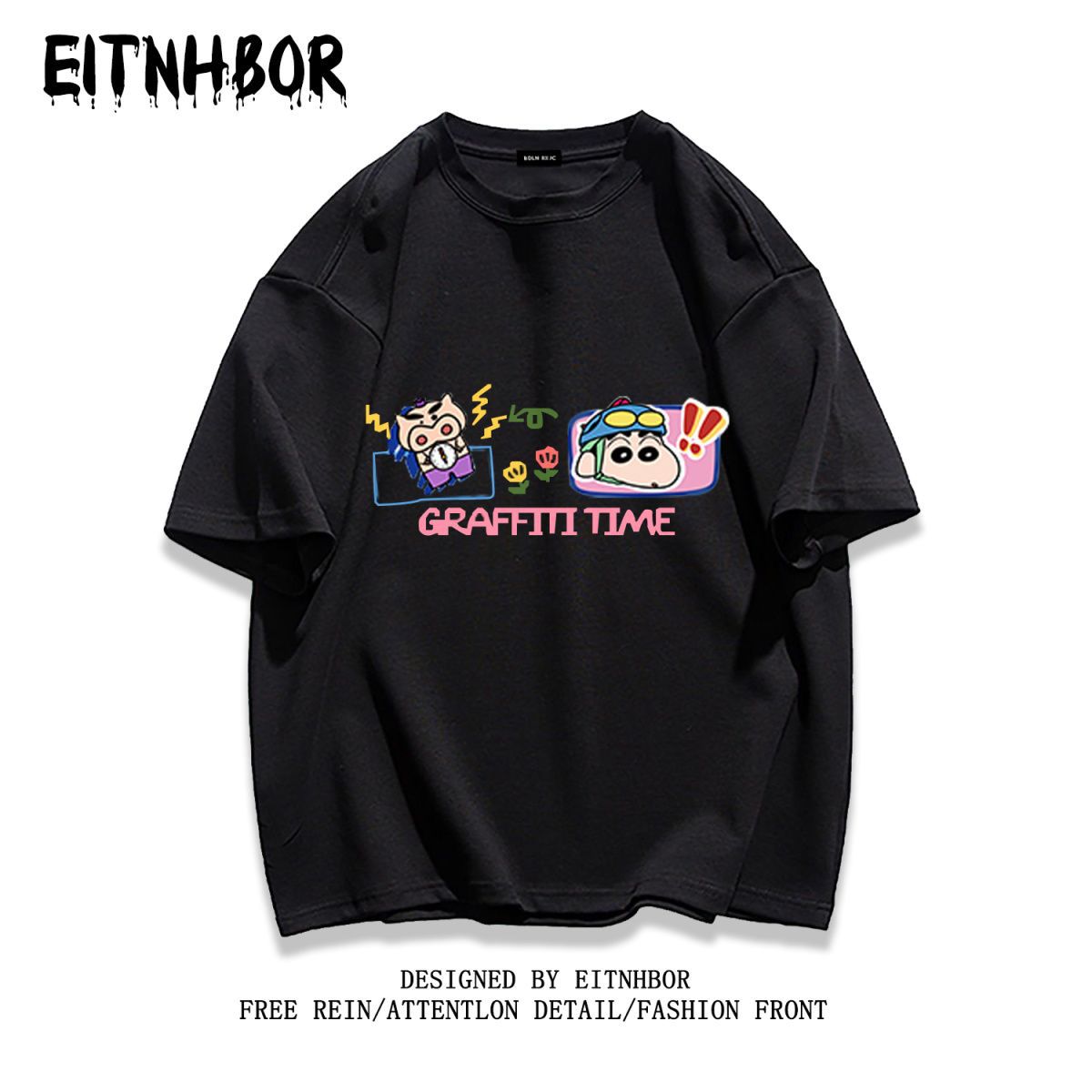 跨境东南亚台湾2025夏新款短袖T恤女蜡笔小新卡通印花上衣素色踢