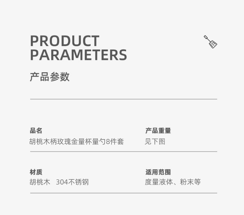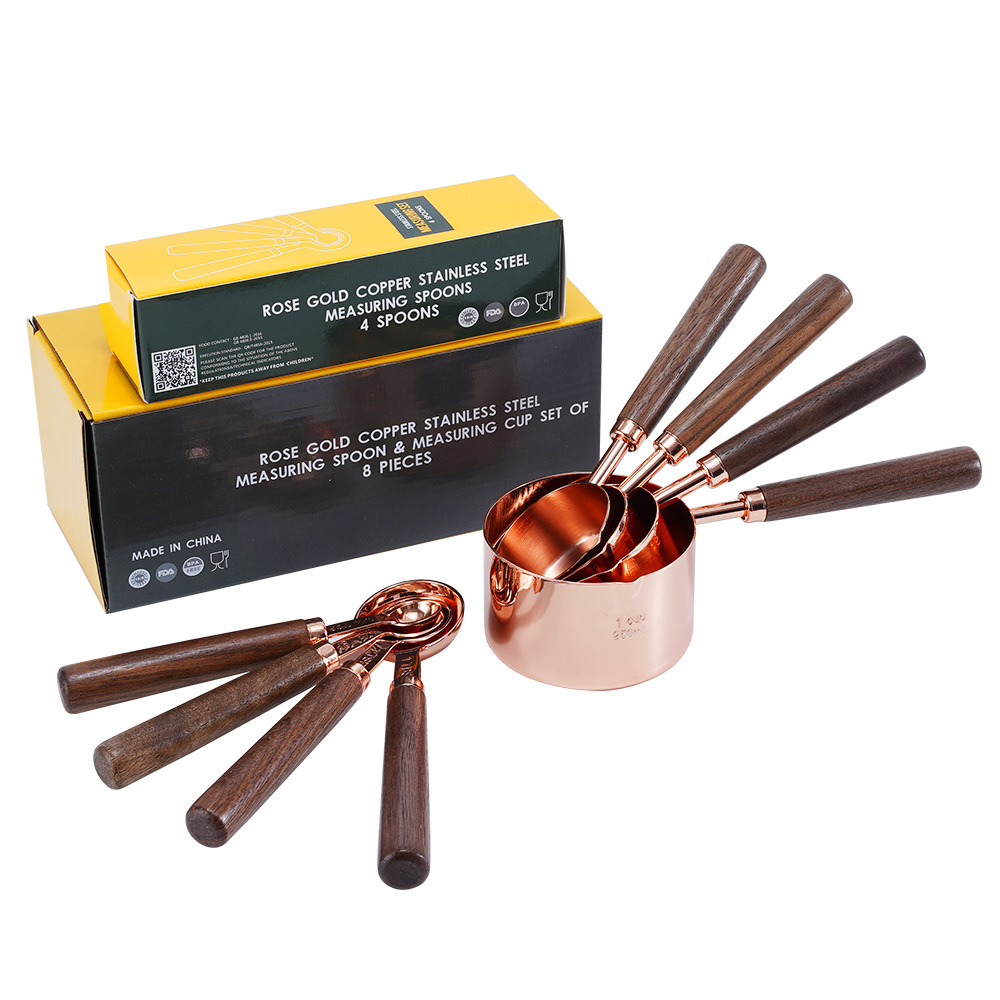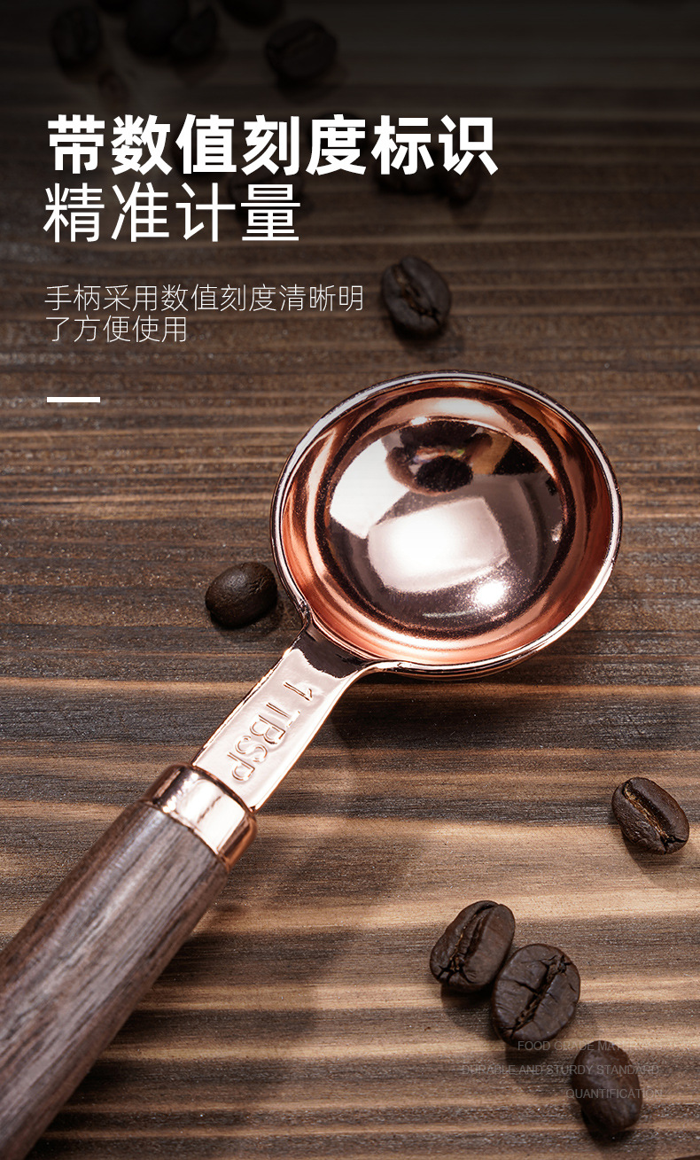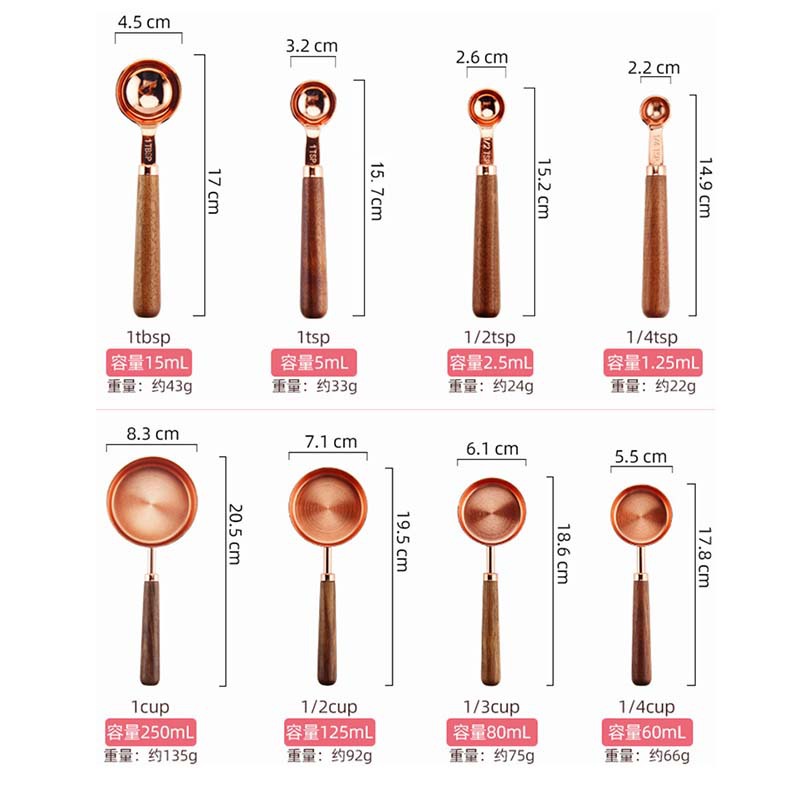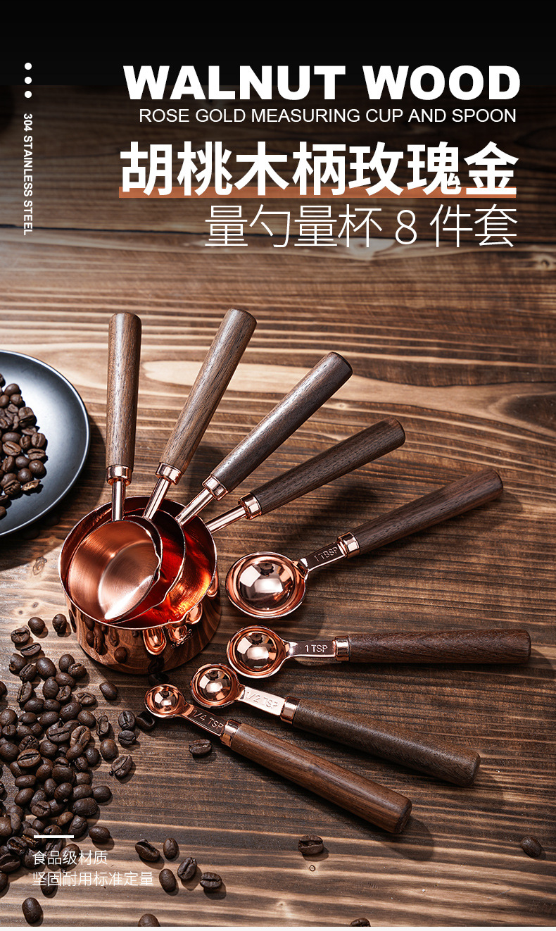 不锈钢量杯长柄量勺套装胡桃木手柄玫瑰金实木量杯克量匙勺子
