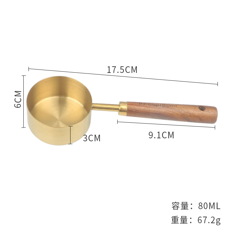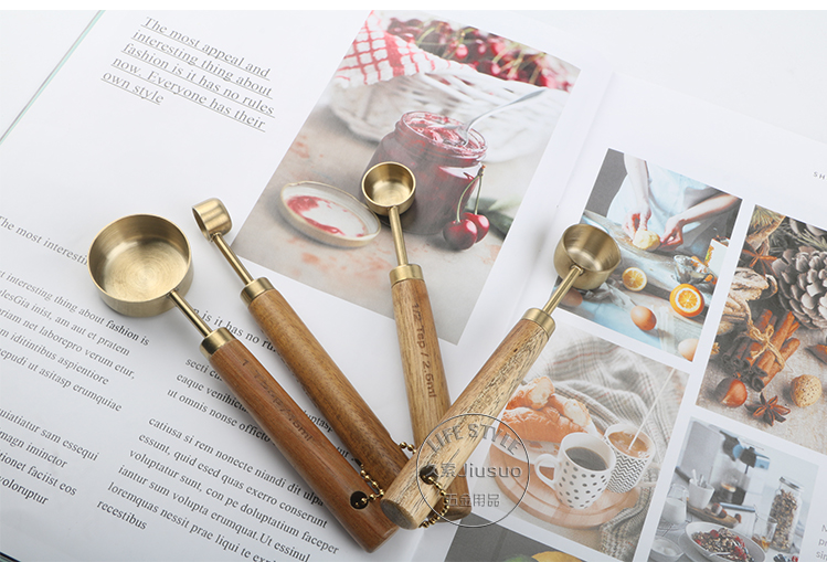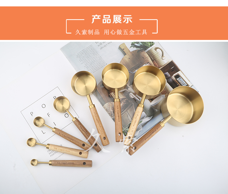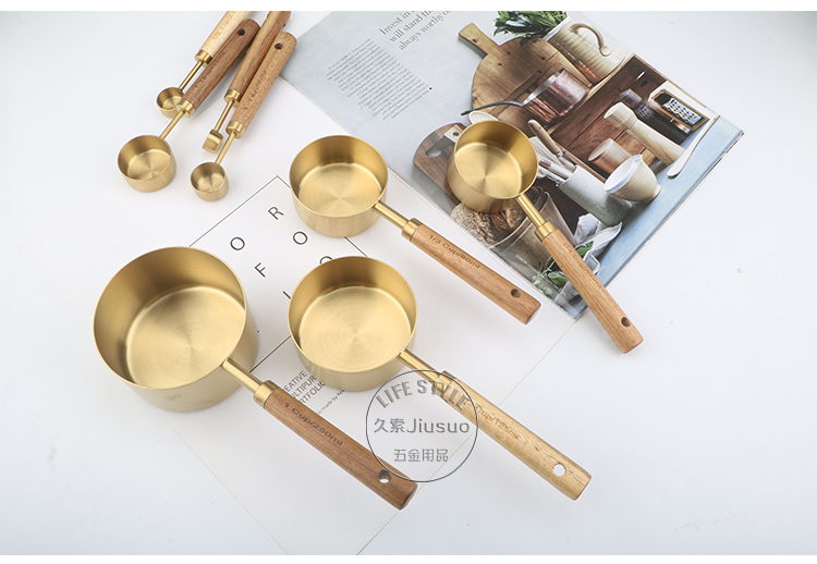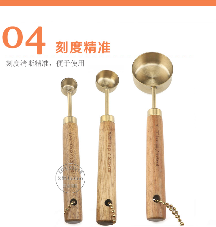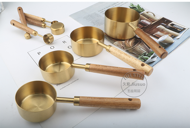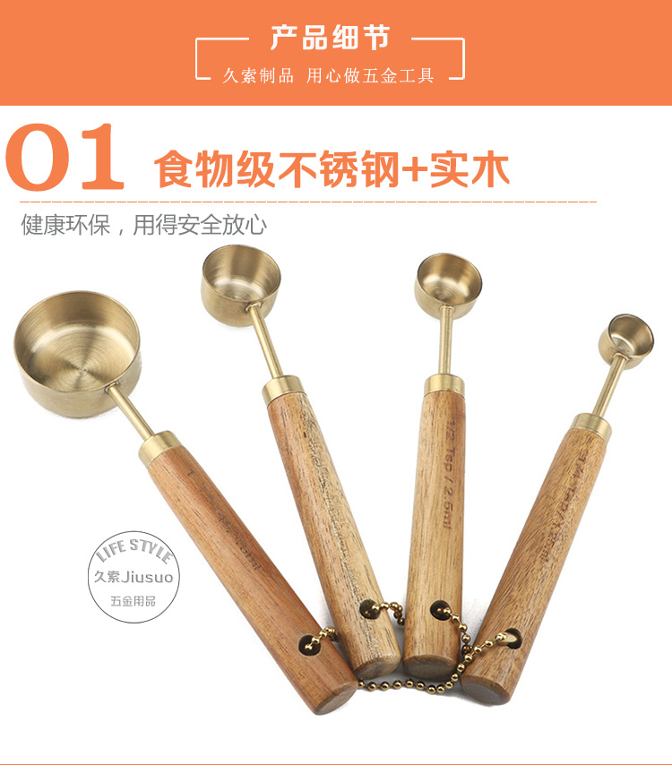 久索铜色木柄量勺量匙 烘焙专用不锈钢量杯量勺量匙四件套张张