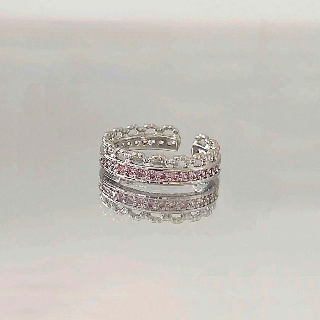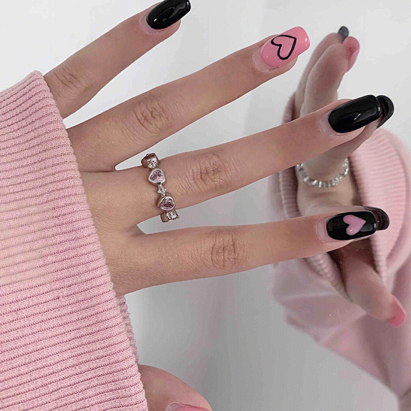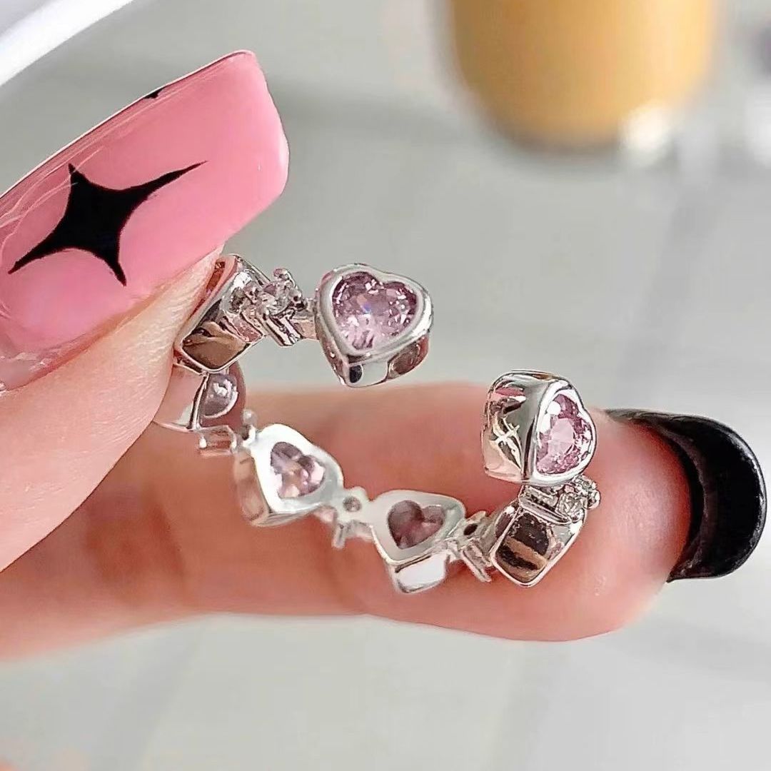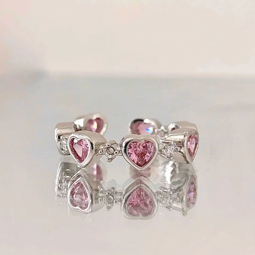 甜酷粉色钻爱心戒指女小众设计感指环时尚个性食指戒开口可调