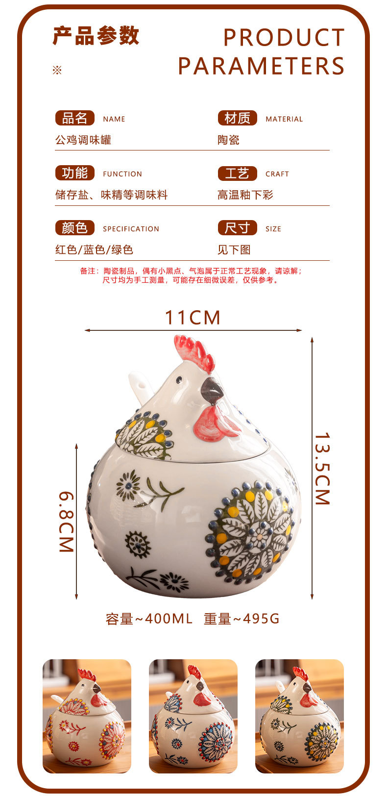 可爱简约小鸡调料罐创意家用陶瓷带盖带勺釉下彩手绘调味罐防潮