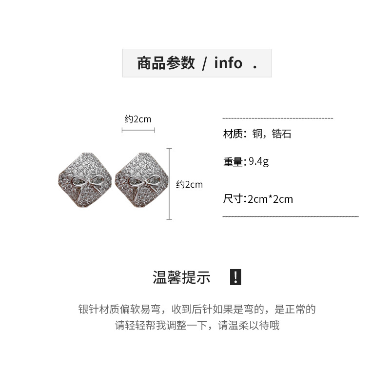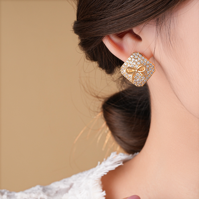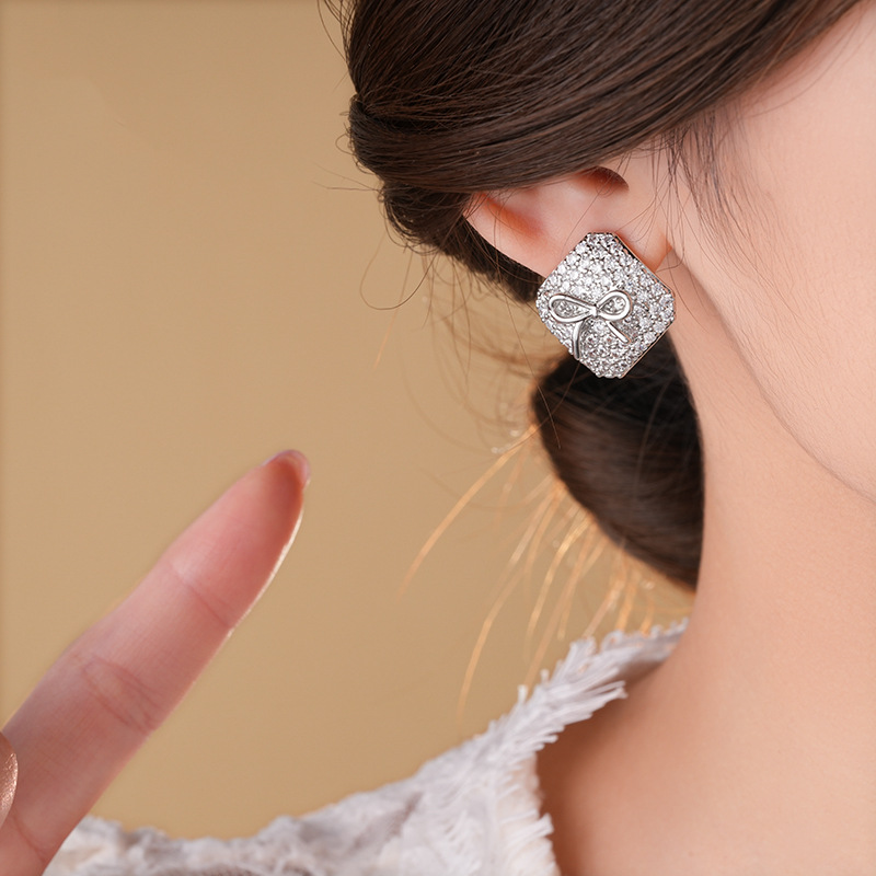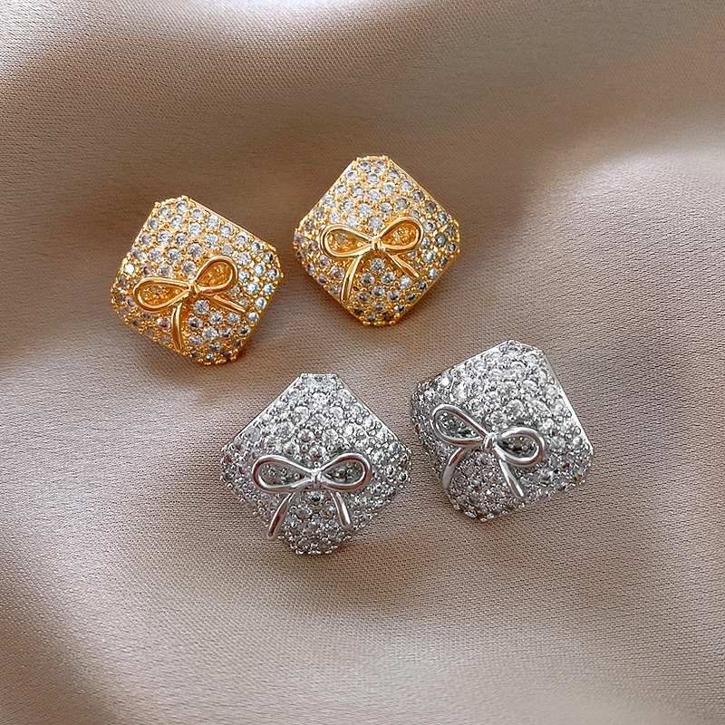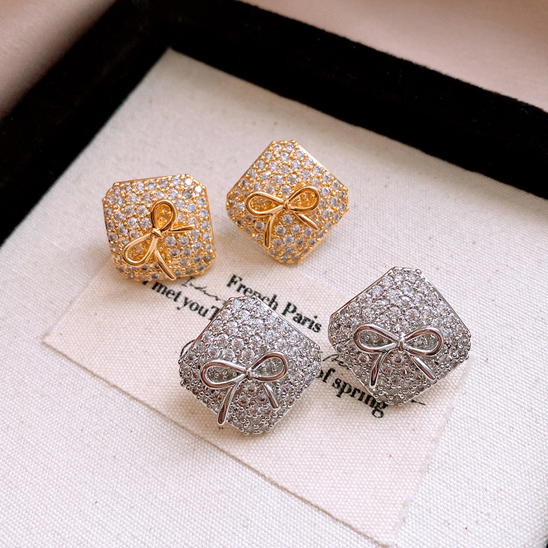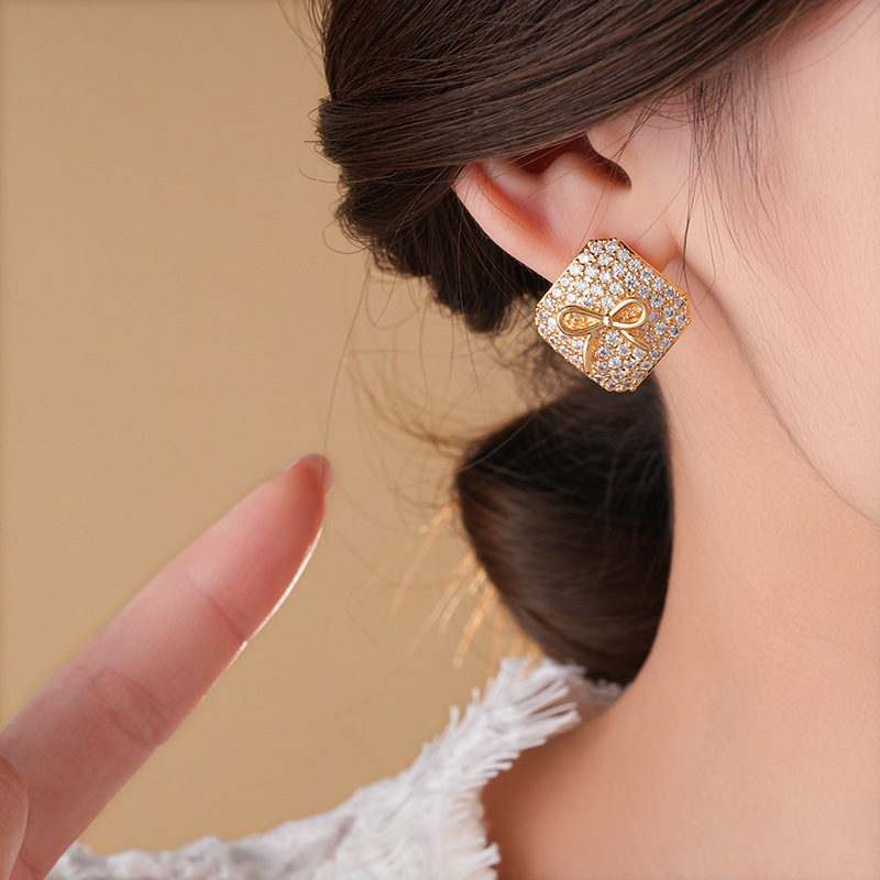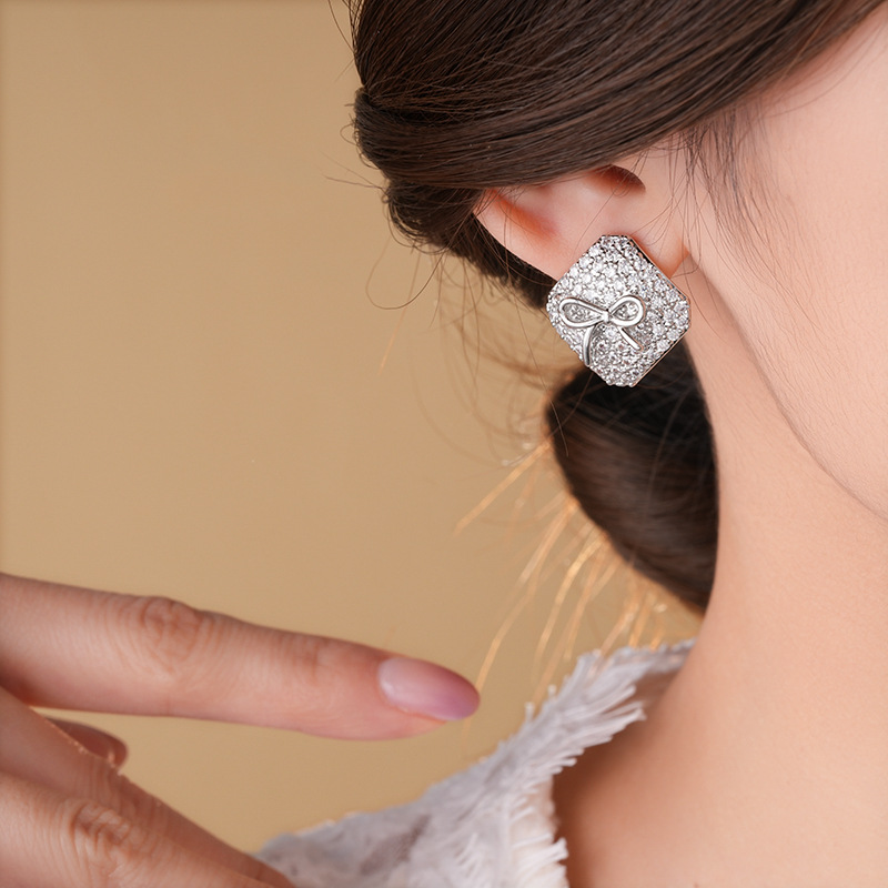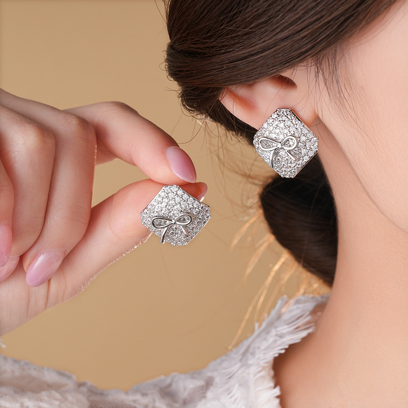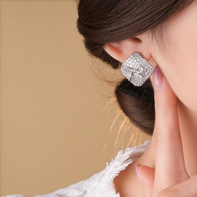 真金电镀银针锆石方形蝴蝶结耳环简约耳钉轻奢高级感时尚耳饰批发