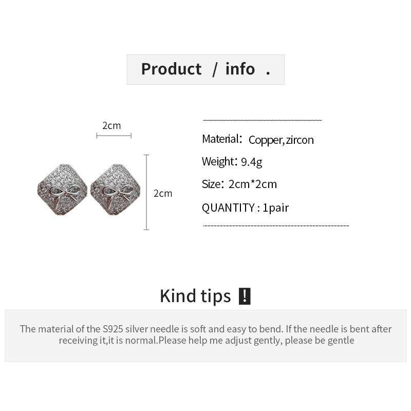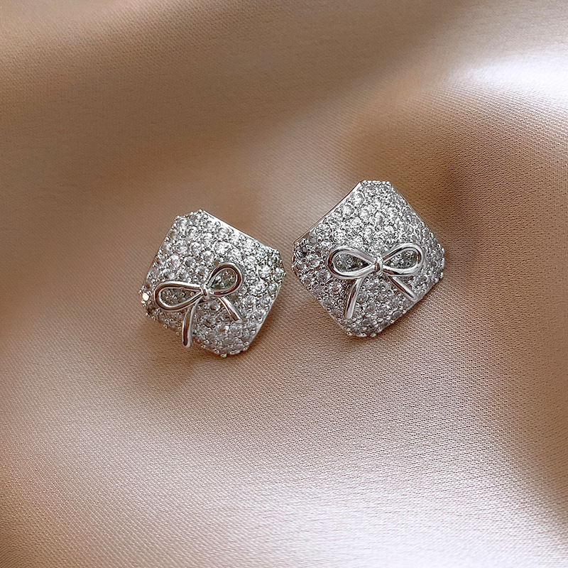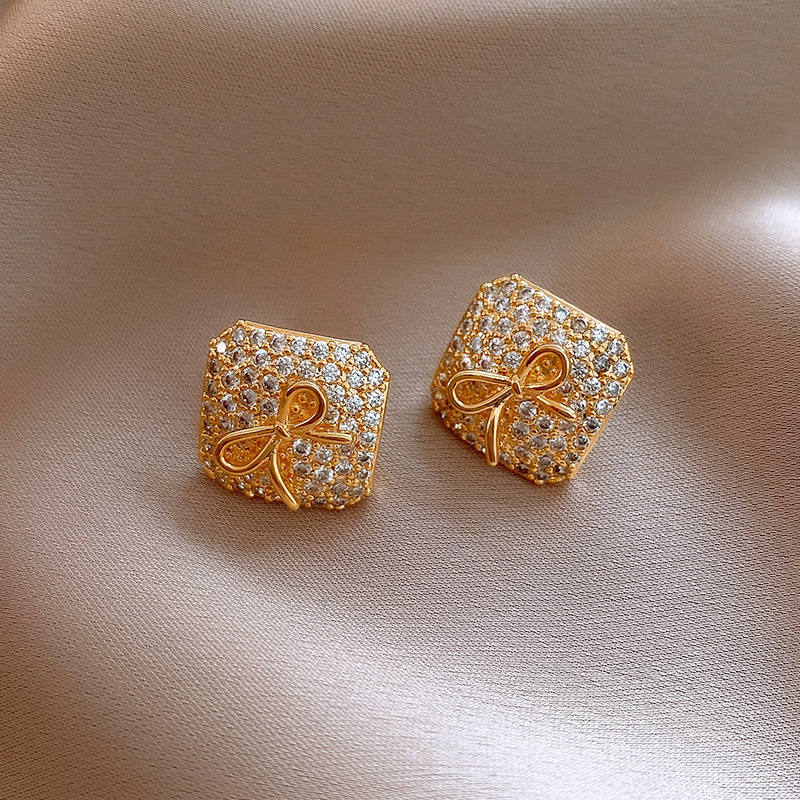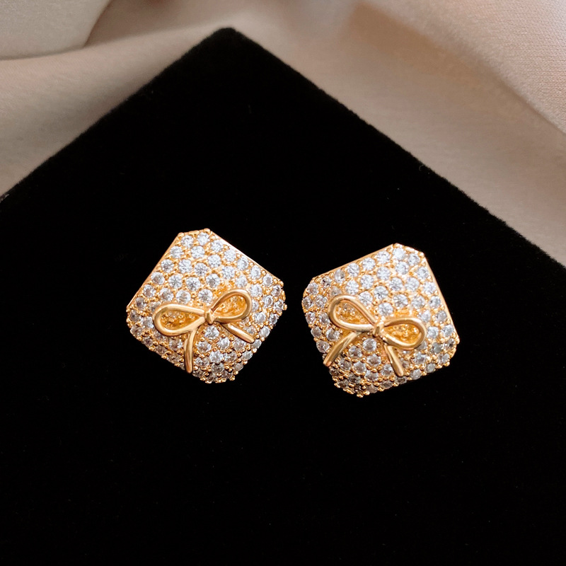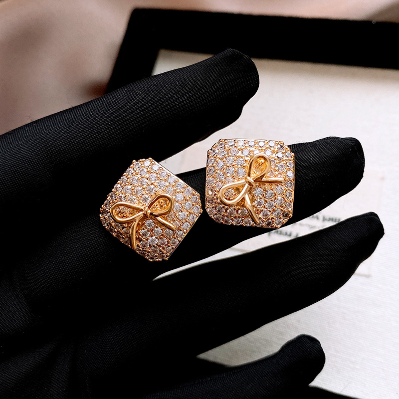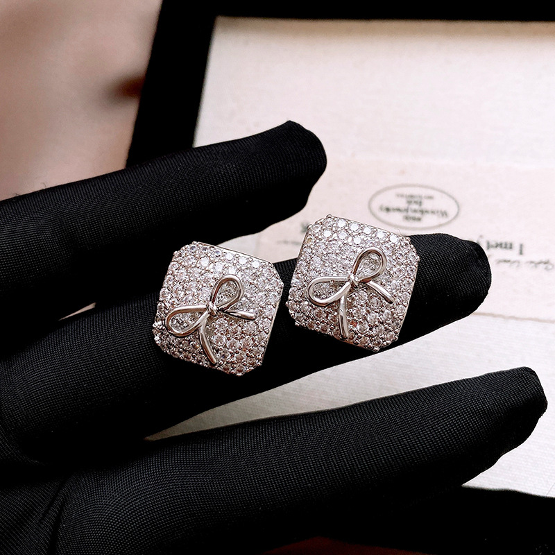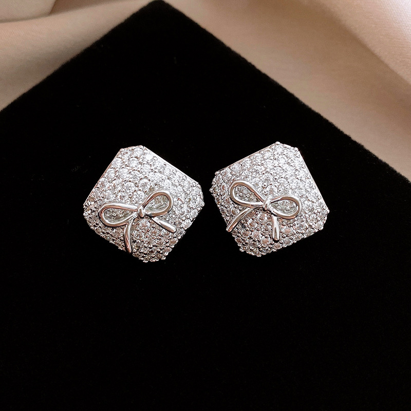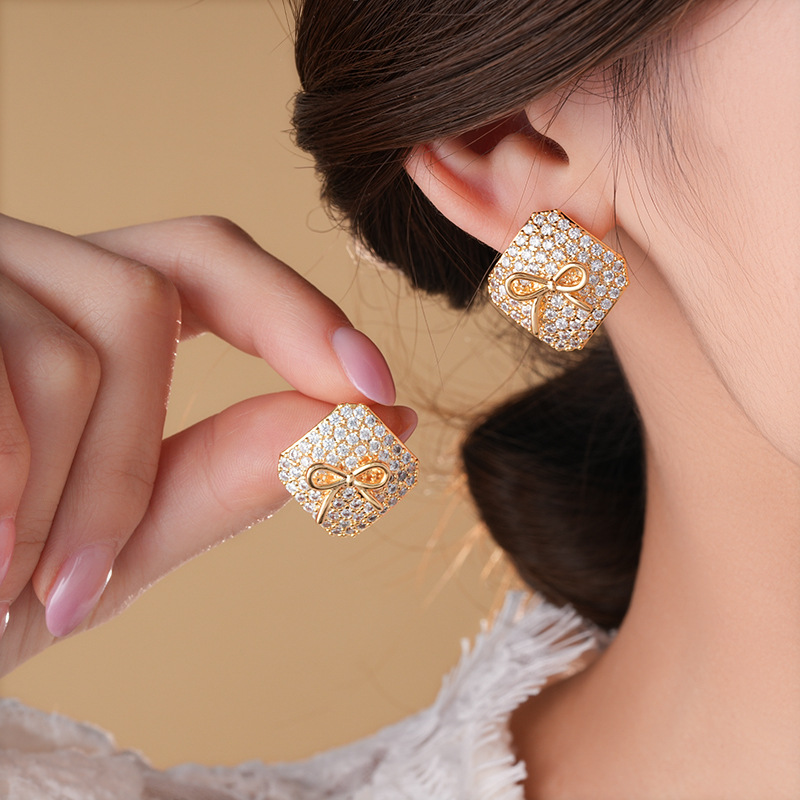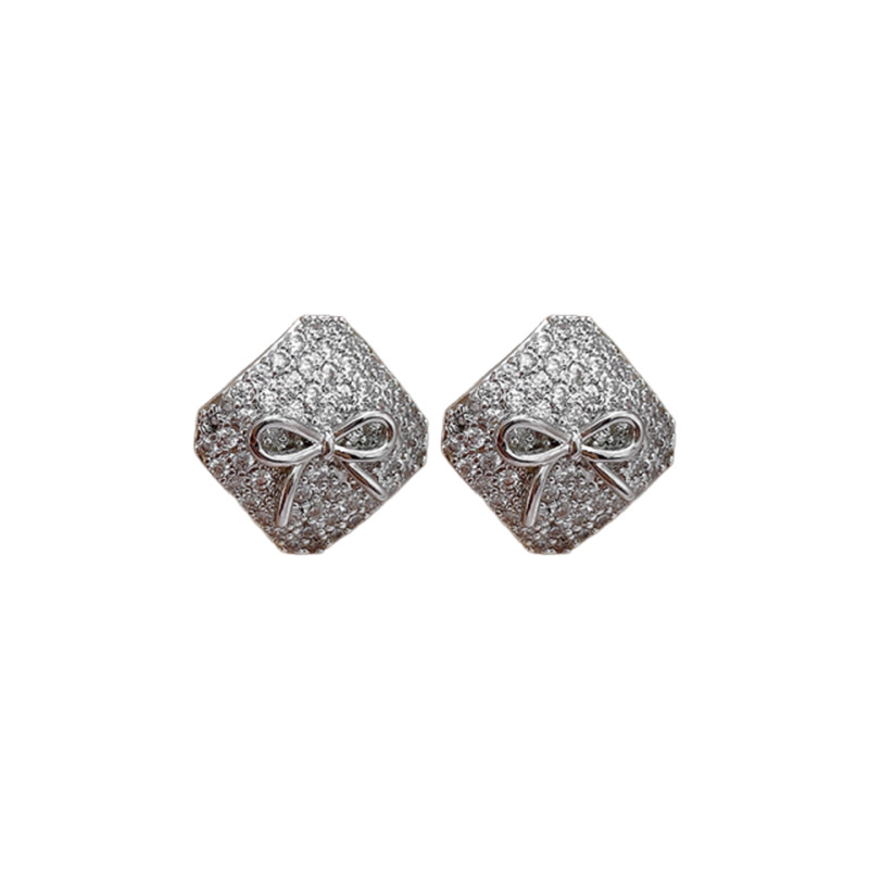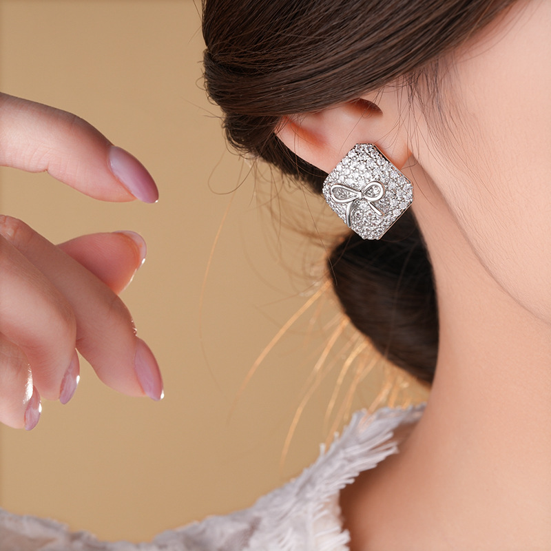 真金电镀银针锆石方形蝴蝶结耳环简约耳钉轻奢高级感时尚耳饰批发