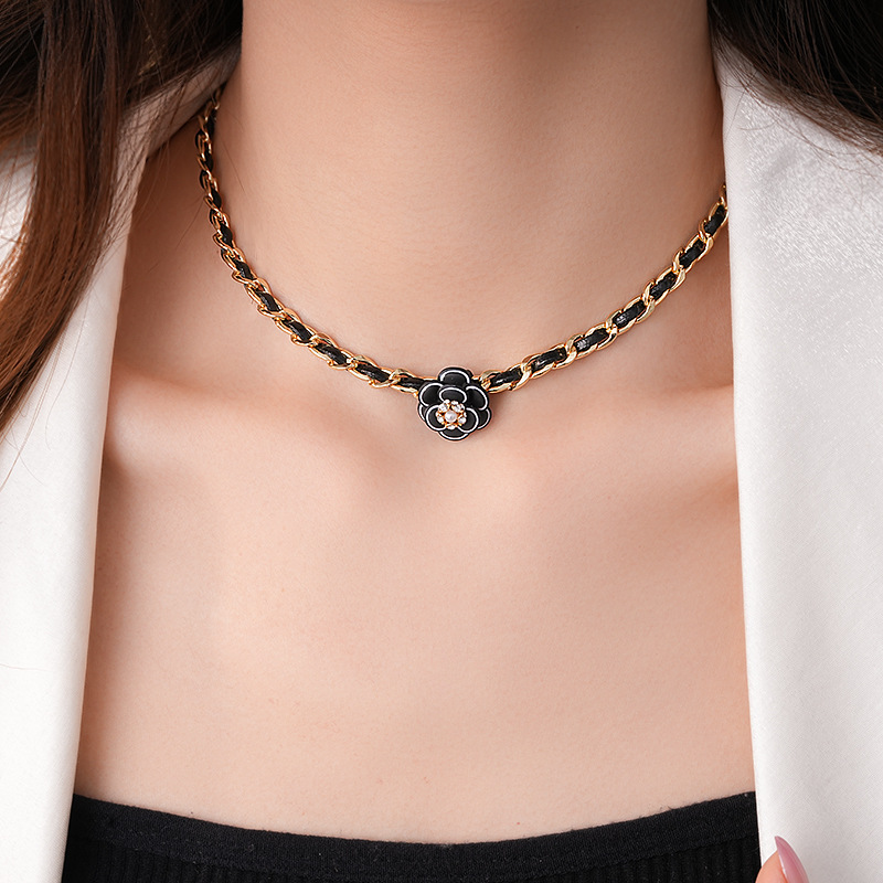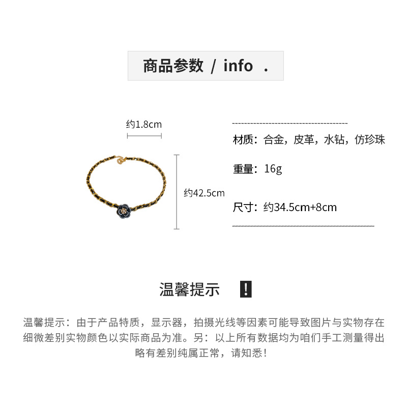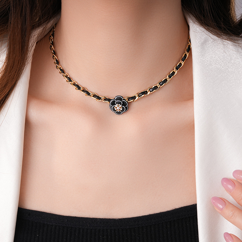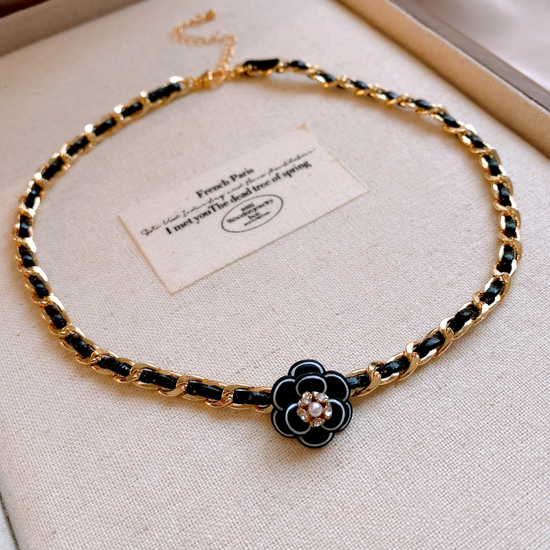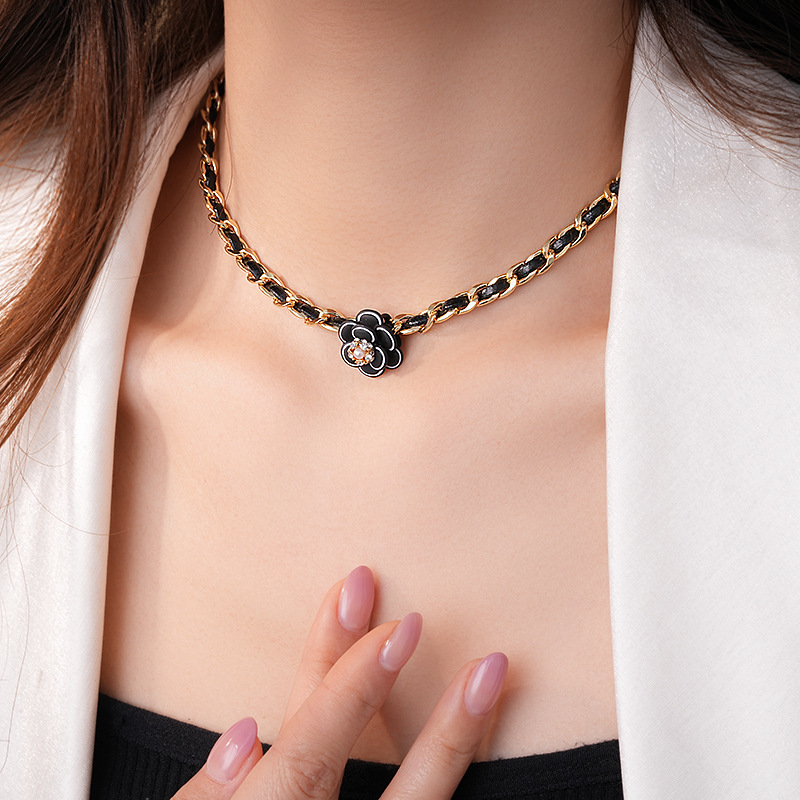 真金电镀镶钻皮革山茶花珍珠项链法式复古锁骨链轻奢高级感项饰女