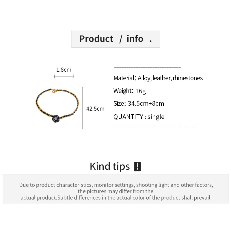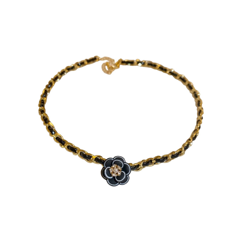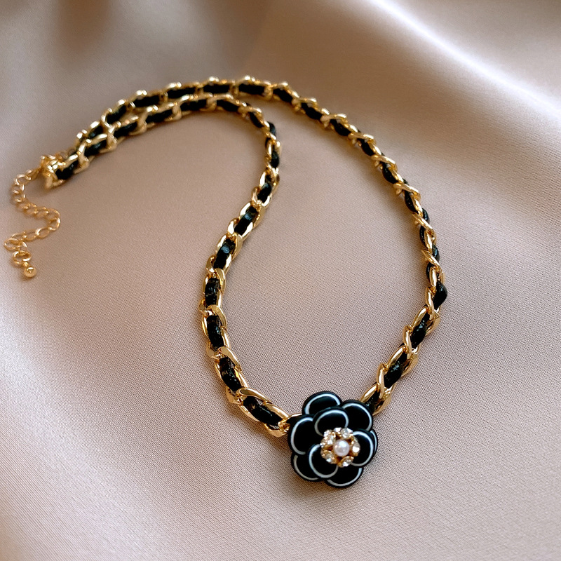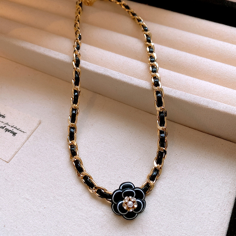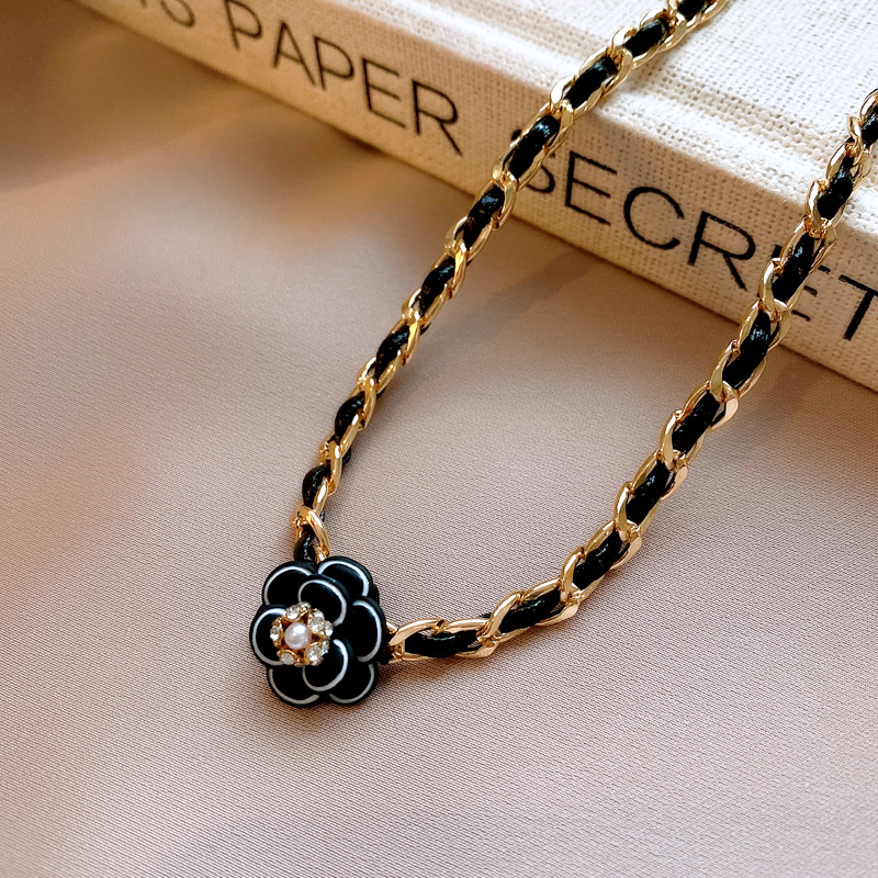 真金电镀镶钻皮革山茶花珍珠项链法式复古锁骨链轻奢高级感项饰女