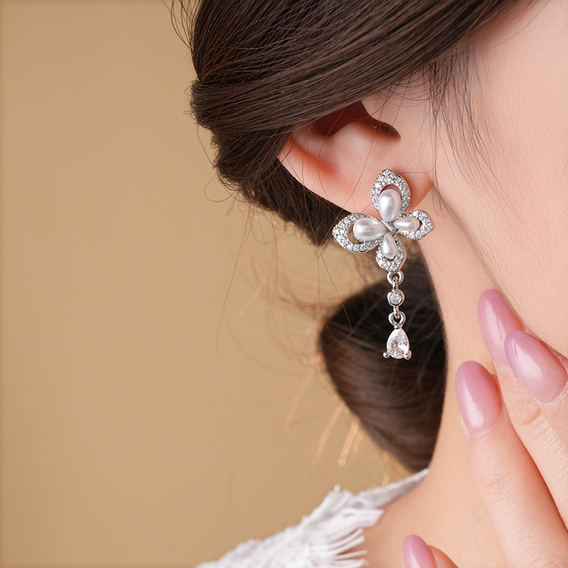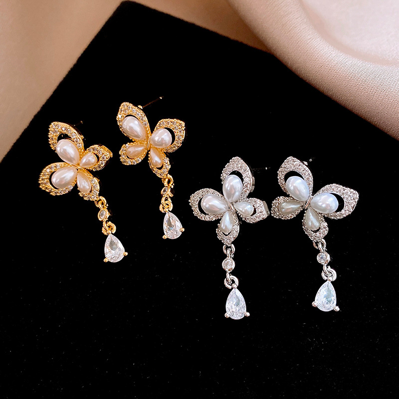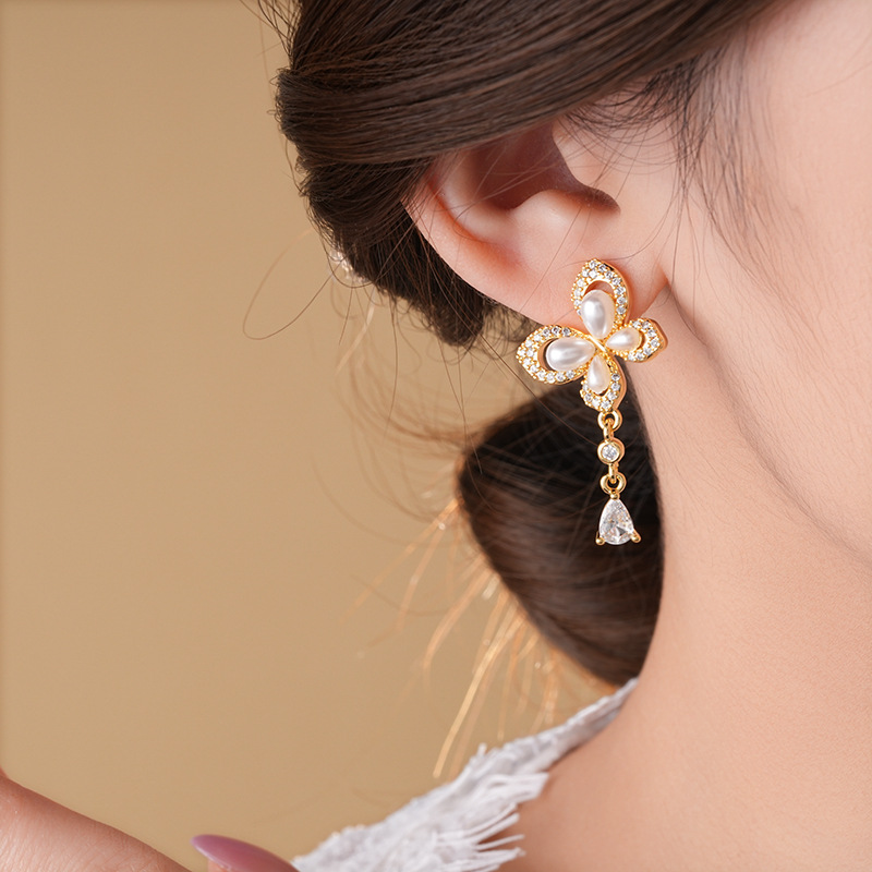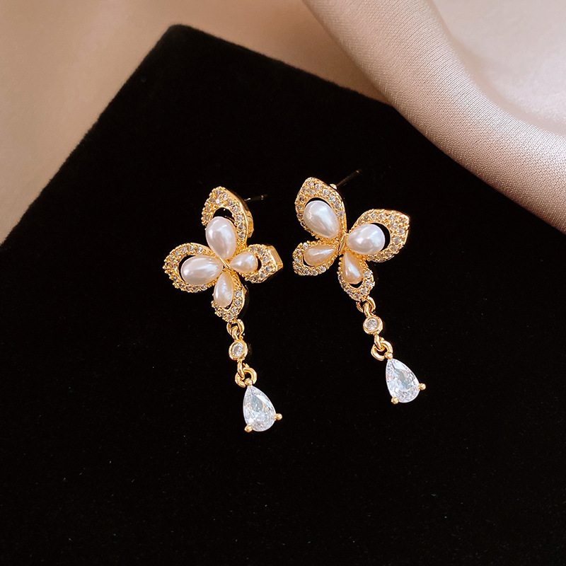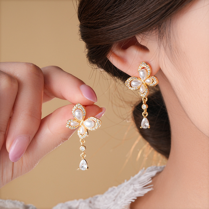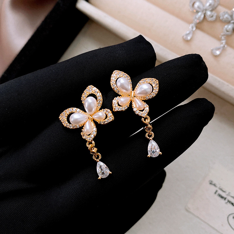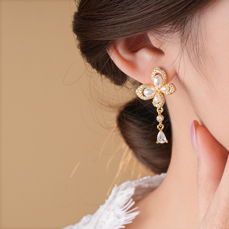 真金电镀银针锆石珍珠蝴蝶流苏耳环时尚耳钉轻奢高级感新款耳饰女