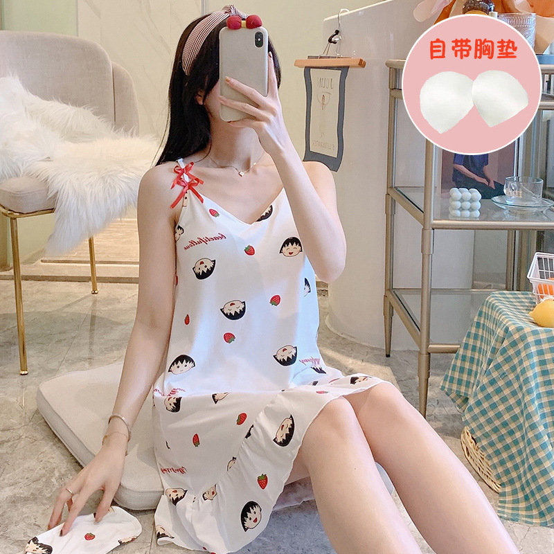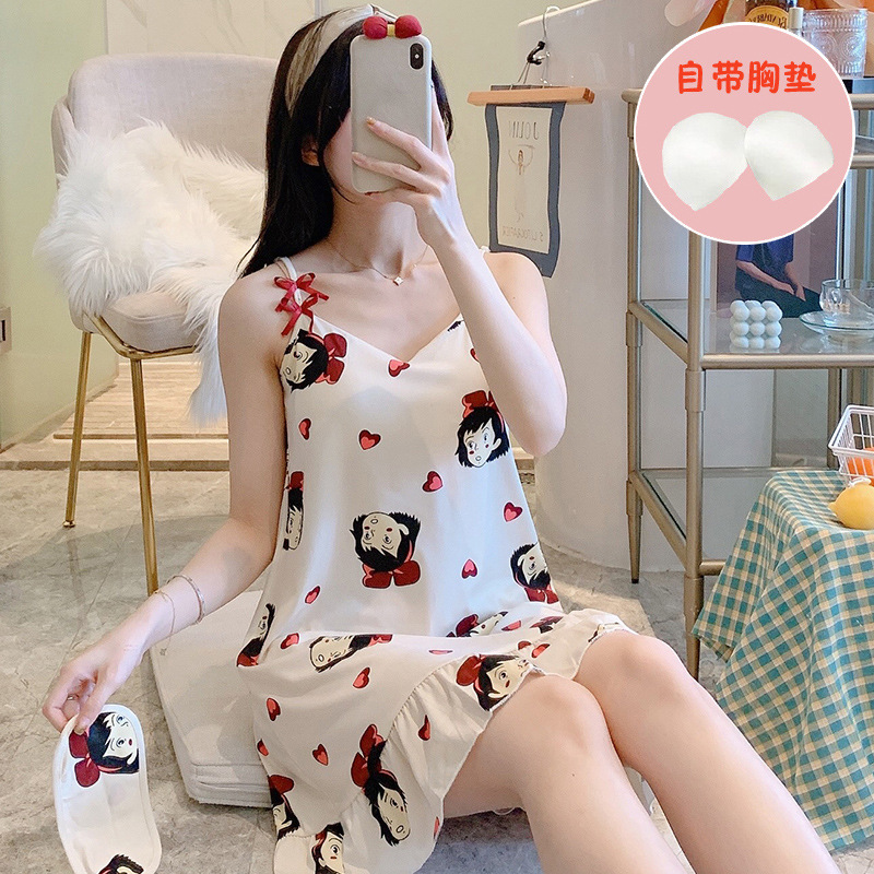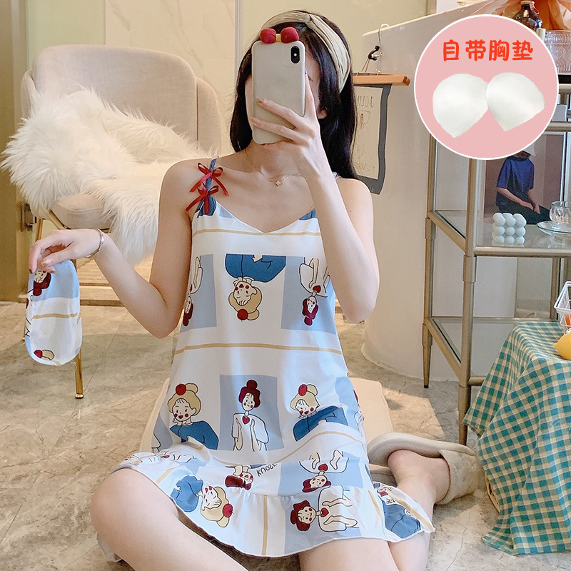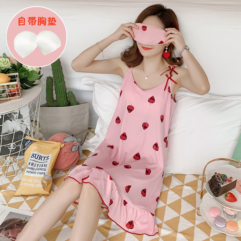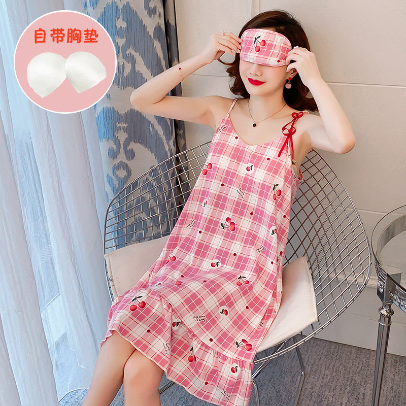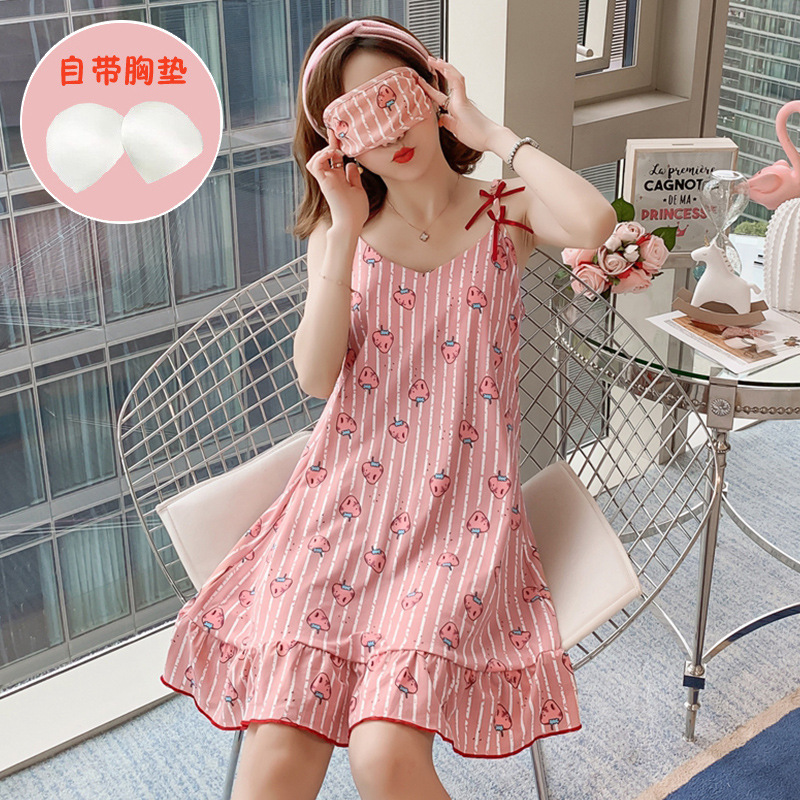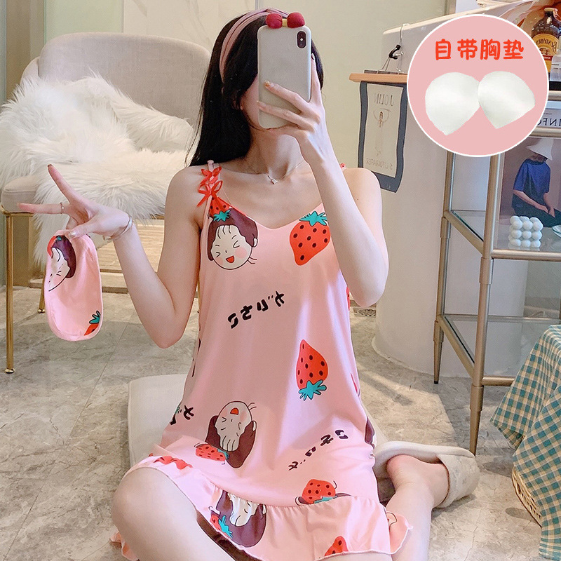 跨境新款带胸垫睡衣女夏韩版吊带睡裙宽松少女可爱学生150g送眼罩