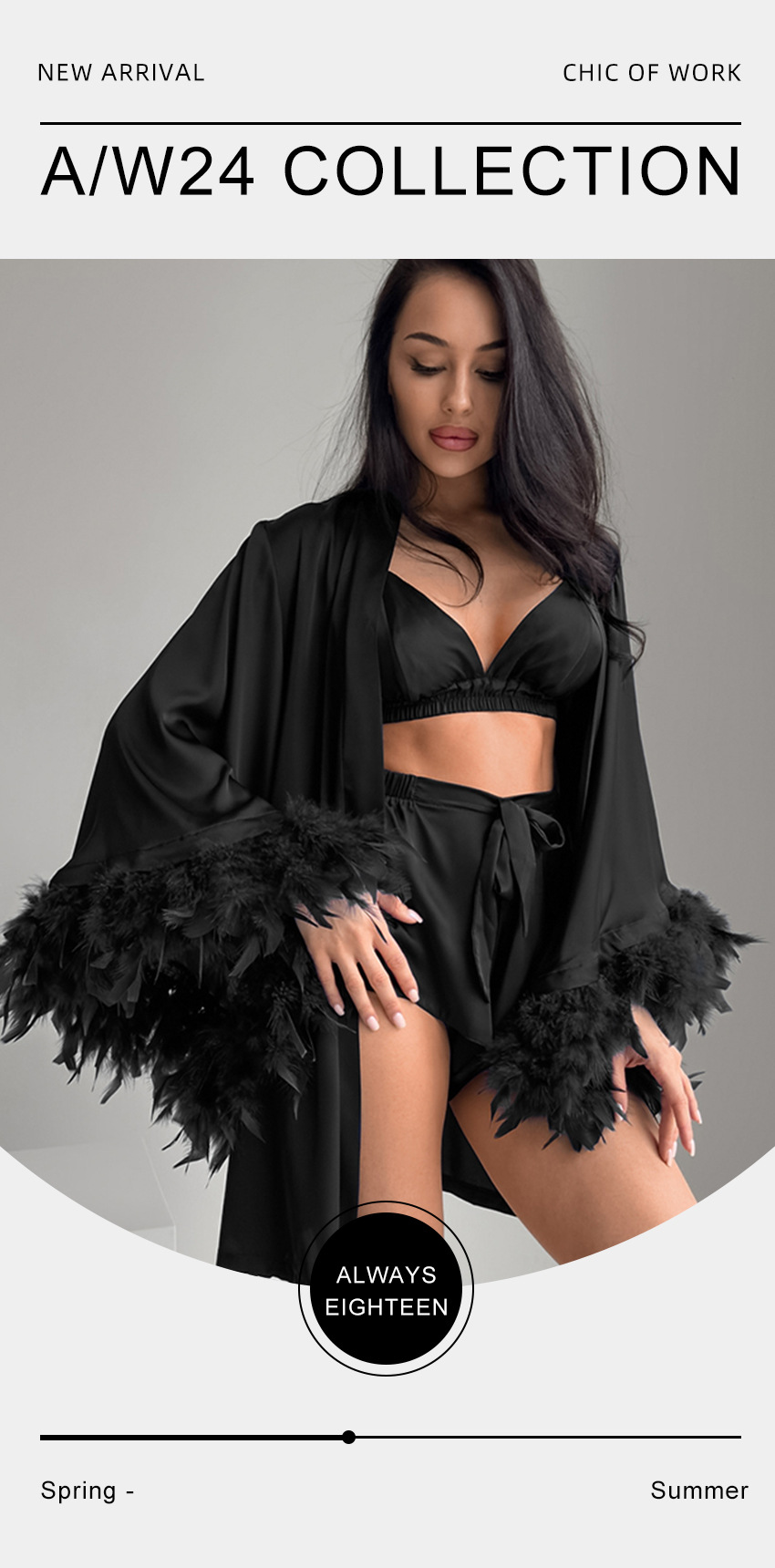 2025欧美夏季宽松舒适羽毛袖家居服内衣短裤睡袍三件套睡衣女跨境