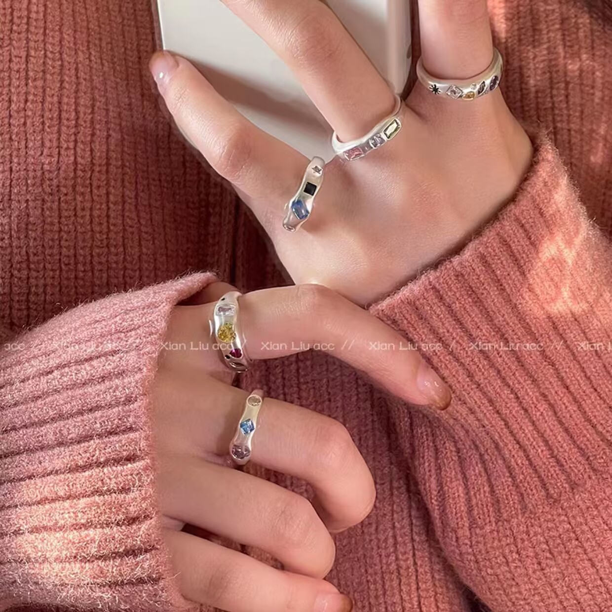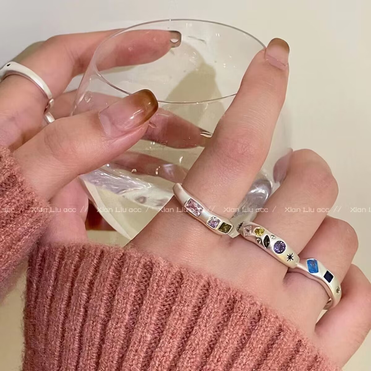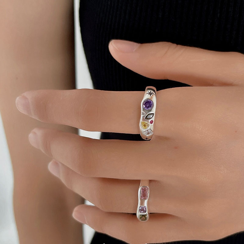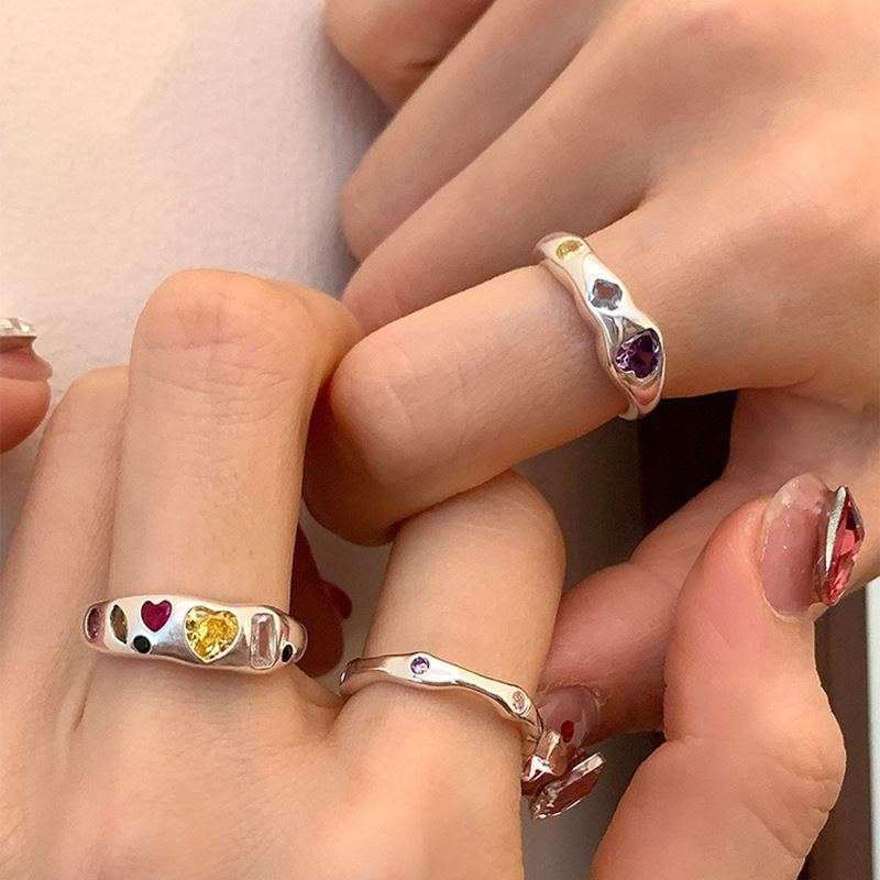 不规则合金金属彩色锆石爱心戒指女小众复古个性简约百搭气质指环