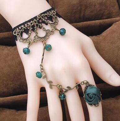 欧美复古花边藤灵水晶洛丽塔气质蕾丝手链带戒指一体链女手饰配饰