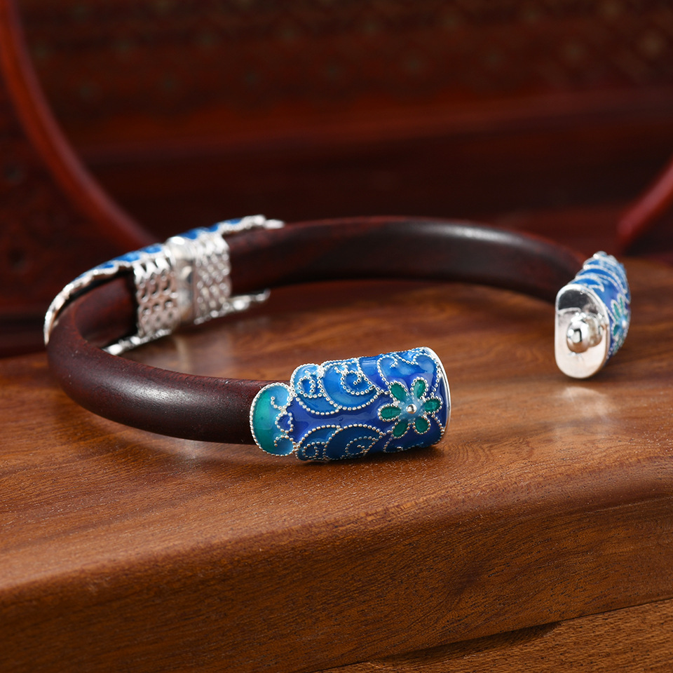 民族风烧蓝复古景泰蓝花朵珐琅彩绘时尚气质正宗檀木手镯