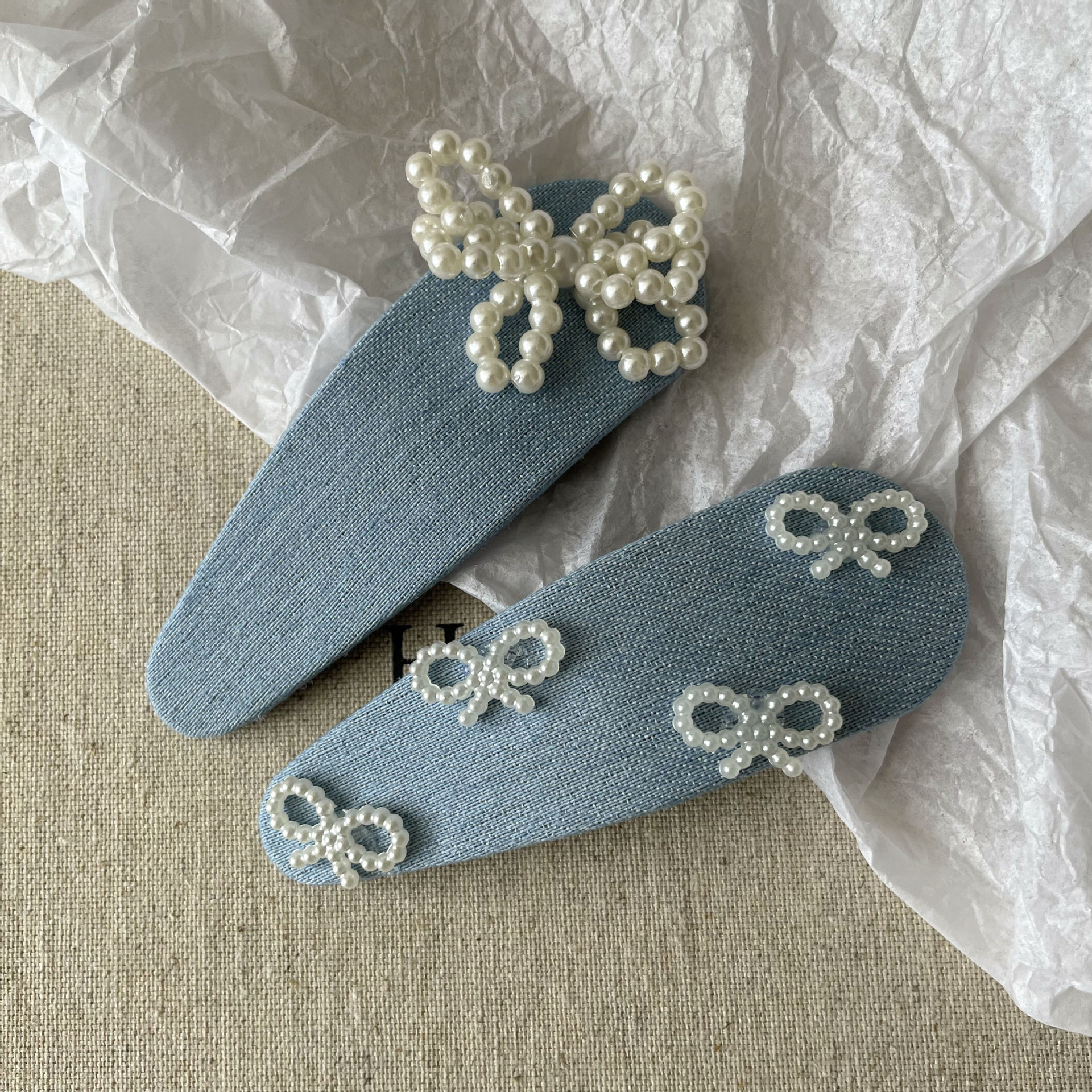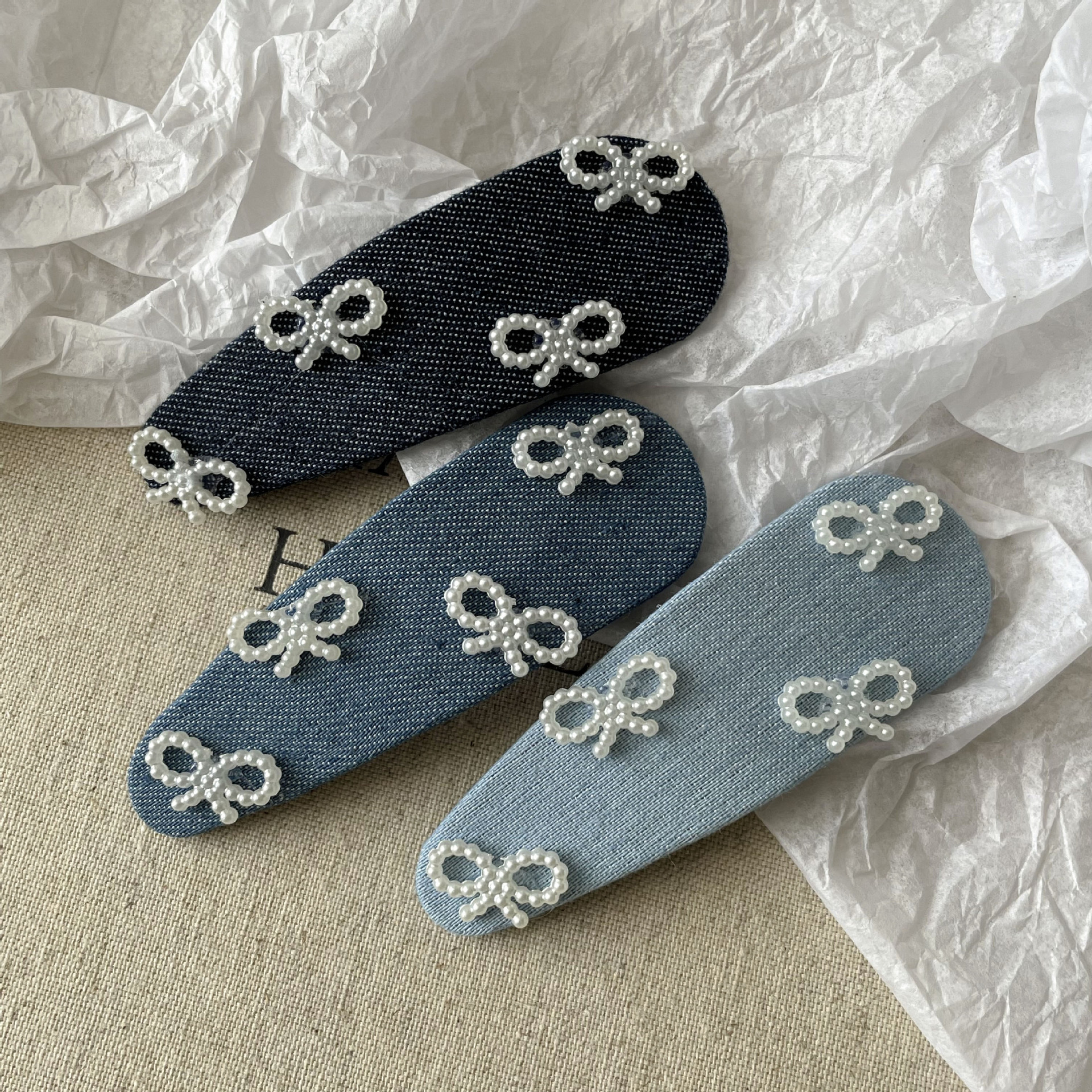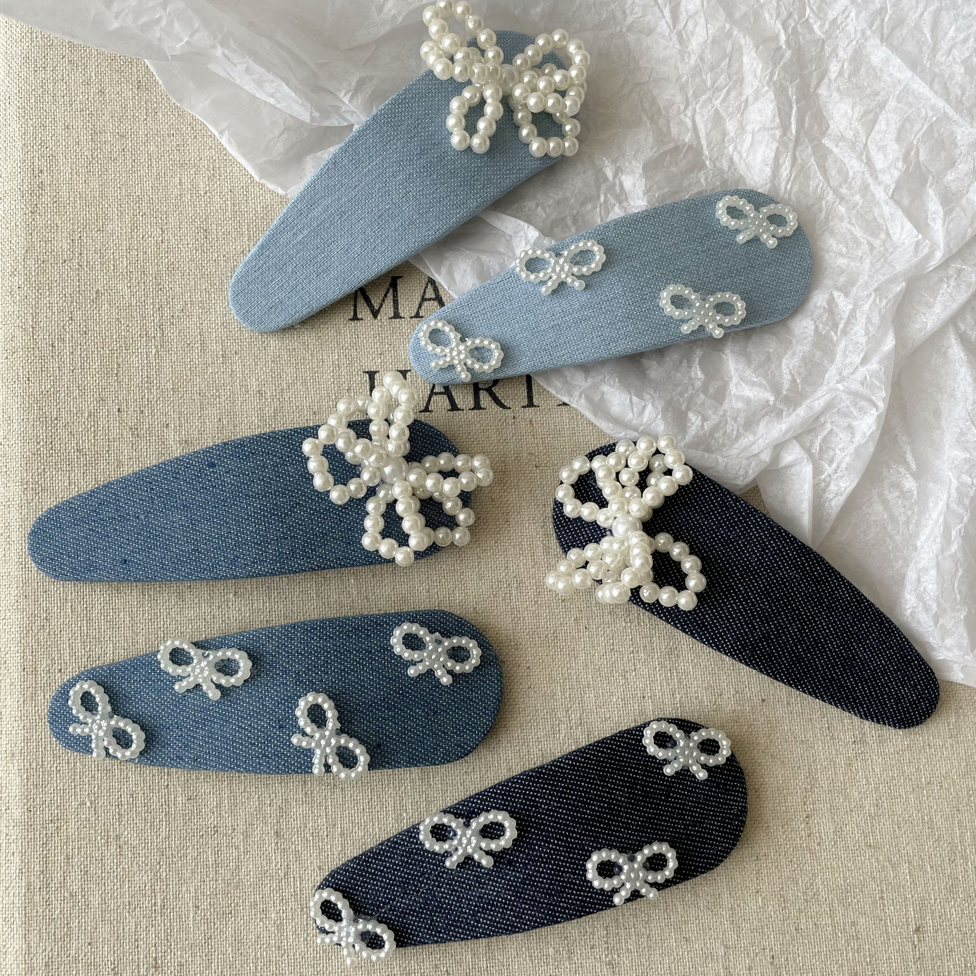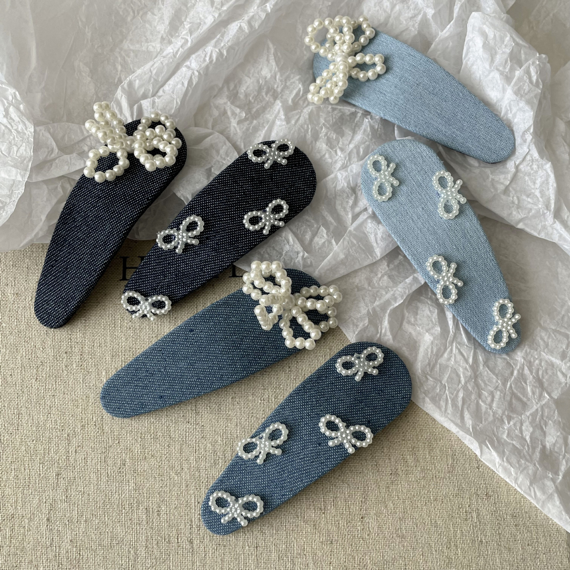 蓝色牛仔仿珍珠蝴蝶结发夹甜美可爱布艺侧边刘海掰掰夹发饰头饰女