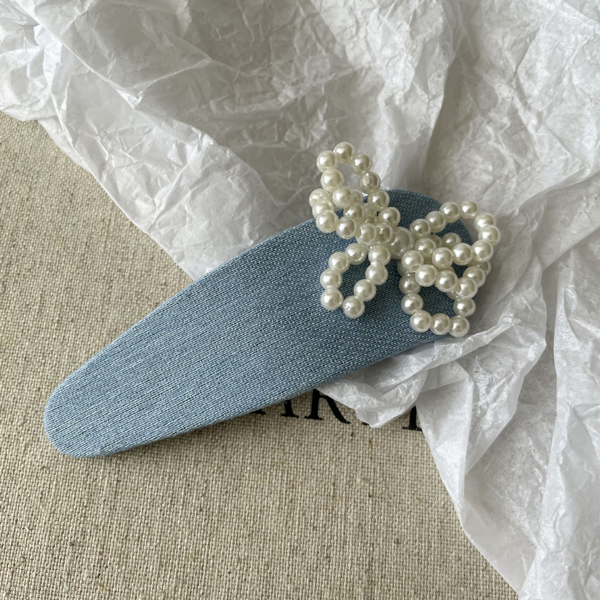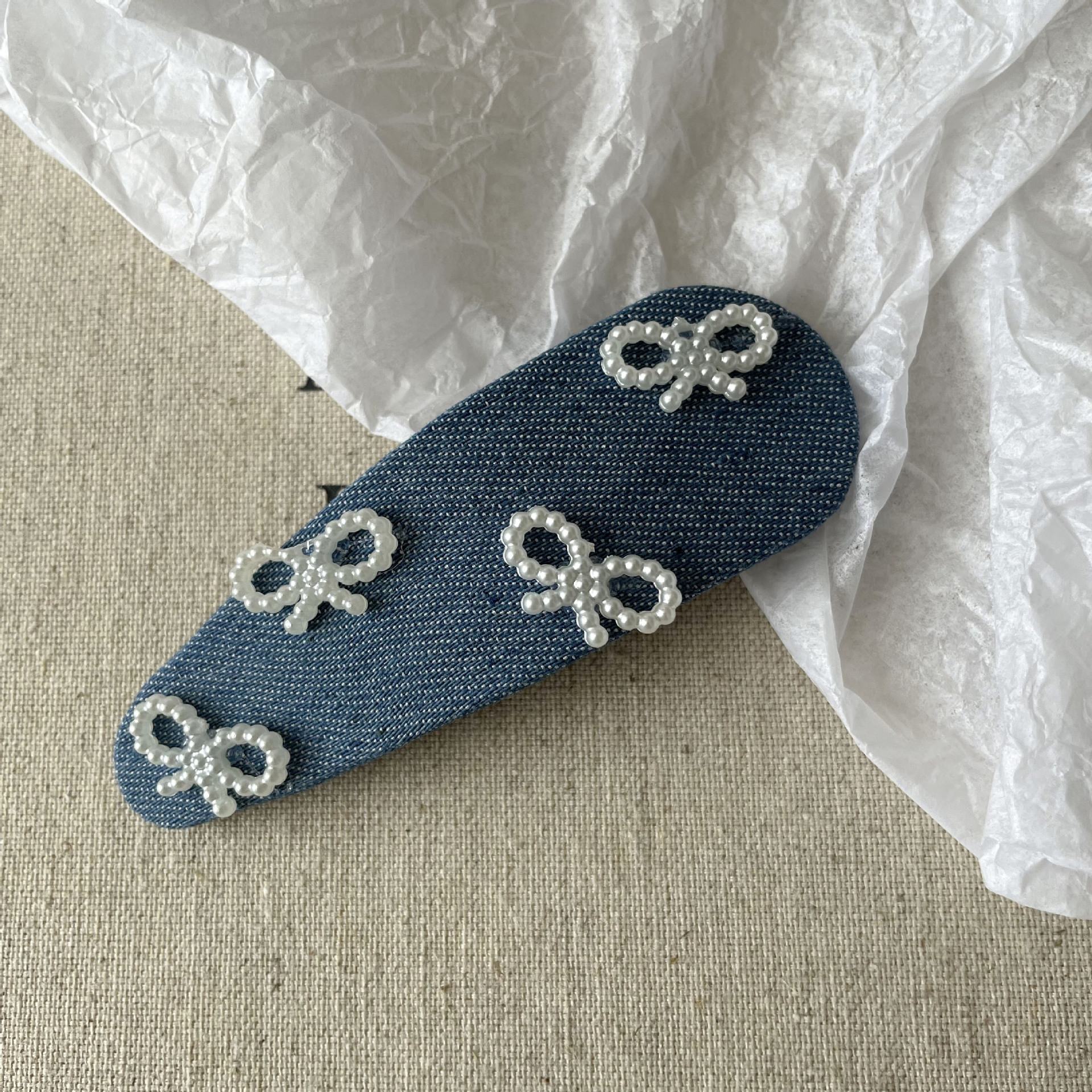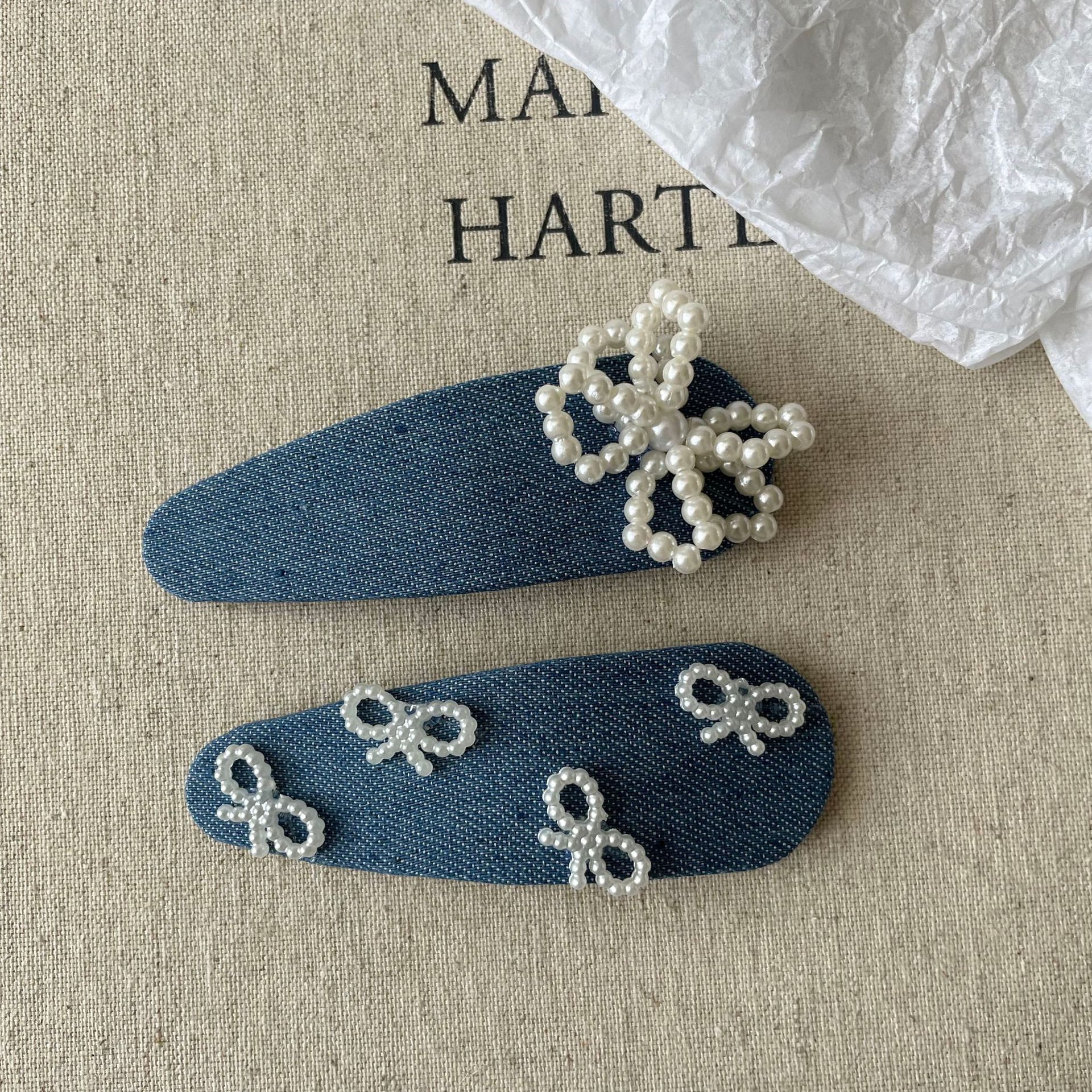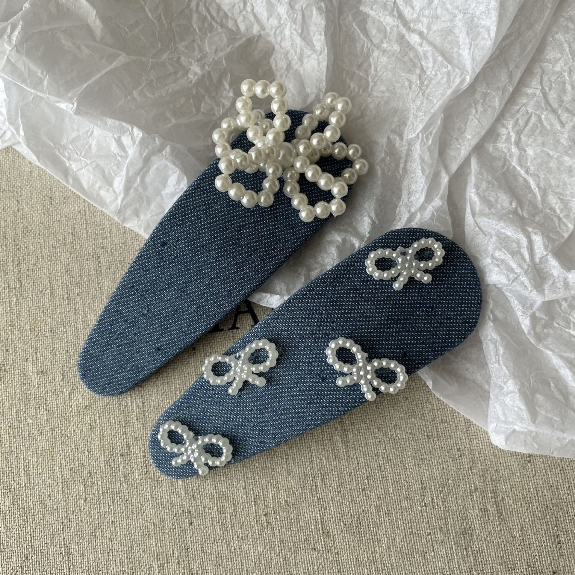 蓝色牛仔仿珍珠蝴蝶结发夹甜美可爱布艺侧边刘海掰掰夹发饰头饰女