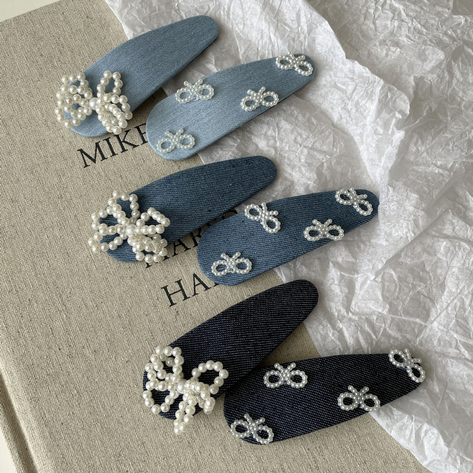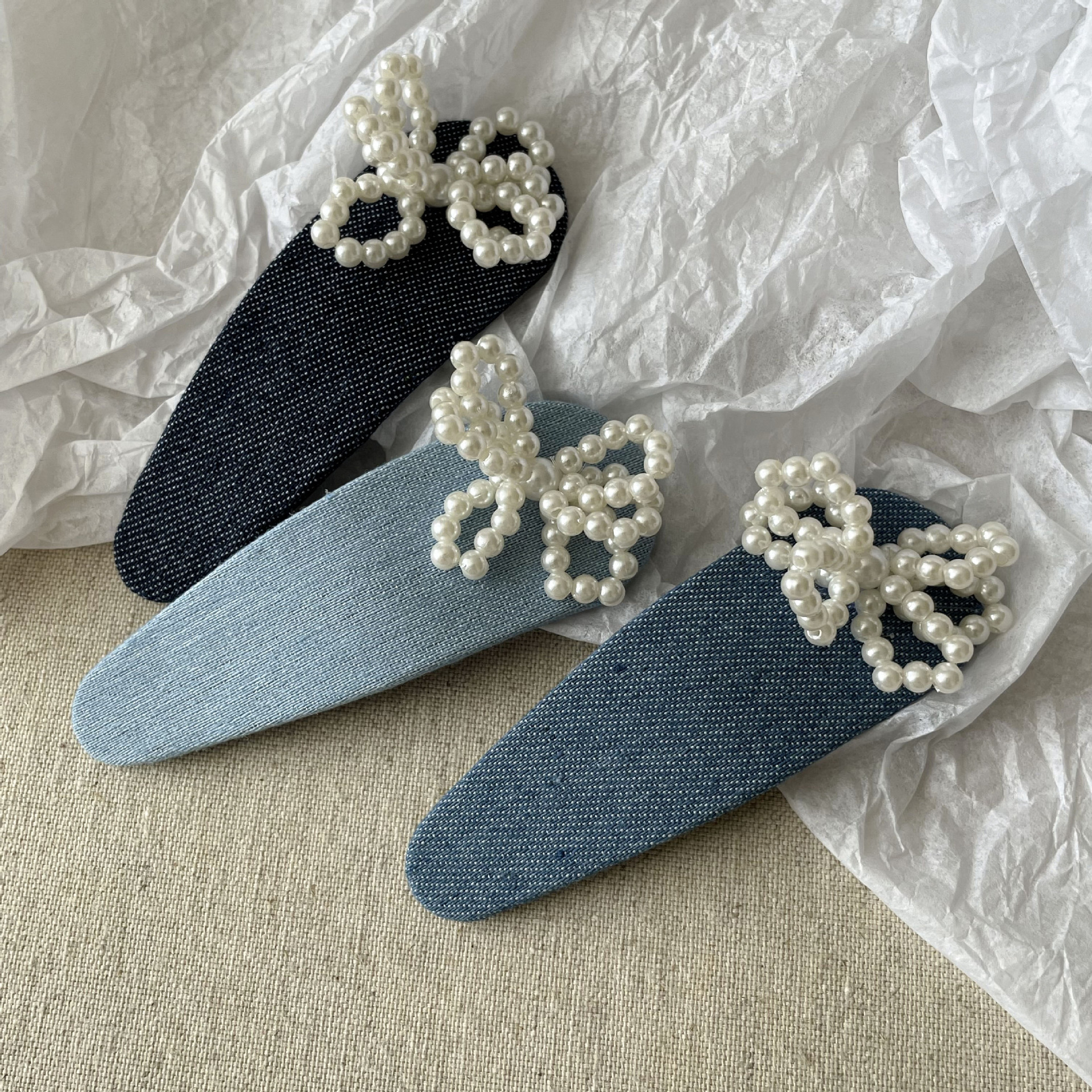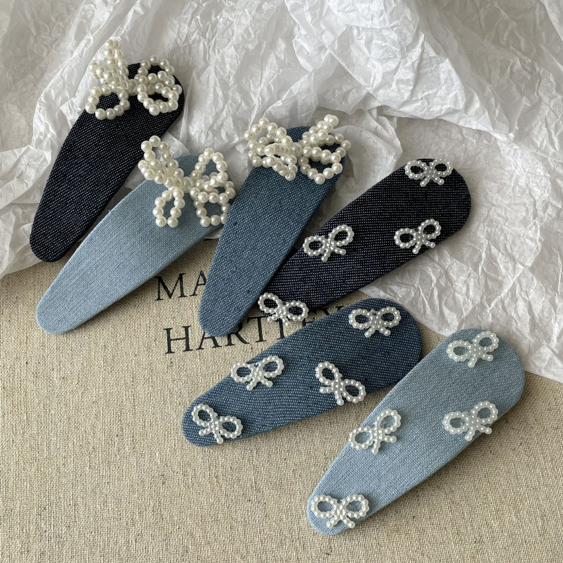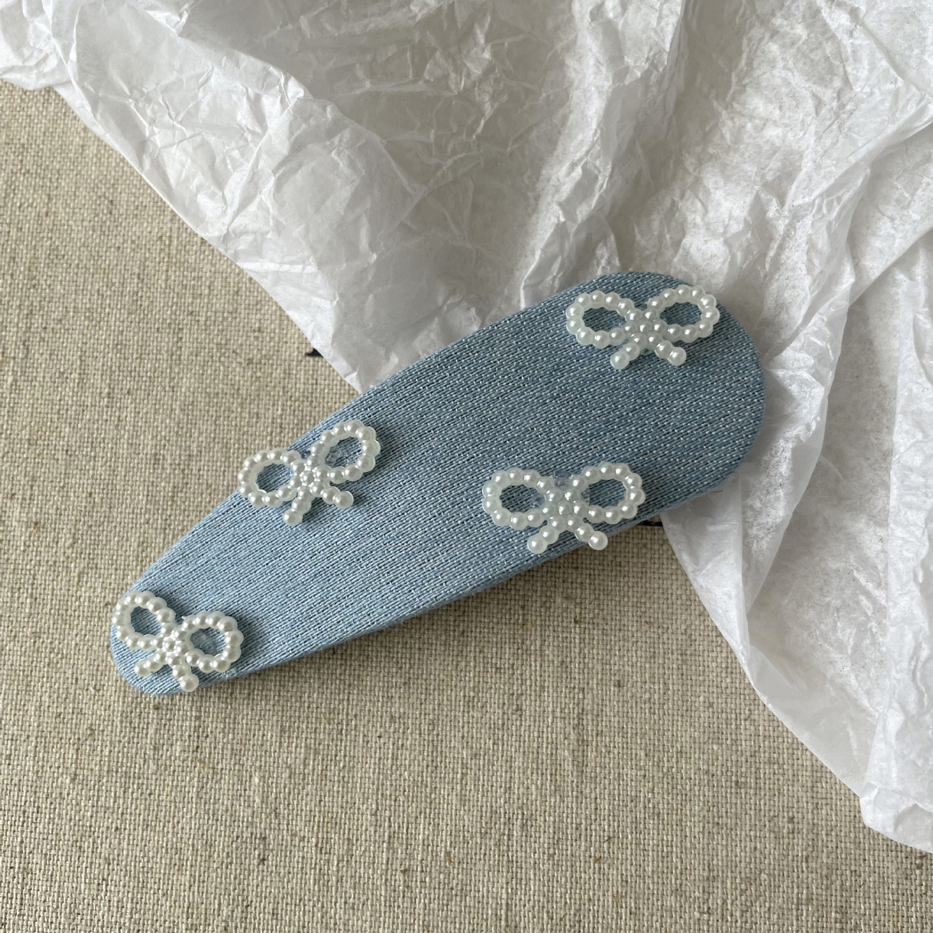 蓝色牛仔仿珍珠蝴蝶结发夹甜美可爱布艺侧边刘海掰掰夹发饰头饰女